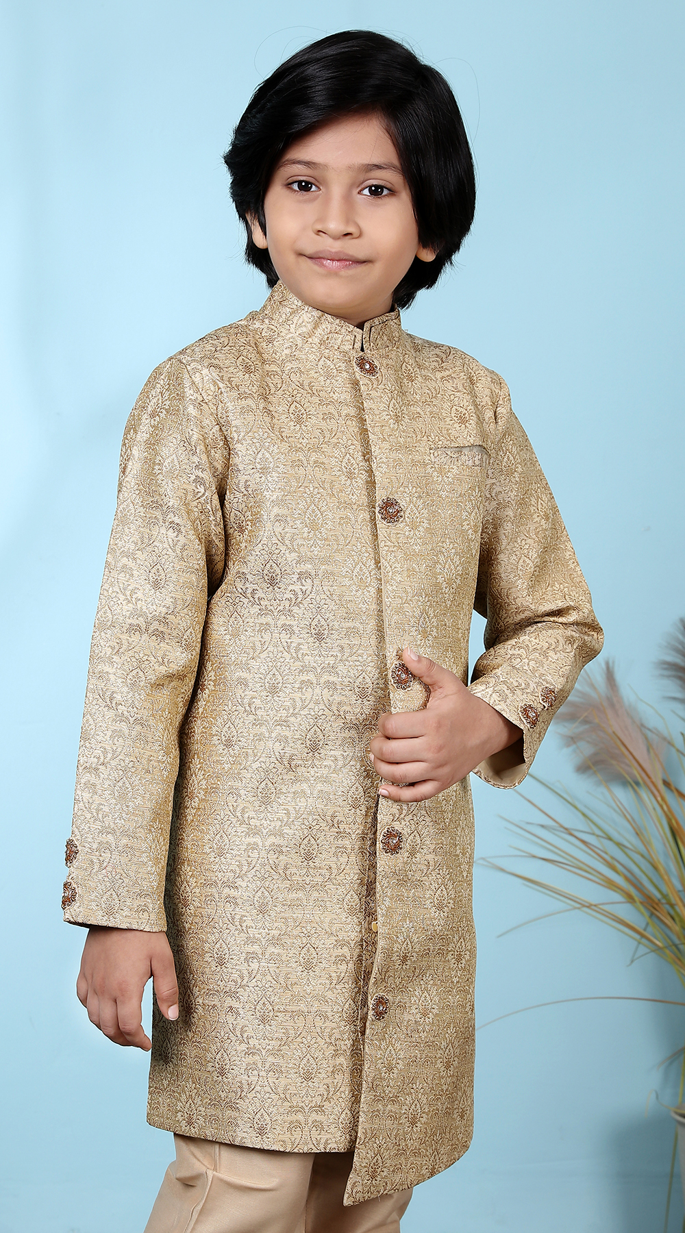 Beige Jacquard Sherwani Jacket with contrast pocket-detailing and buttons.