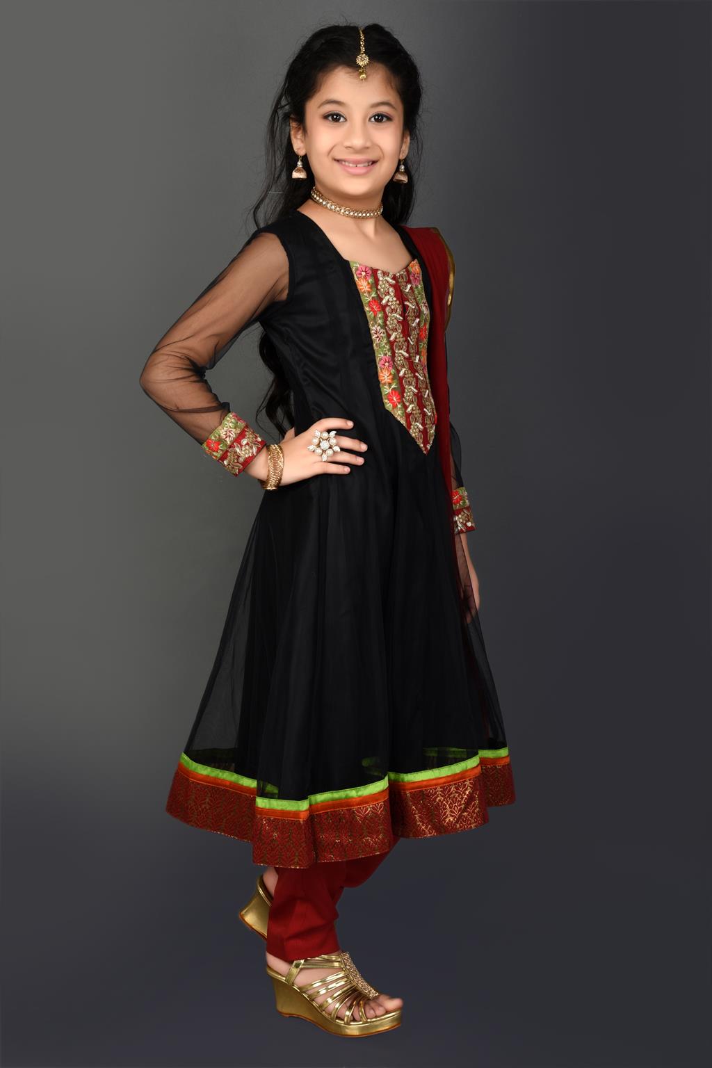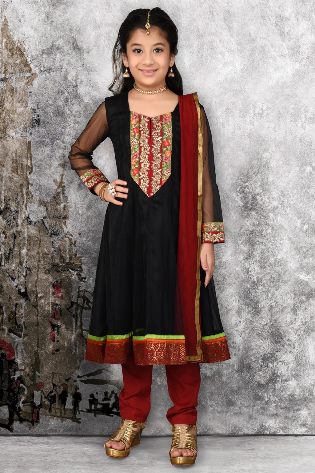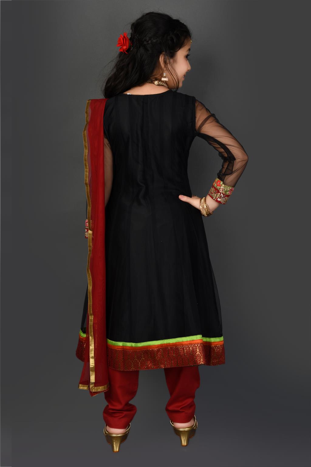 Nikhaar Creations Kids Black Anarkali Kurta with embroidered detailing on neck and sleeves and brocade embellishment on hemline. Moreover, Paired with Maroon Cigarette Pants and Maroon Net Dupatta with lace detailing.