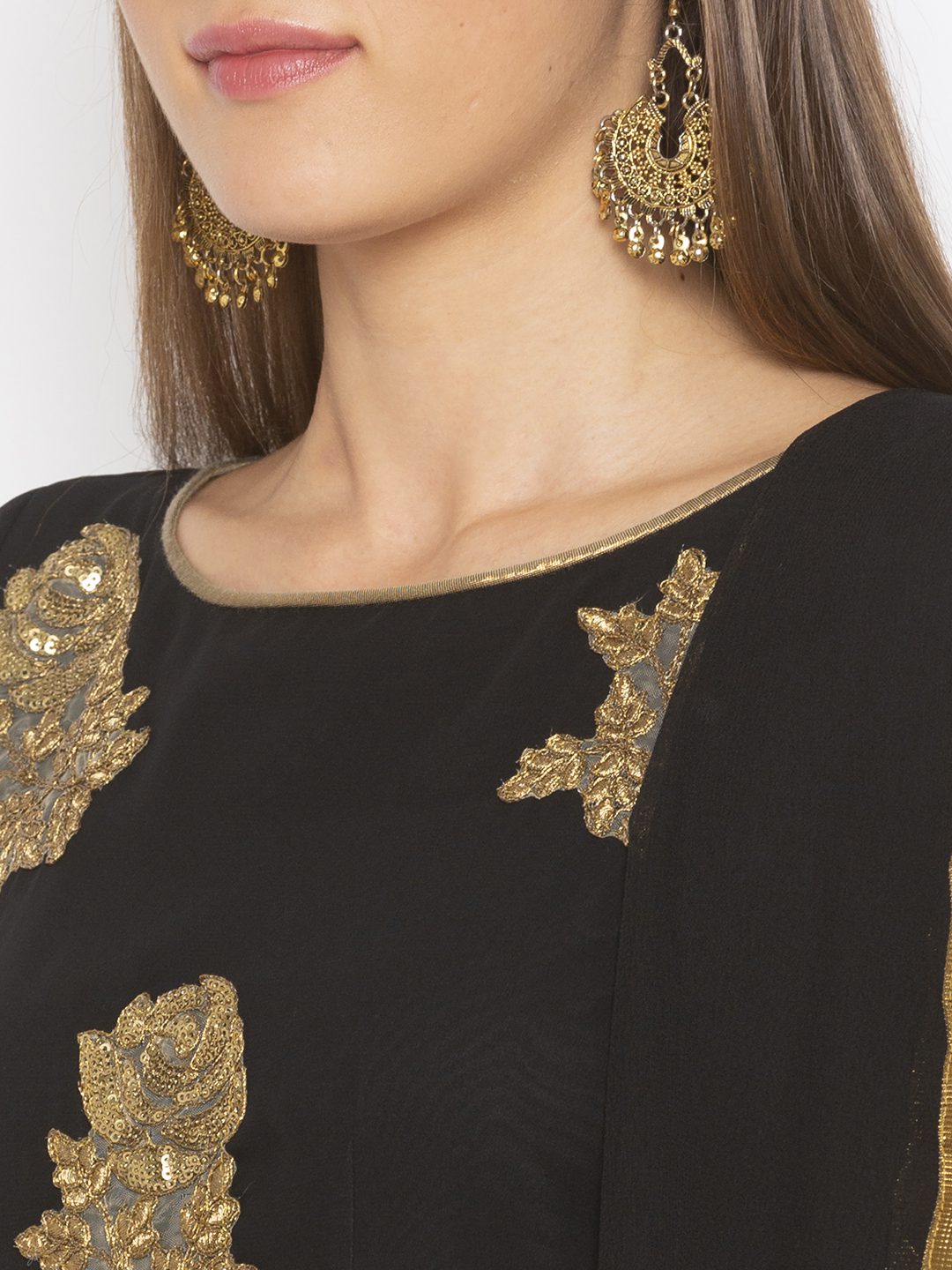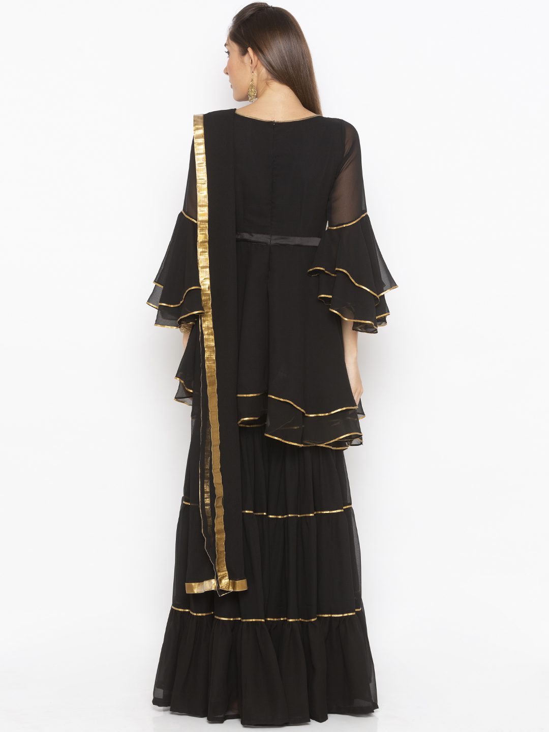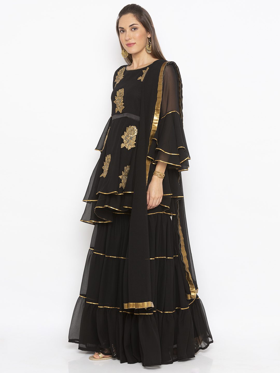 Black Georgette peplum two layered short kurta with three quarter double layered Bell sleeves embellished with gold embroidered motifs with gold Gota Patti on sleeves and Hem edges worn with black Georgette tired Sharara with good Gota Patti and black chiffon Dupatta with gold borders on it