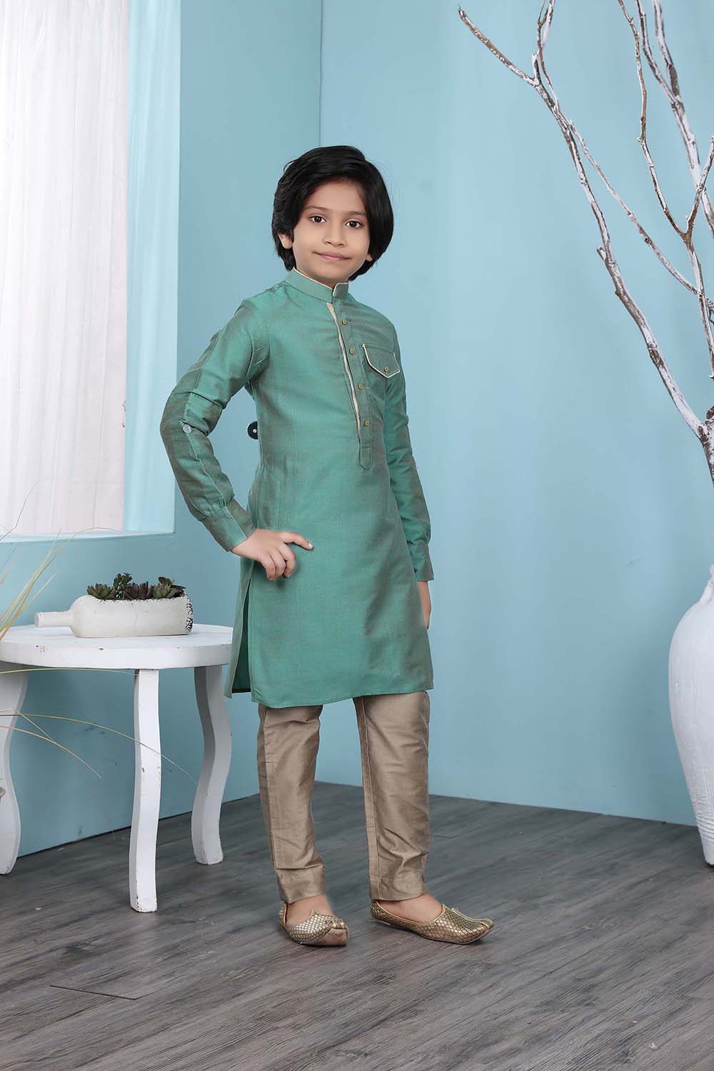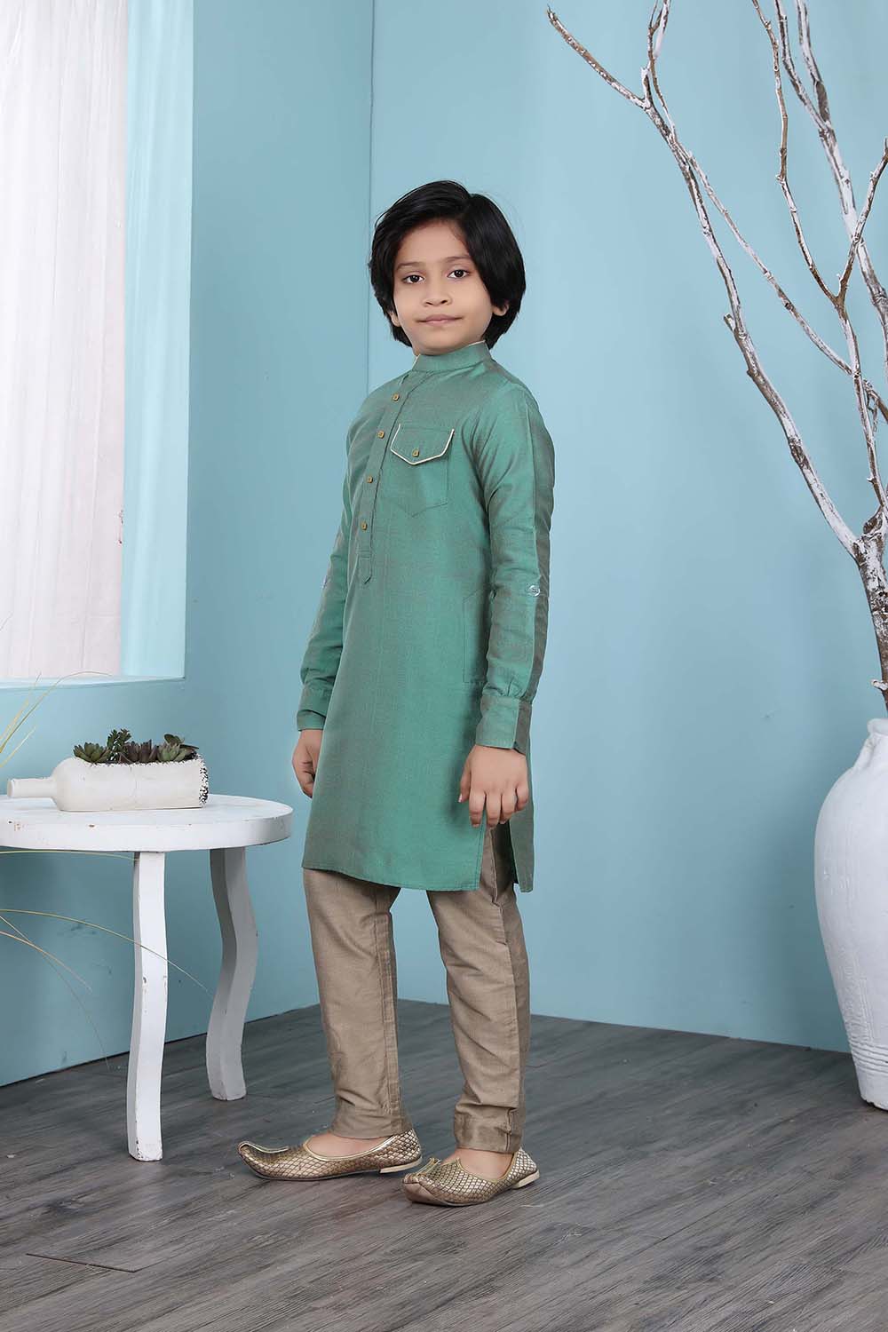 Green Cotton Silk Straight Cut Kurta Trouser For Boys