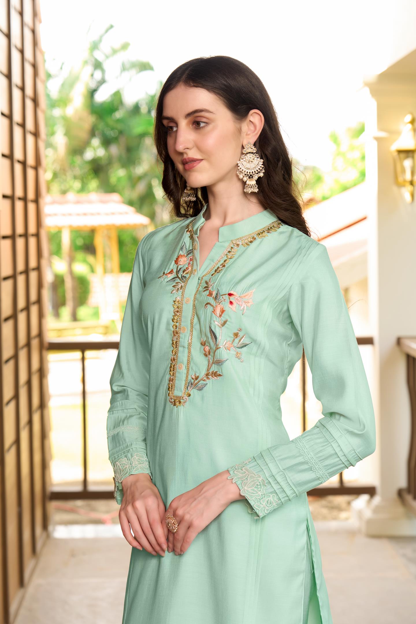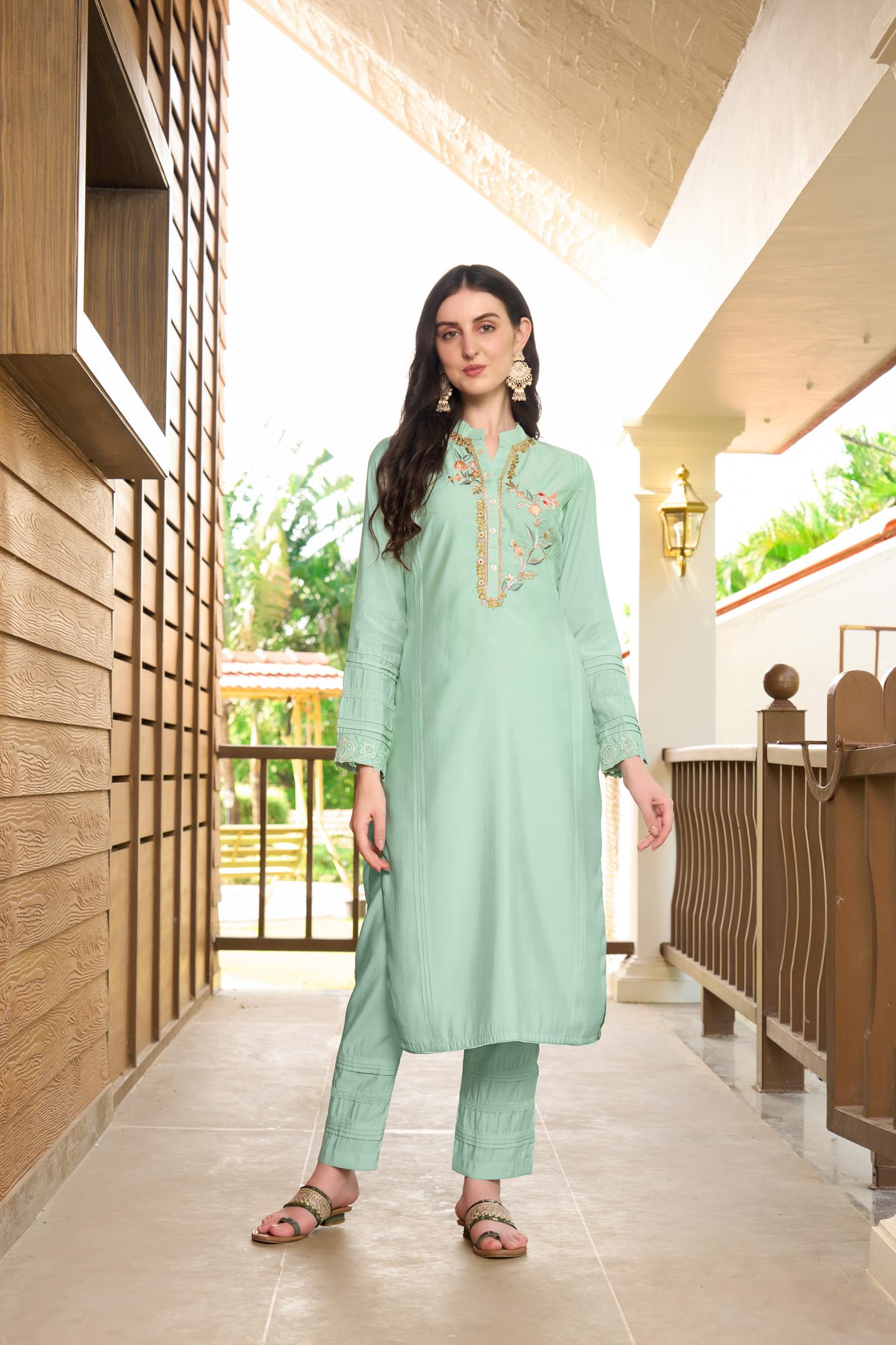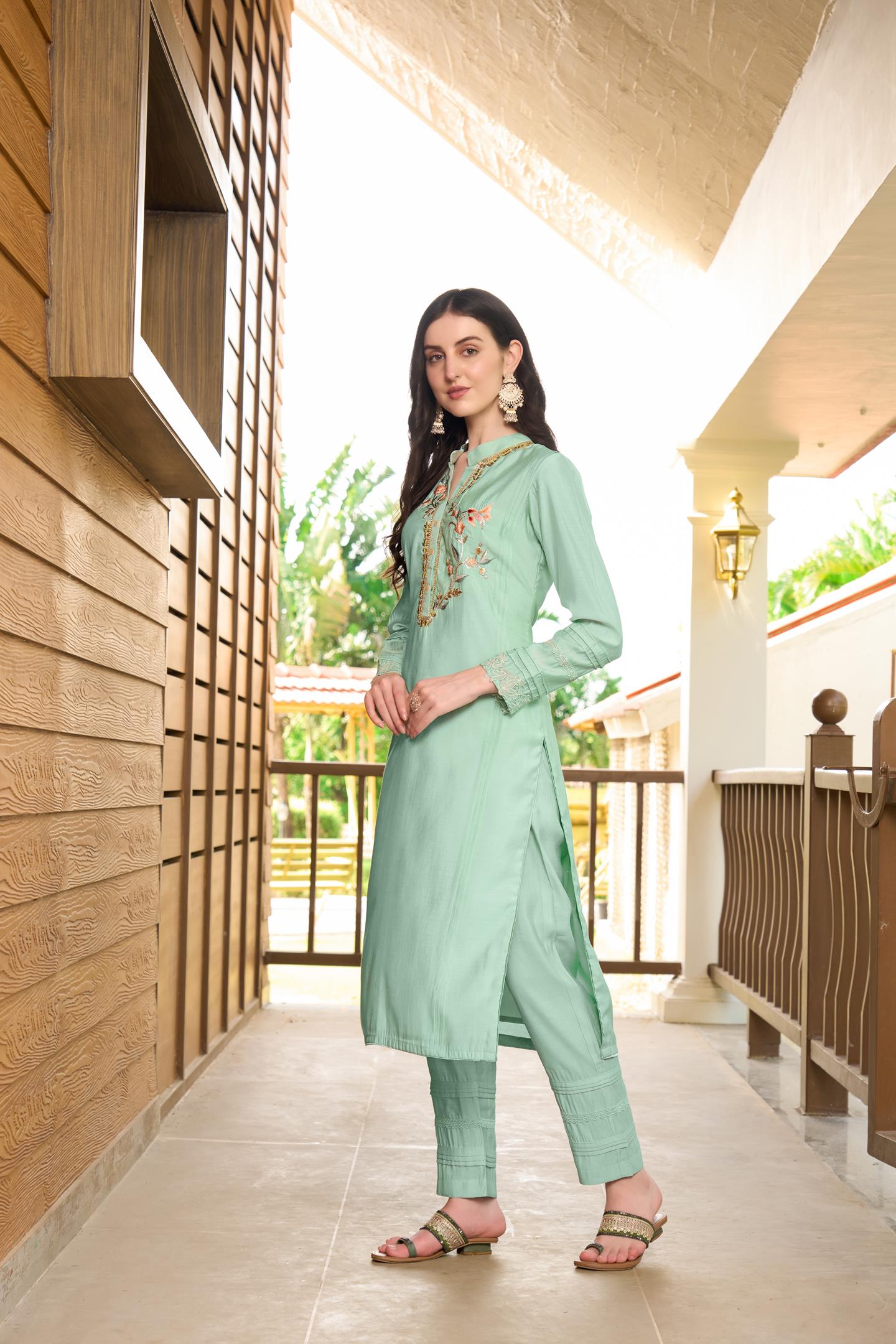 A Light Green exquisite ensemble featuring a delicate blend of art silk shirt, machine embroidery of resham on neck with detailing on cuff.