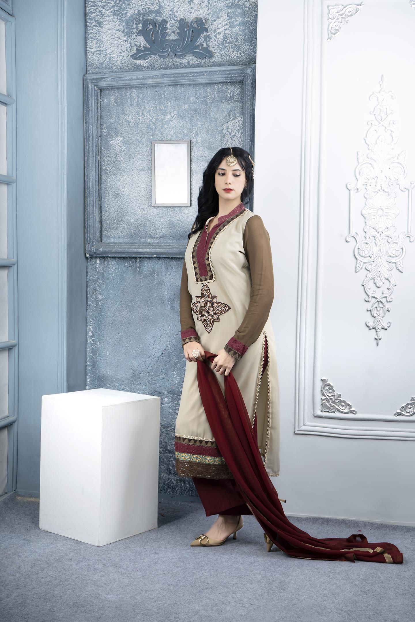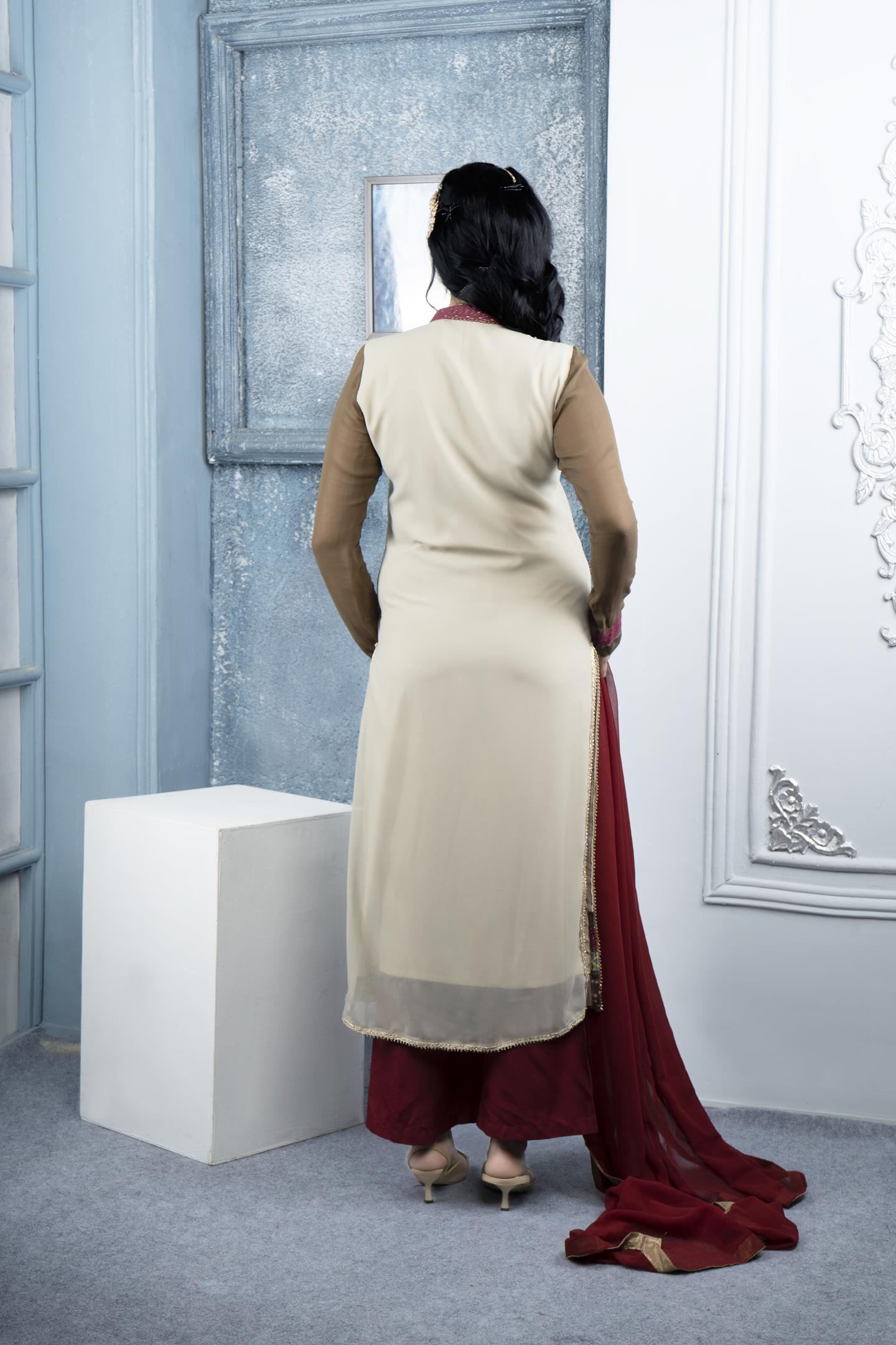 Beige Georgette Straight Cut Kurta With Contrast Brown Full Sleeves, Crochet Lace/ Block Print/ Gota Patti Embroidered Detailing On Yoke, Sleeves, Hemline And Side Slits. Resham And Swarovski Embroidered Motif Below Neckline. Worn With Maroon Q-Lots And Maroon Chiffon Dupatta With Antique Gold Tissue Border On All 4 Sides.