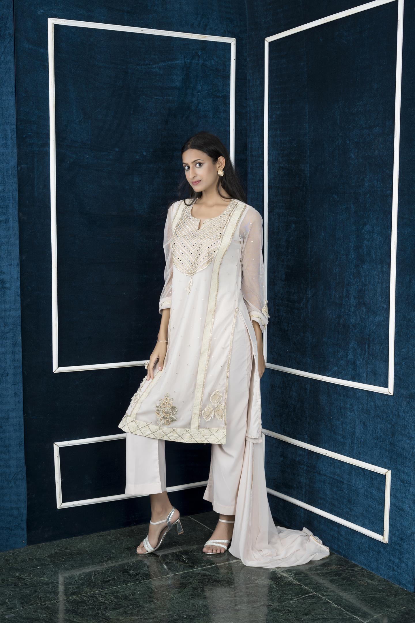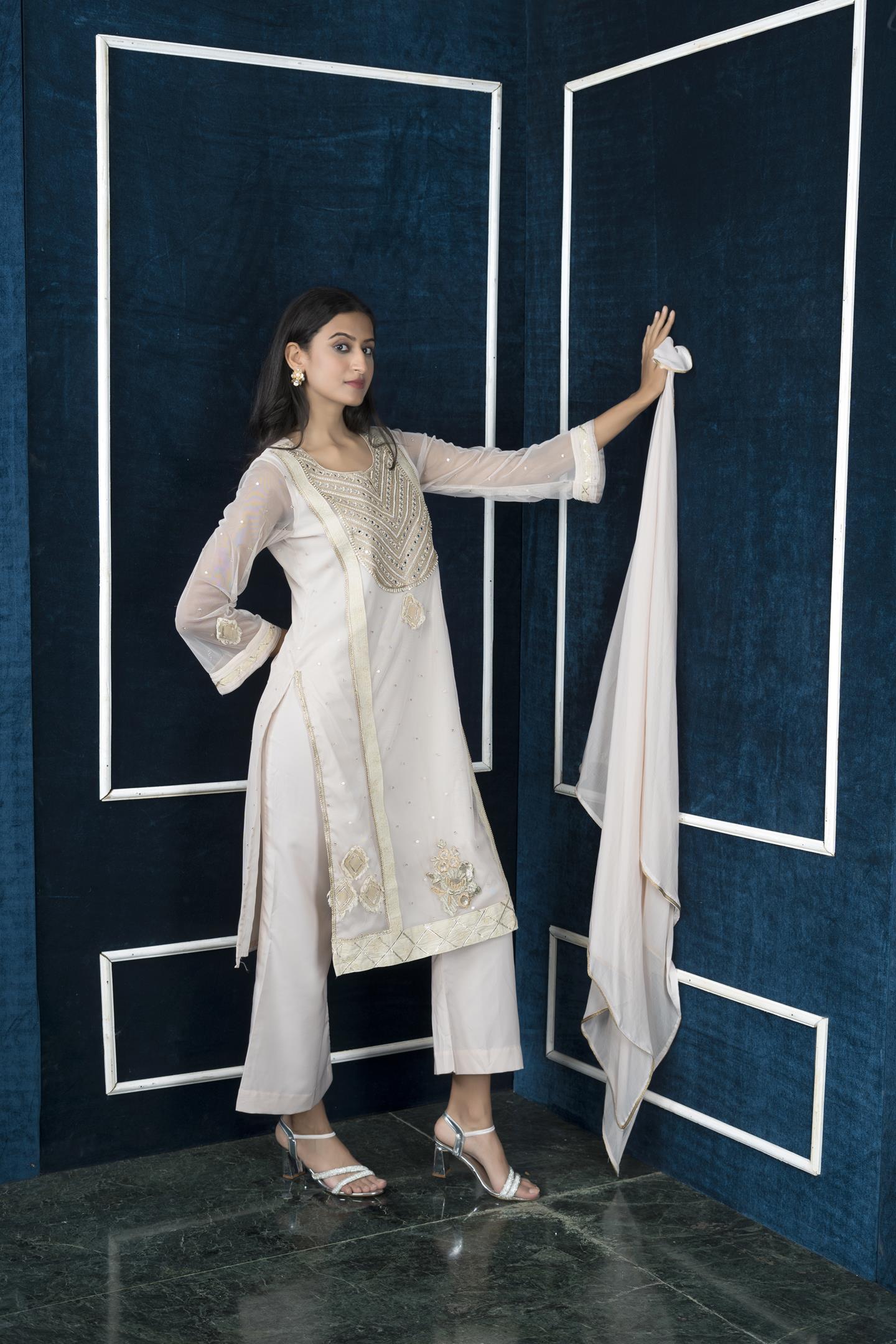 Nikhaar Beige Embroidered Net Stitched Palazzo Kurta Dupatta Readymade Suits