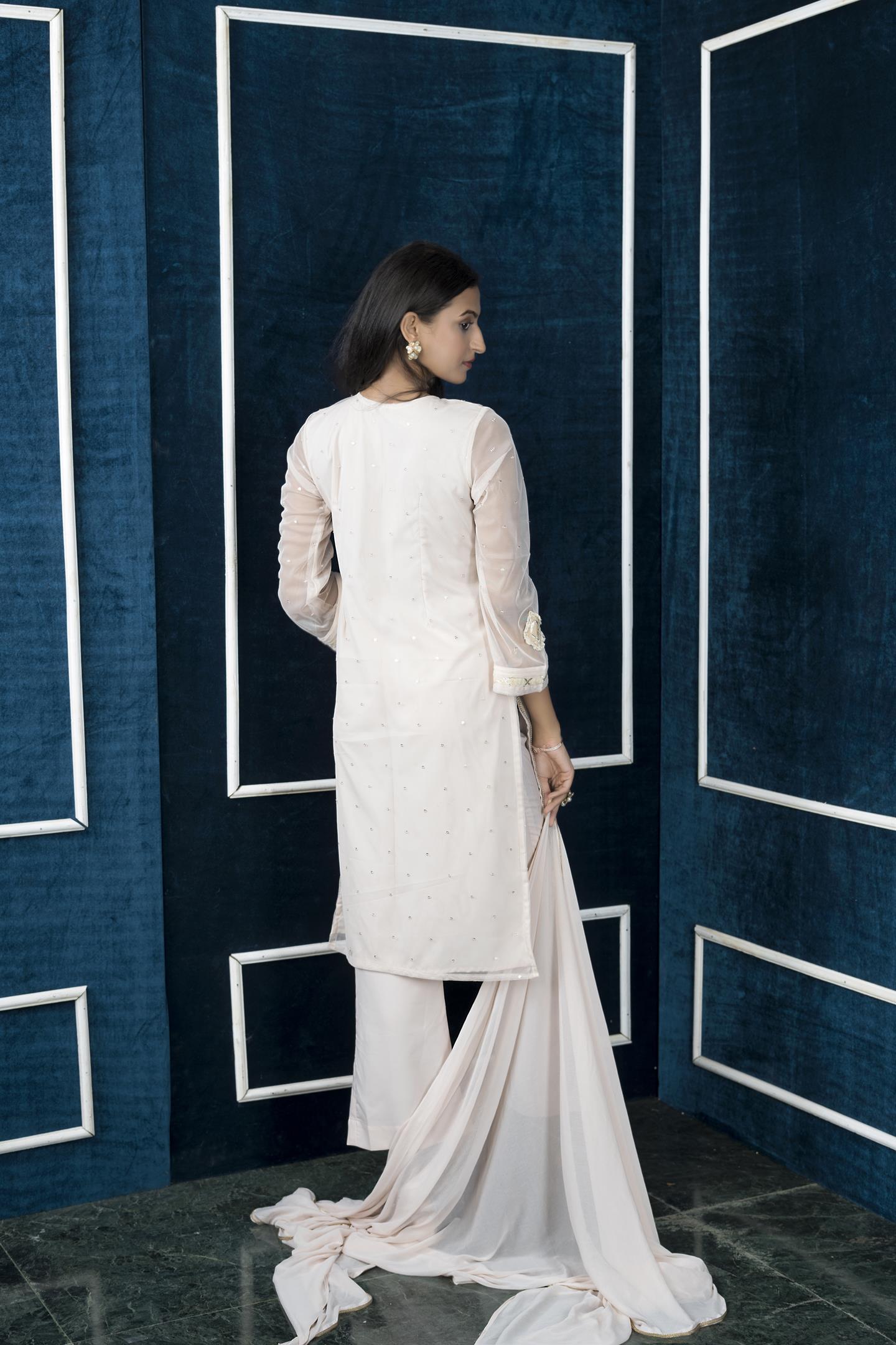 Beige Sequence Embroidered Net Straight Cut Kurta With Pleats Detailing On Semi-Bell Full Sleeves. Hakoba Detailing With Gold Zari Stitches And Gota Patti On Front Panel, Hemline And Sleeves Edge, Hand Embroidered Mirror And Beadwork Neckline With Motifs On Neck, Sleeves And Hemline, Lace Detailing On Front Panel And Side Slits. Worn With Beige Q-Lots And Beige Chiffon Dupatta With Gold Borders On All 4 Sides.