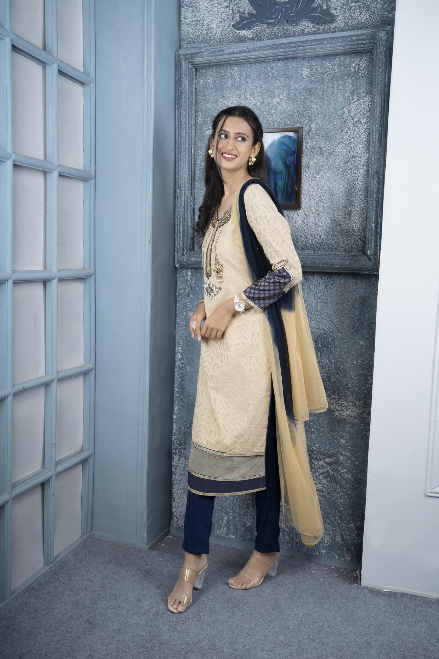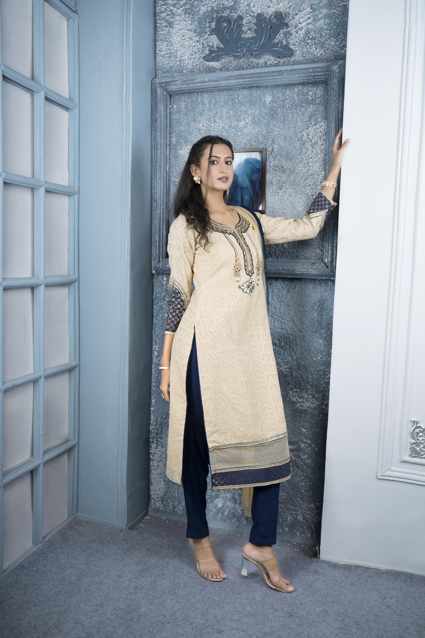 Beige Banaras Handloom Jacquard Silk Straight Cut Kurta With Contrast Brocade Detailing On 3/4 Sleeves And Hemline, Multi Colour Thread Double Stitching Detailing On Hemline , Hand Embroidered Swarovski And Zardozi Neckline With Gold And White Pearls In Encrusted With Gold Lace Detailing On Sleeves, Neckline And Hemline, Contrast Navy Blue Pencil Piping Backing On Side Slits To Give A Perfect Finished Look. Worn With Navy Blue Cigarette Pants And Navy Blue Beige Net Dupatta With Gold Crystals On It.