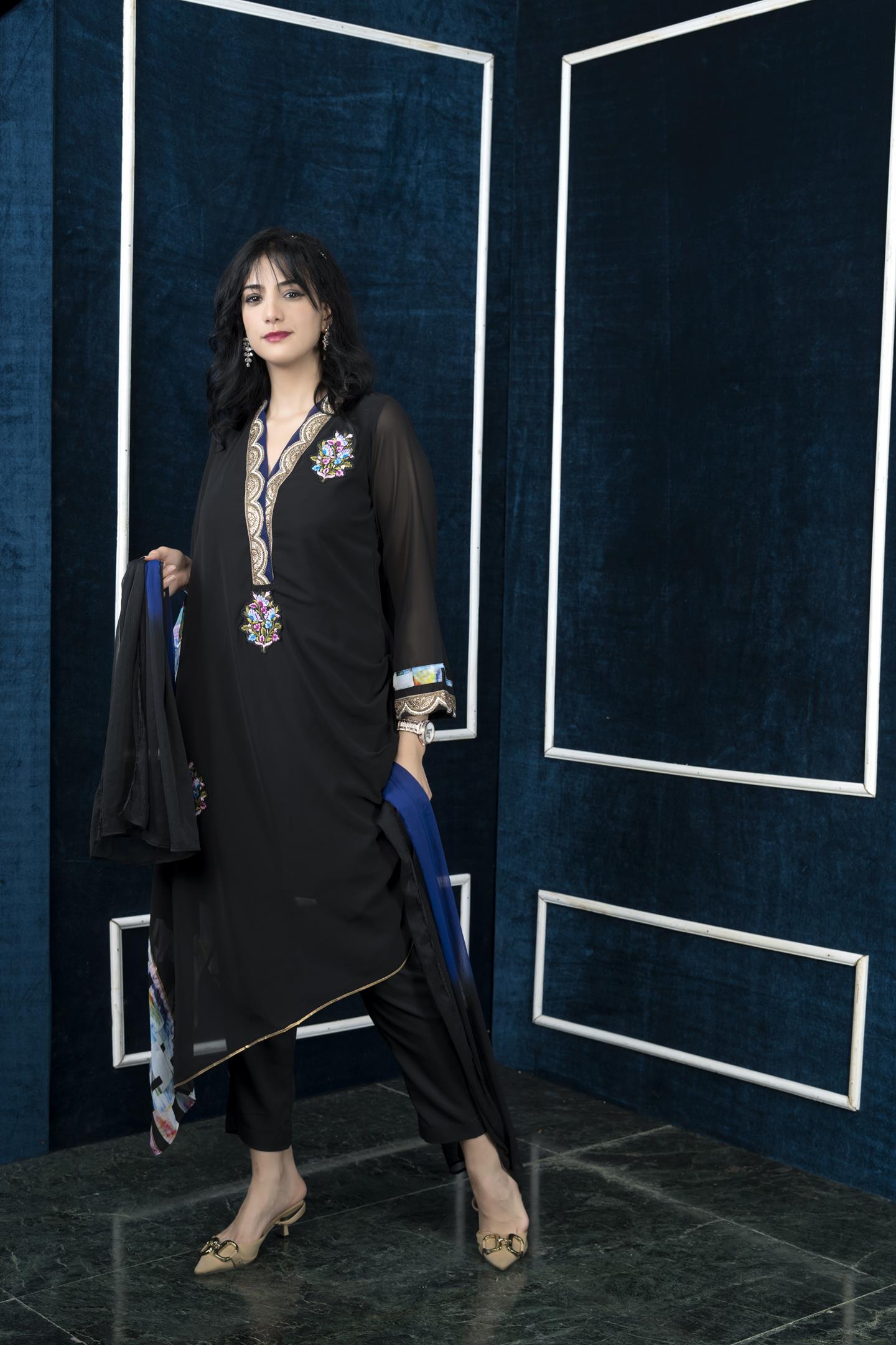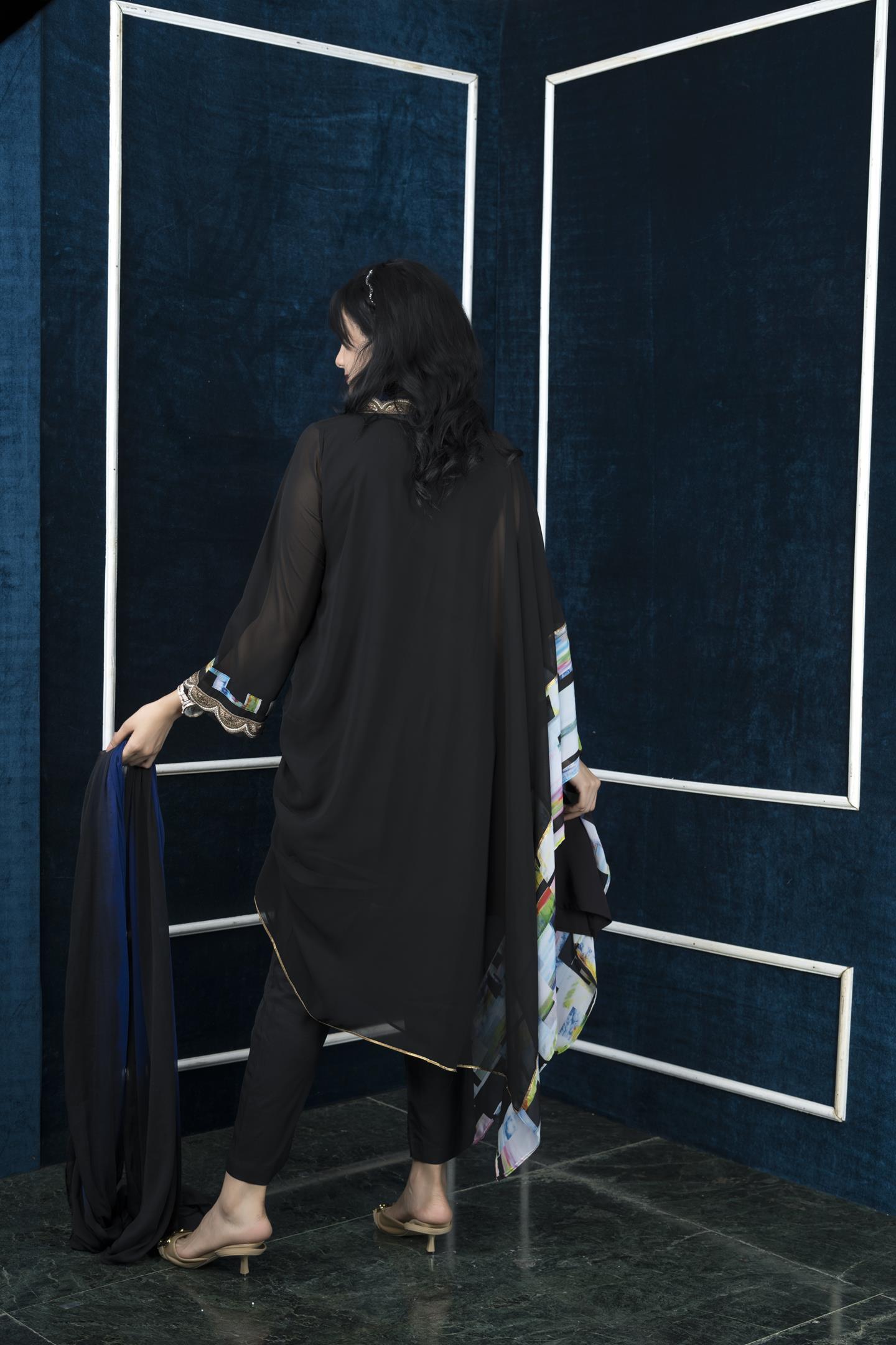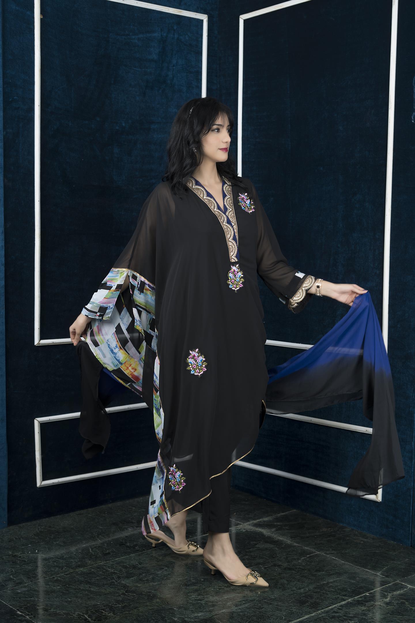 Black Georgette Asymmetrical Kaftan Kurta With Ruched Pleats Detailing On One Side, Digital Print Detailing On Kaftan And 3/4 Bell Sleeves Edge, Midnight Blue Georgette And Embroidered Detailing On Shawl Collar And Sleeves, Embroidered Silk Thread Motifs In Front And Gold Gota Detailing On Kaftan Edge And Hemline. Worn With Black Cigarette Pants And Black Blue Shaded Chiffon Dupatta.