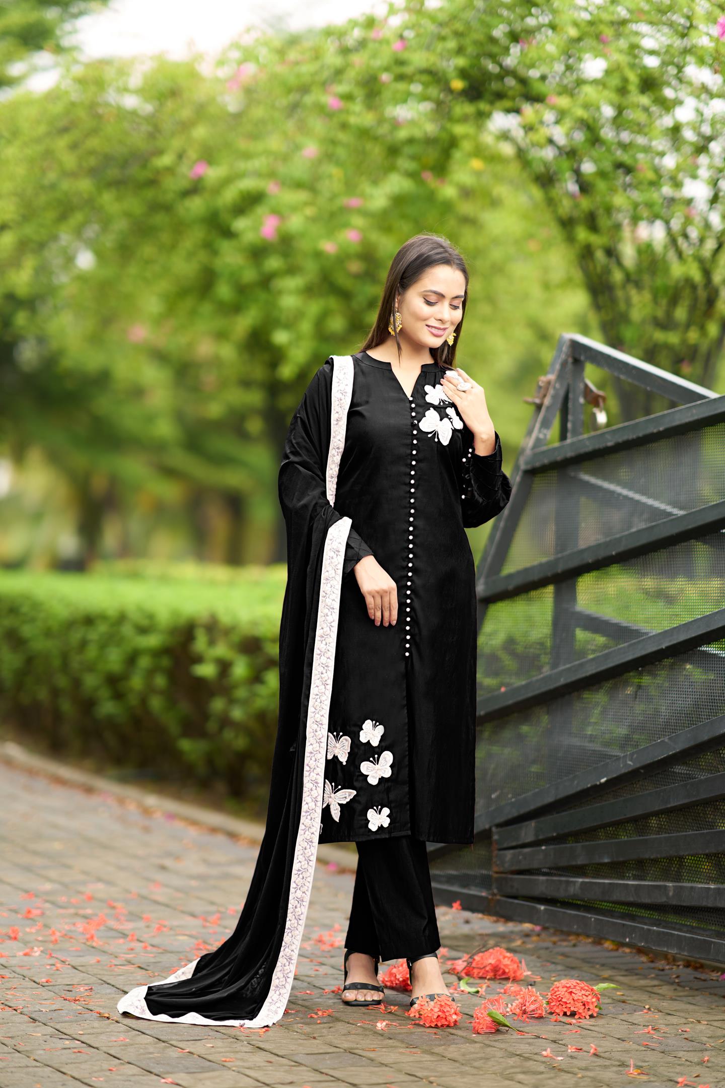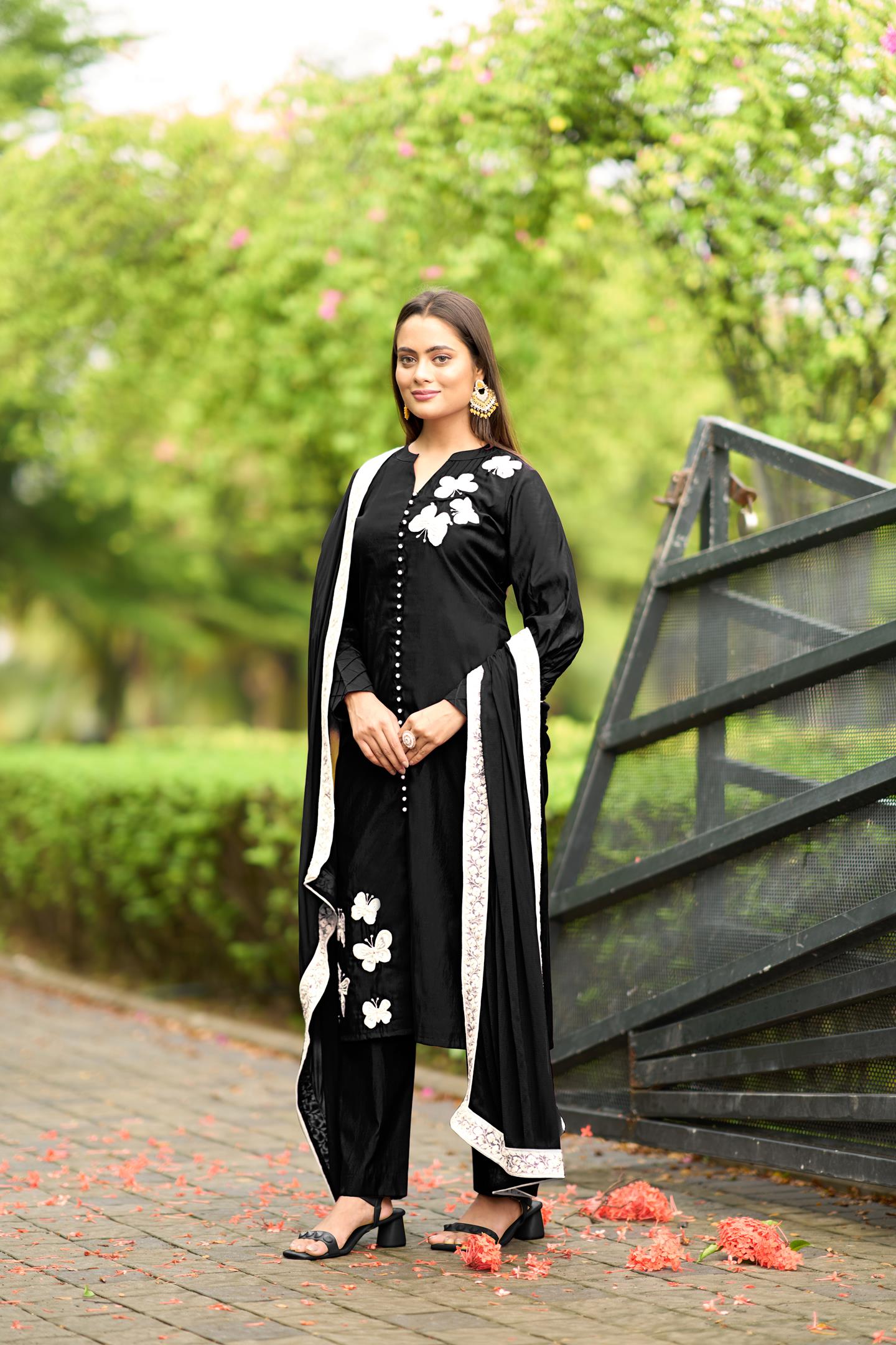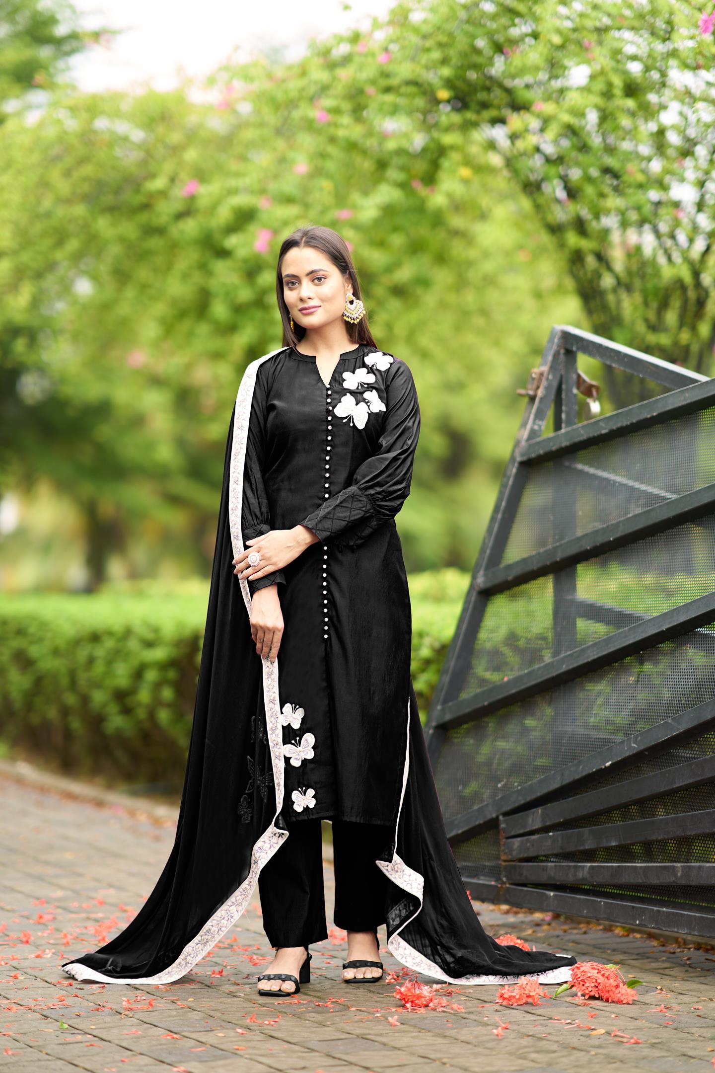 Nikhaar Black Hand Embroidery Art Silk Stitched Straight Cut Trouser Kurta Dupatta Readymade Suits