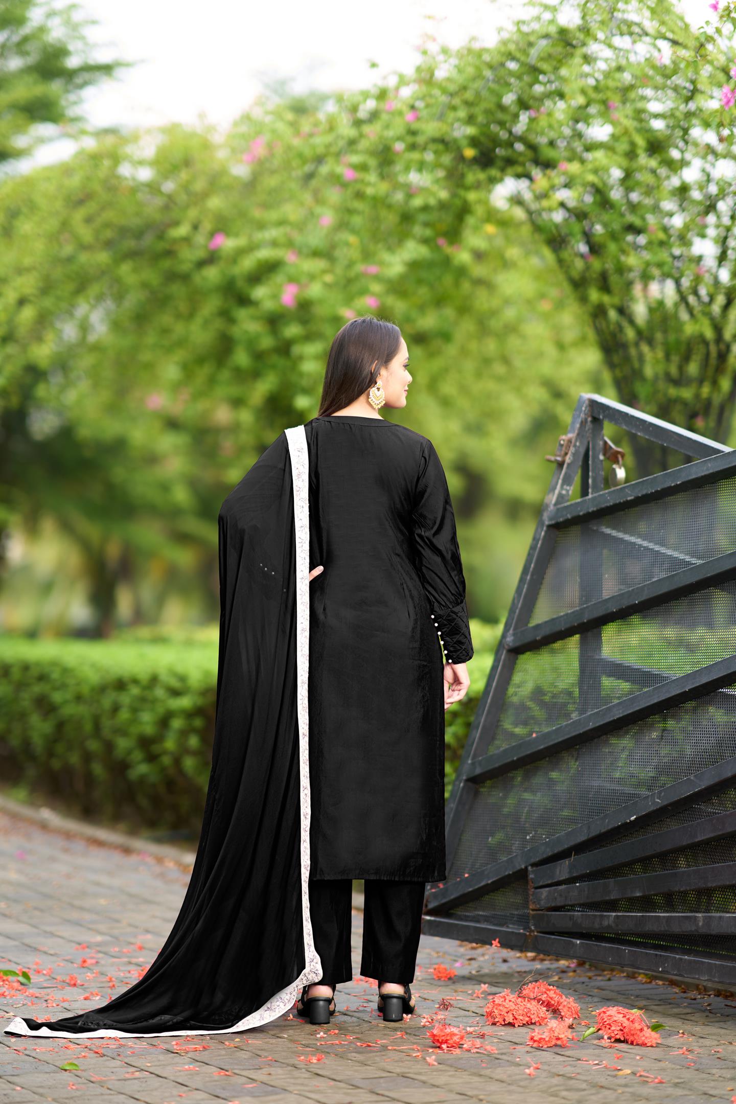 Black Art Silk Straight Kurta with machine work embroidery detailing along with pearl and hand work embellishments. Paired with Art Silk Cigarette Pants and Chiffon Dupatta with Lace Border on all sides.