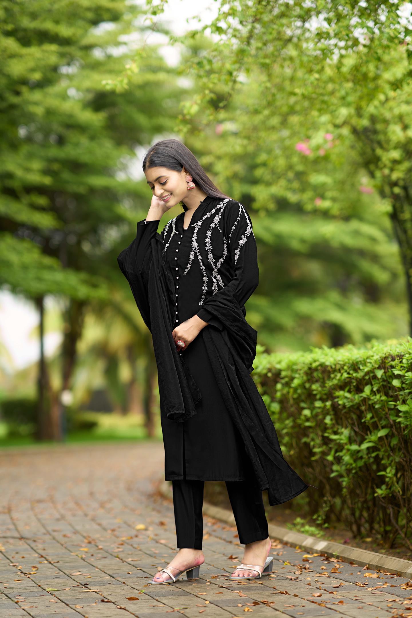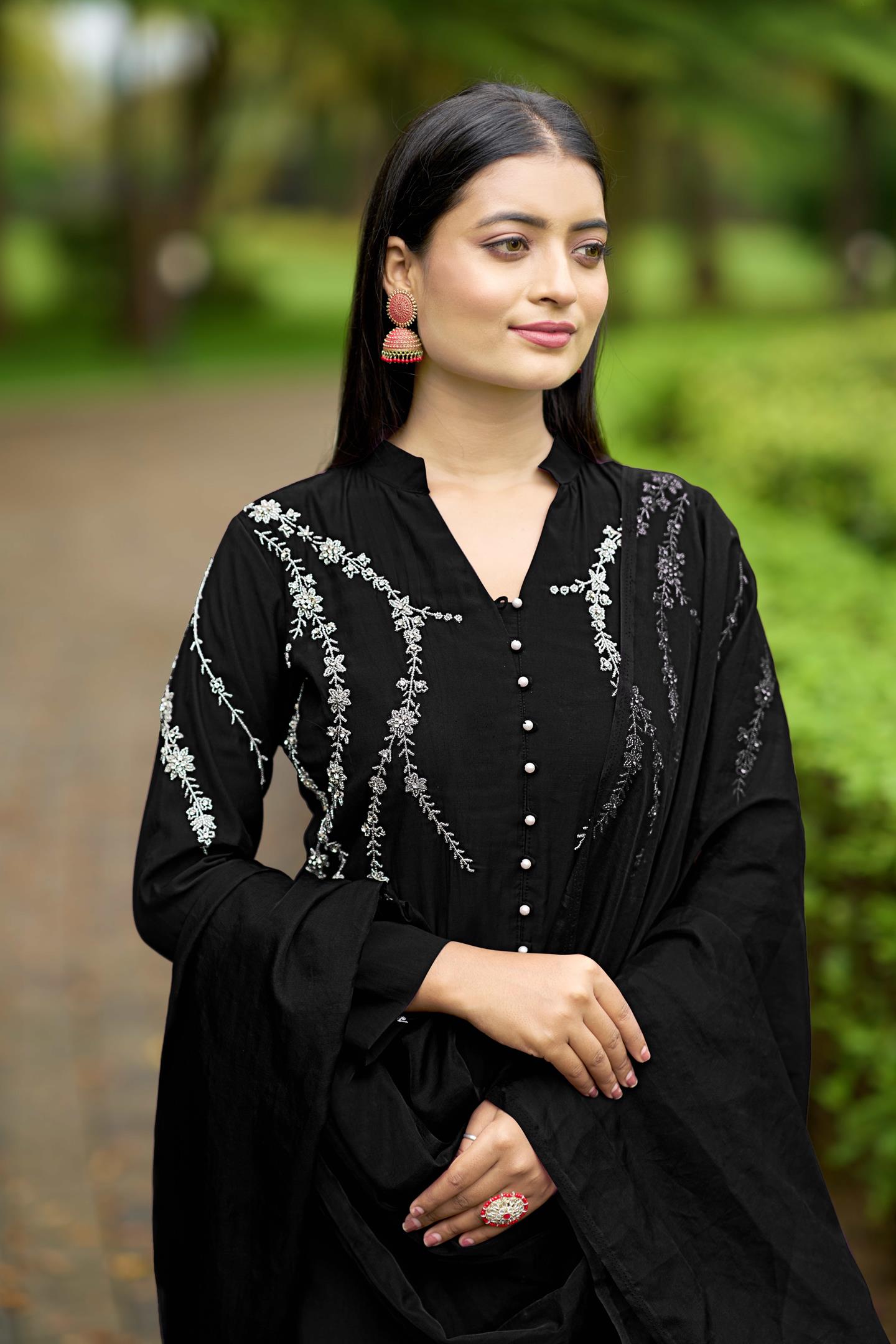 Nikhaar Black Hand Embroidery Art Silk Stitched Straight Cut Trouser Kurta Dupatta Readymade Suits