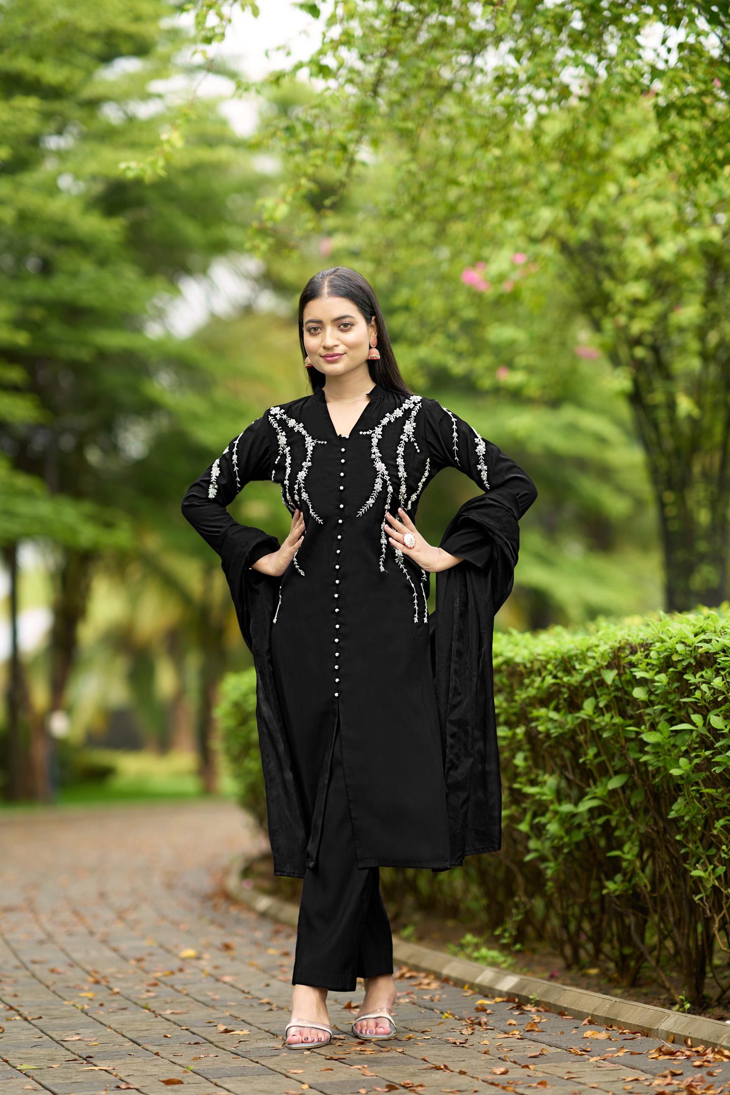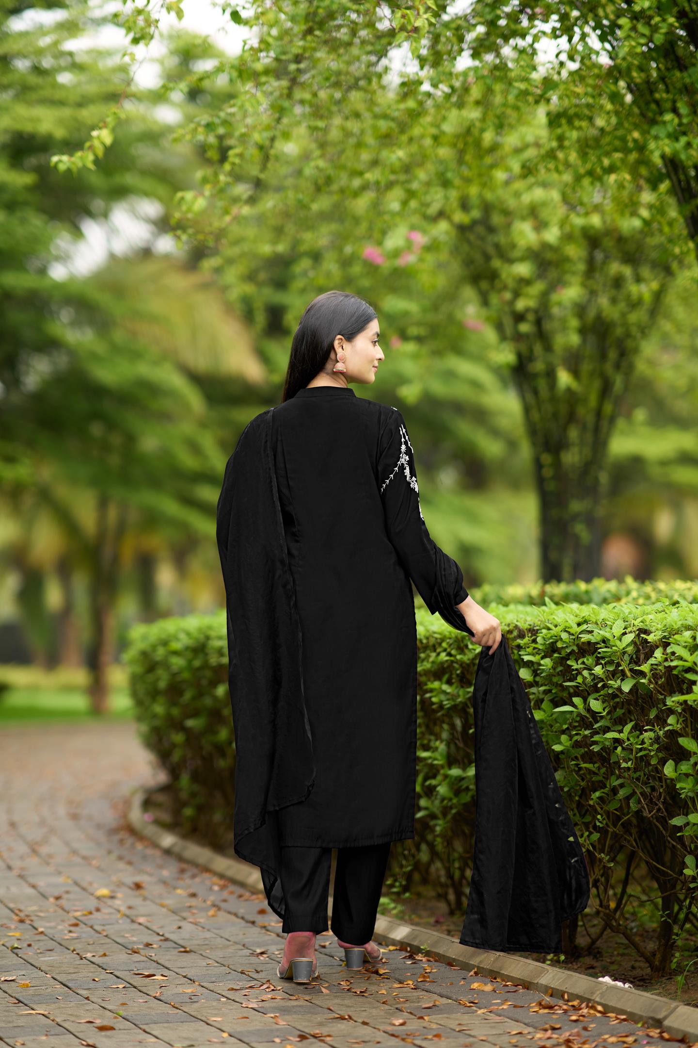 Black Art Silk Straight Kurta with Beads and Crystal Hand Work Embroidery detailing. Worn with Art Silk Cigarette Pants and Organza Dupatta.