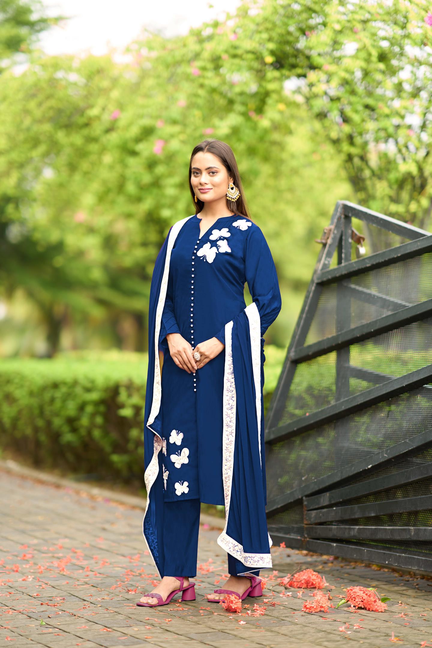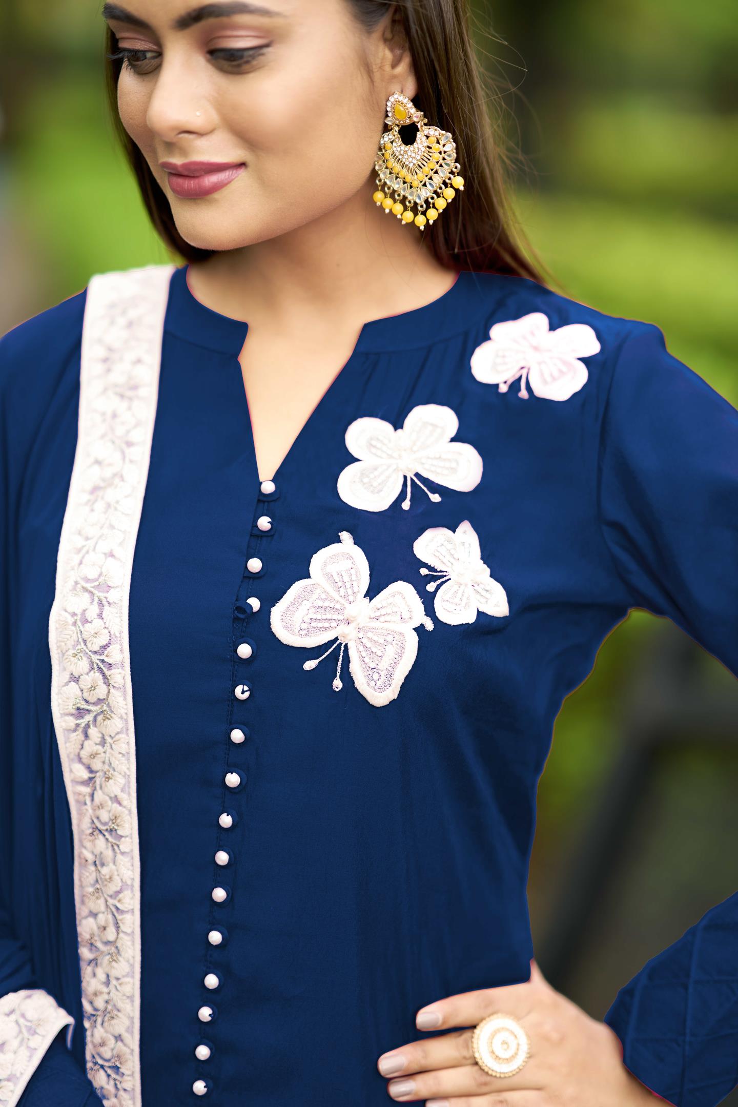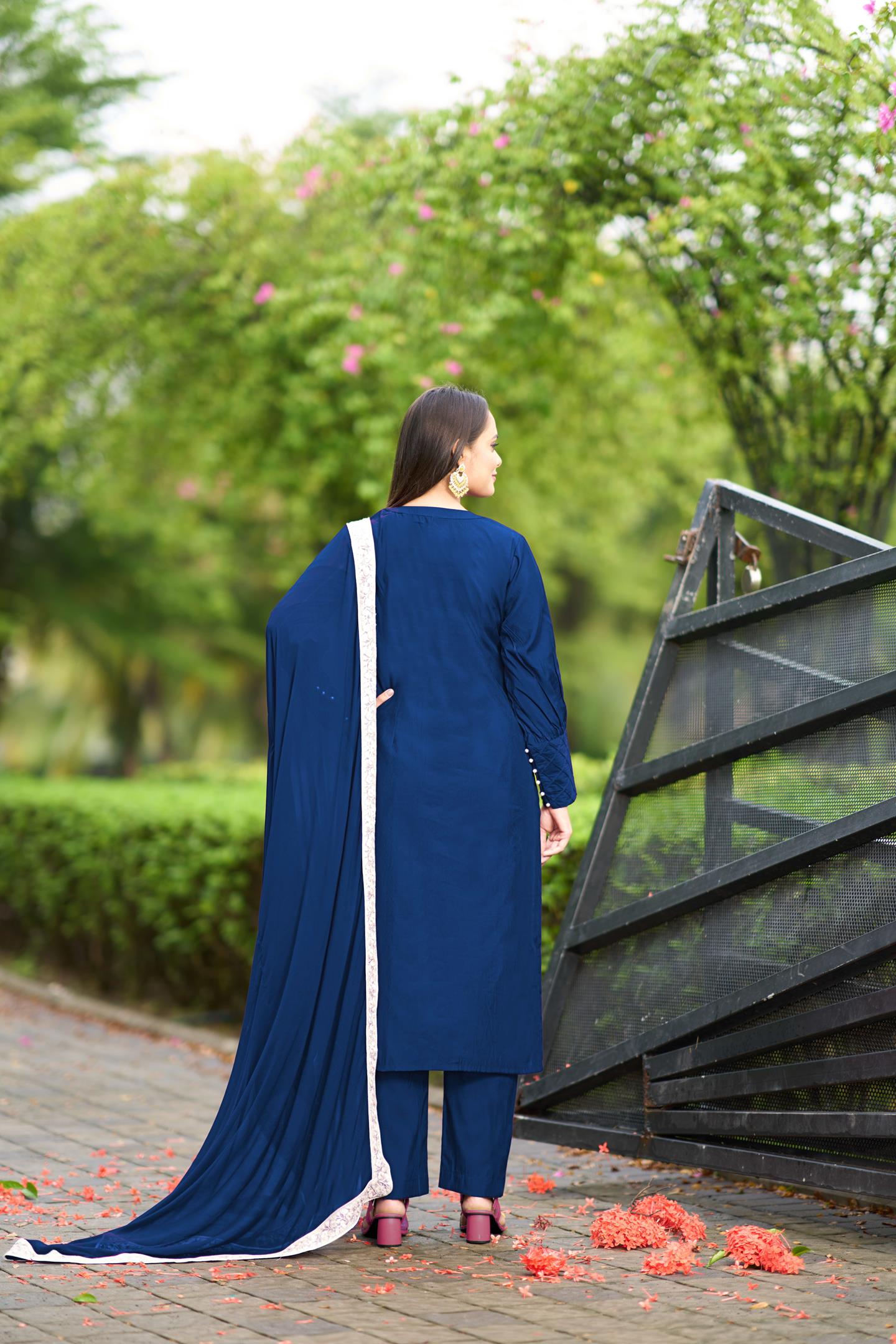 Nikhaar Blue Hand Embroidery Art Silk Stitched Straight Cut Trouser Kurta Dupatta Readymade Suits