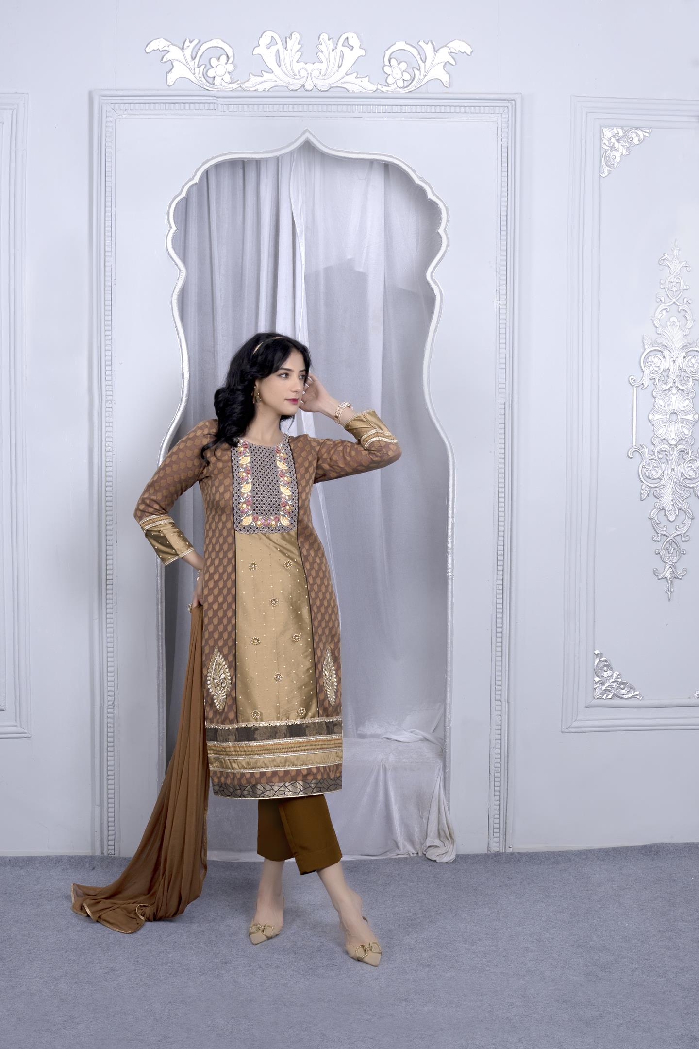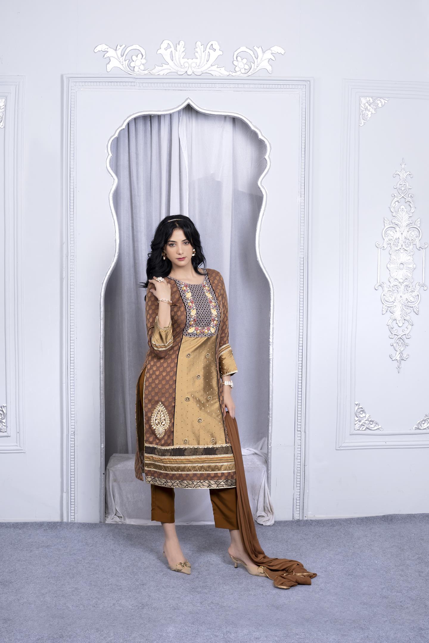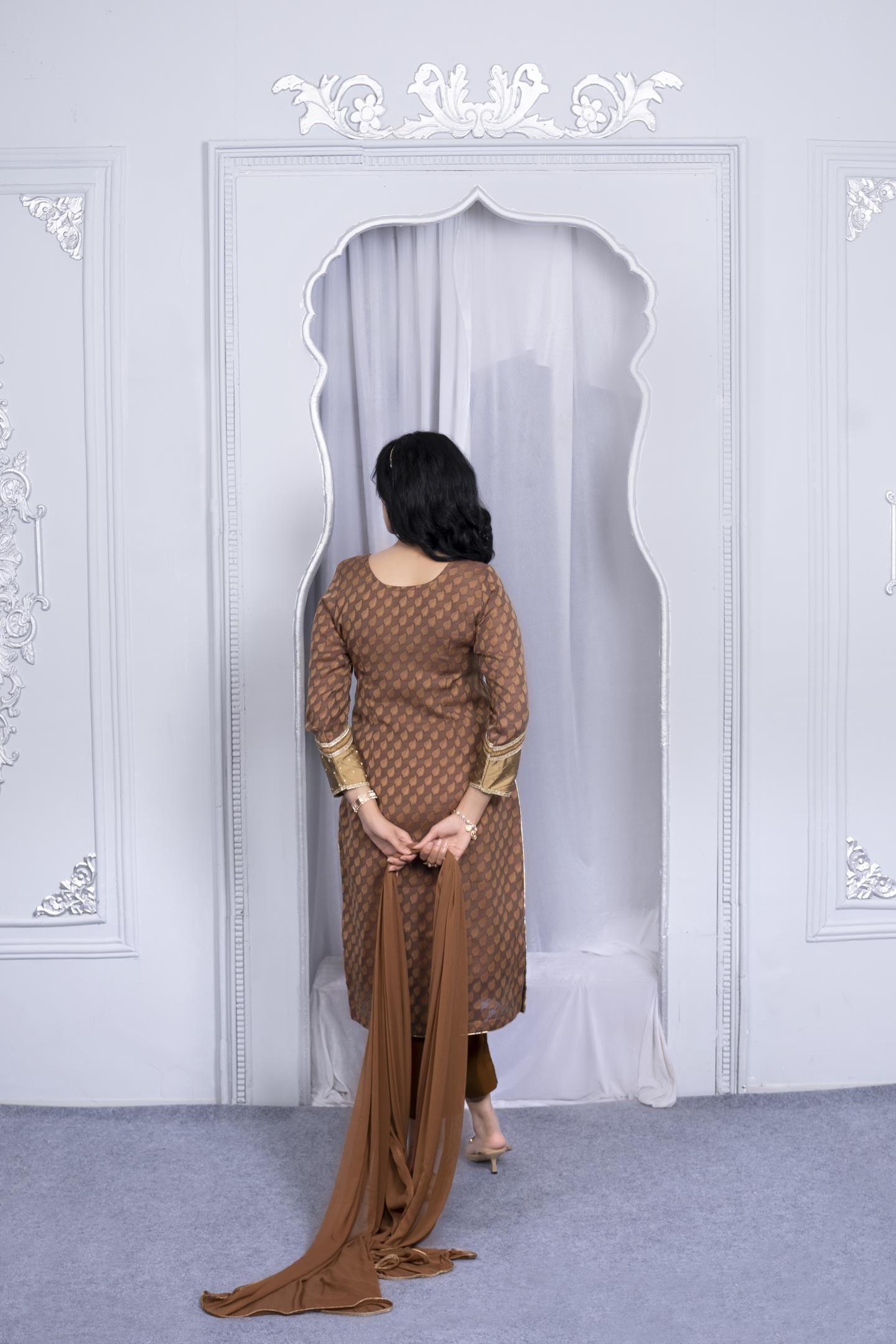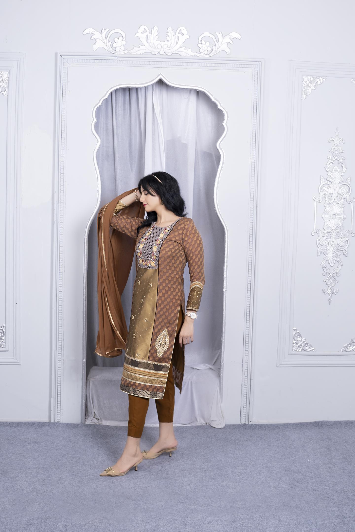 Brown And Mehndi Banaras Handloom Jacquard Silk Straight Cut Kurta With Resham Embroidered Neckline, Hand Embroidered Front Panel With Motifs On Hemline, With Mirror, Zari And Banaras Brocade Borders Detailing In Hemline And Full Sleeves Edge. Worn With Brown Cigarette Pants And Brown Chiffon Dupatta With Gold Borders On All 4 Sides.