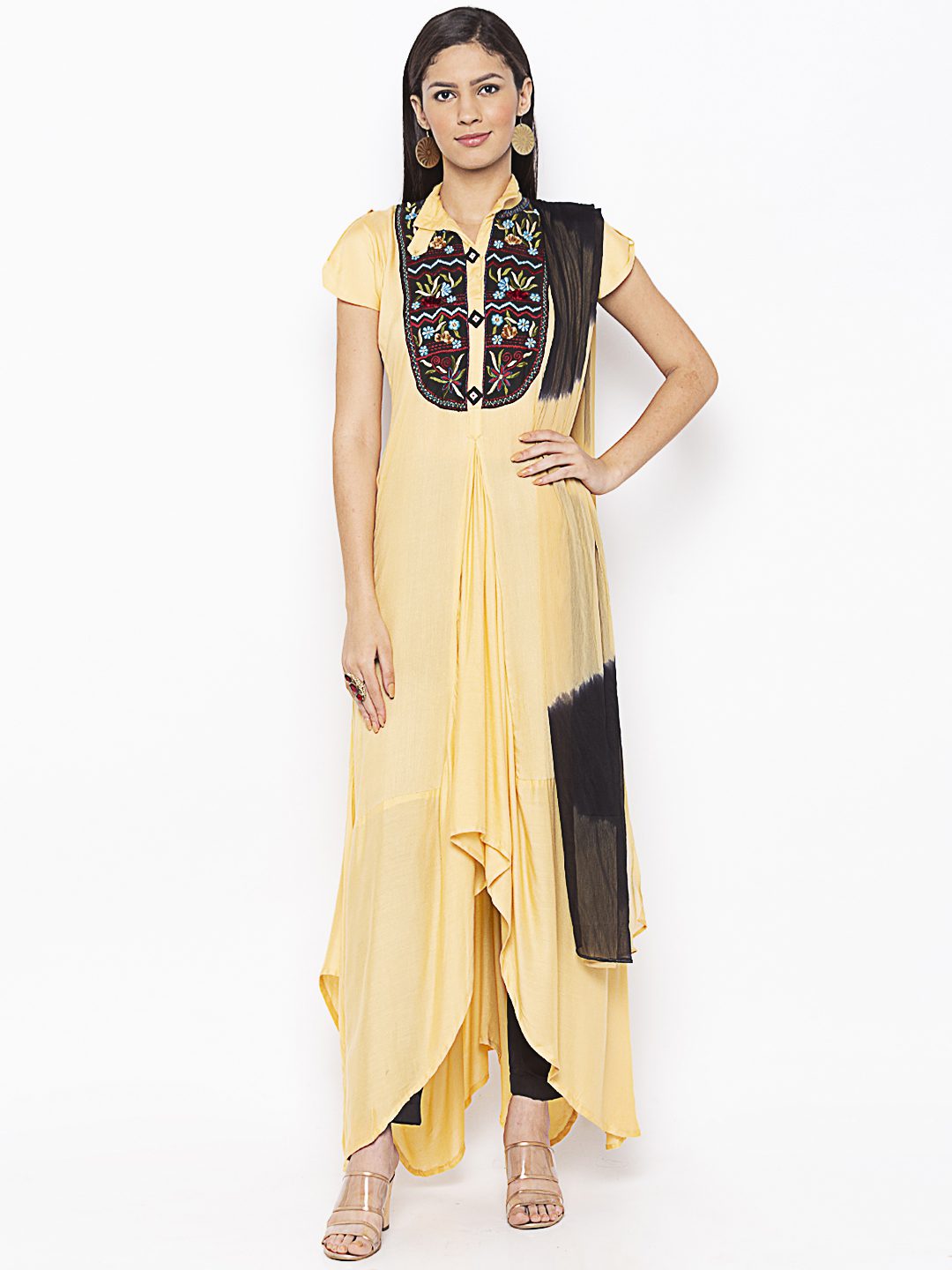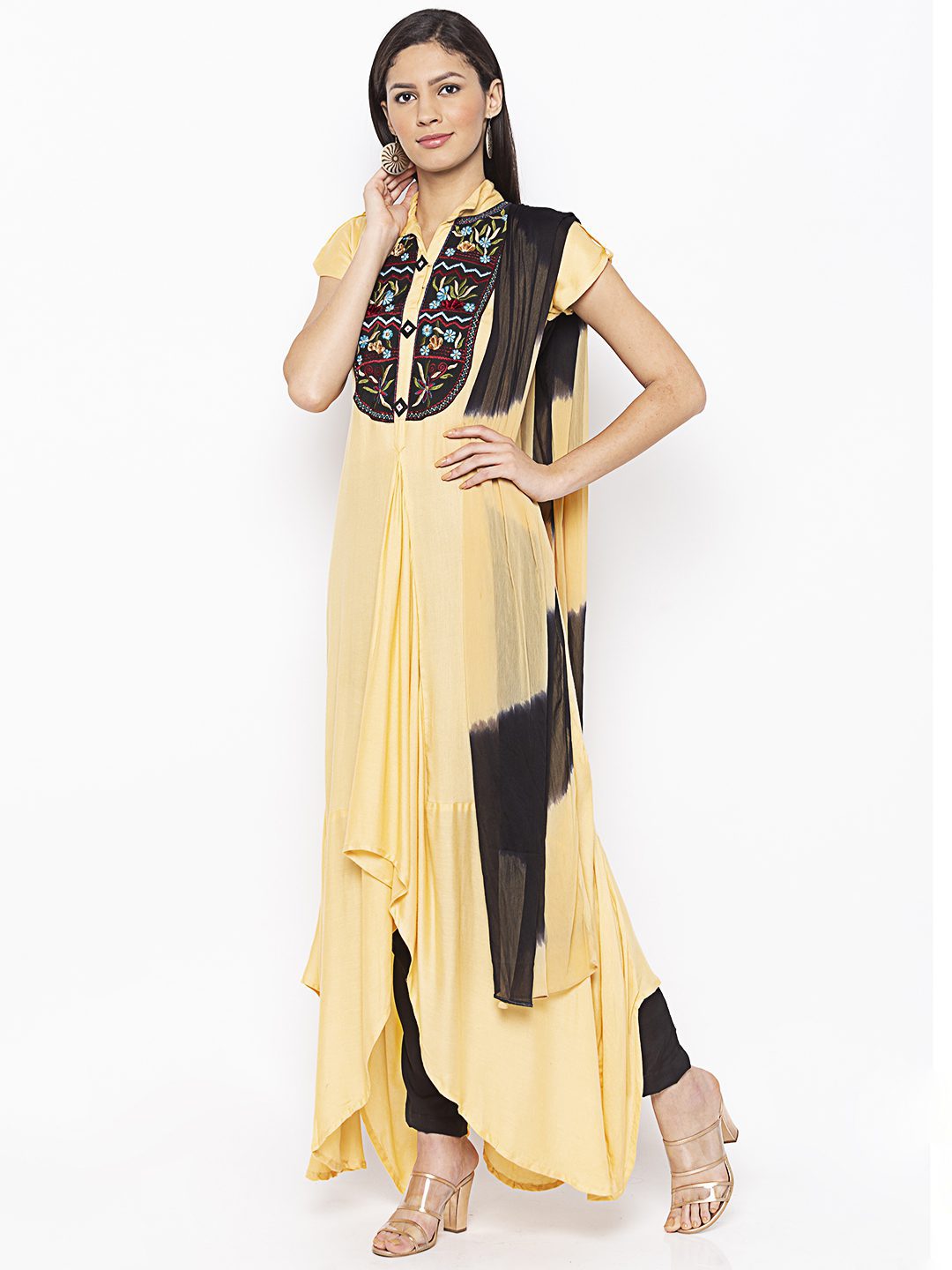 Beige Rayon Cotton Asymmetrical Draped Kurta Short Sleeves ..Collar Detail With Black Georgette Upper Body On Back Portion… Multi Colour Thread Embroidery Around Yoke Worn With Black Cigarette Pants And Beige Black Shaded Chiffon Dupatta.