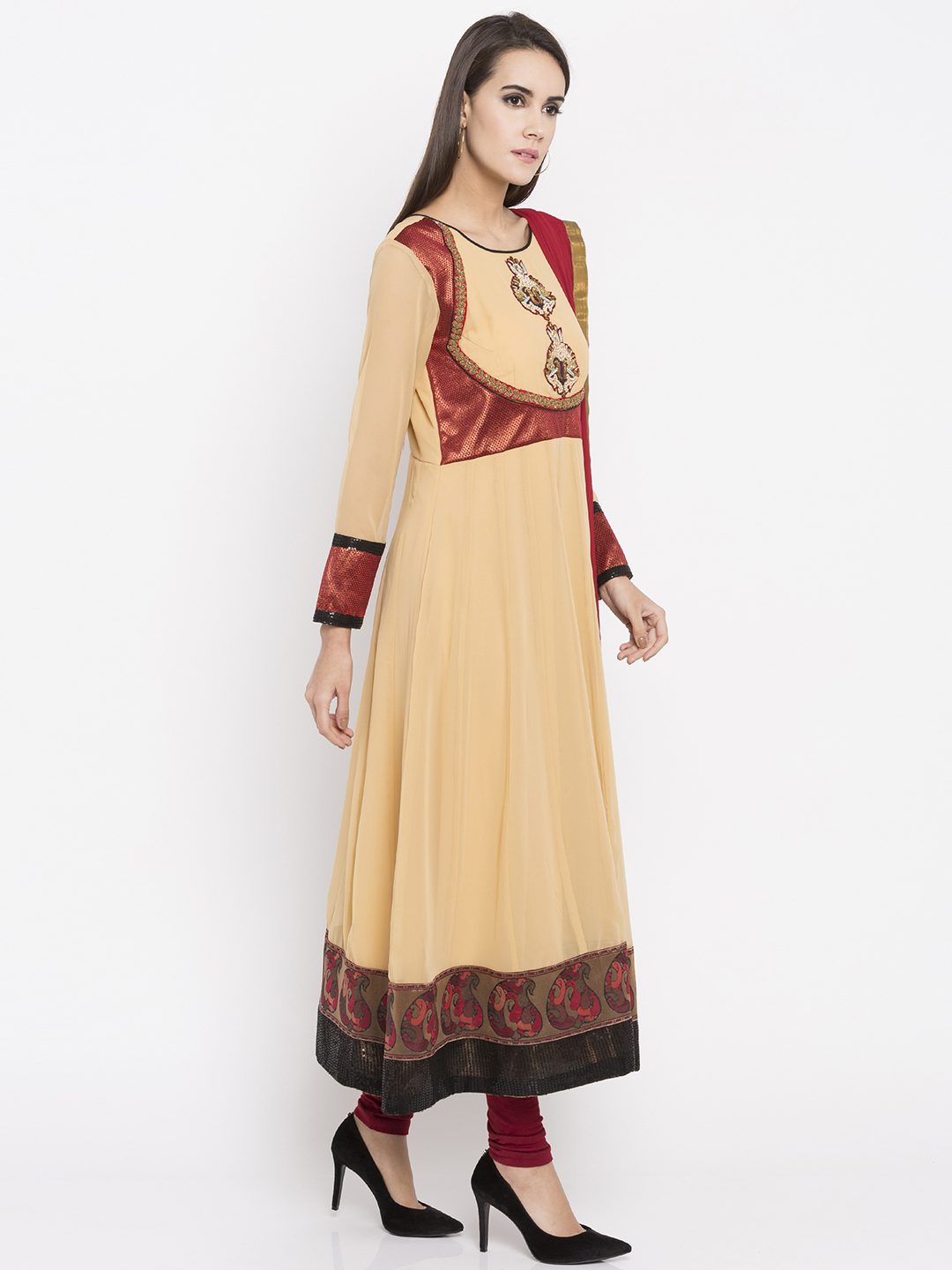 Beige Anarkali Cut Kalidaar Kurta With Embroidery On Yoke And Brocade Detailing On Sleeves, Yoke And Ghera. worn with Maroon churidar And Maroon Chiffon Dupatta.