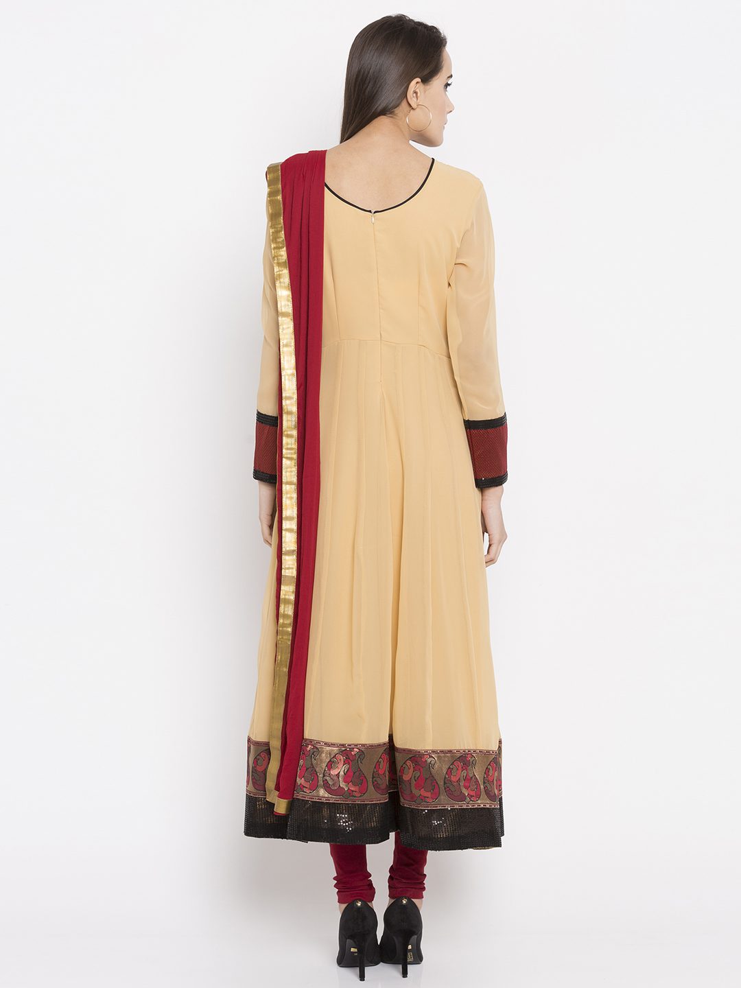 Nikhaar Creations Beige Embroidered Georgette Kalidar Churidar Kurta Dupatta