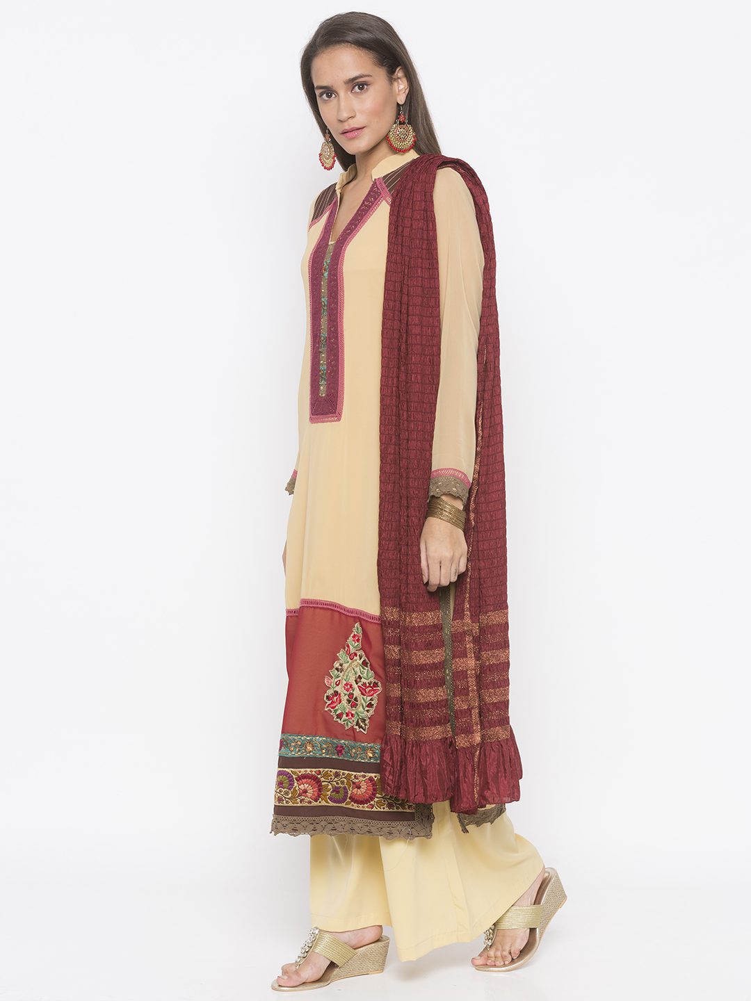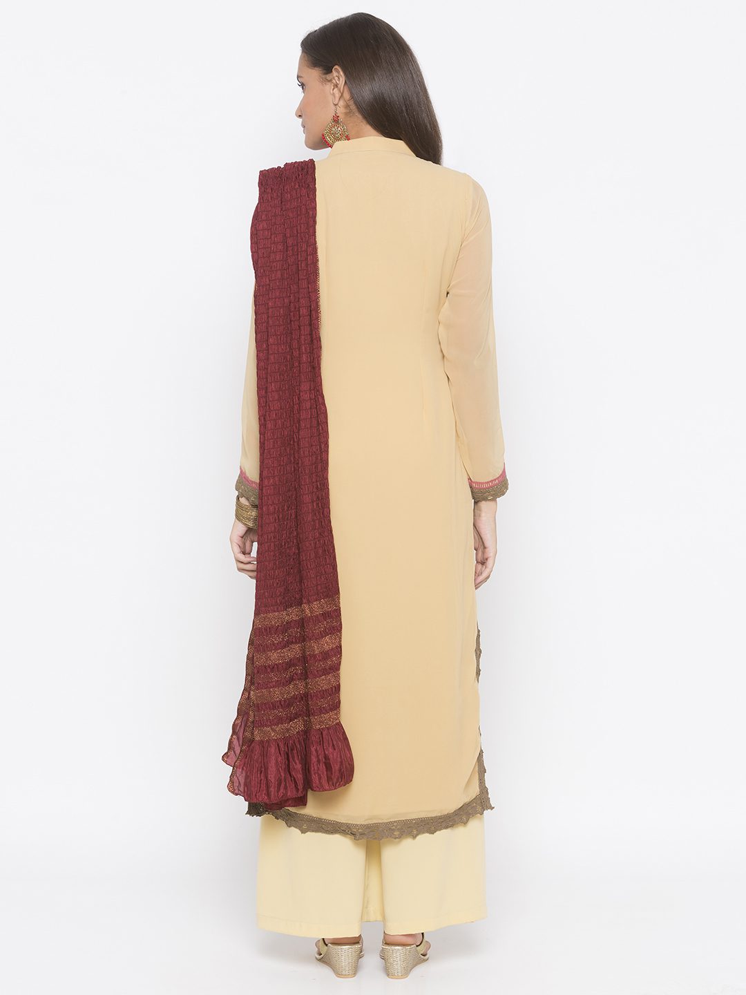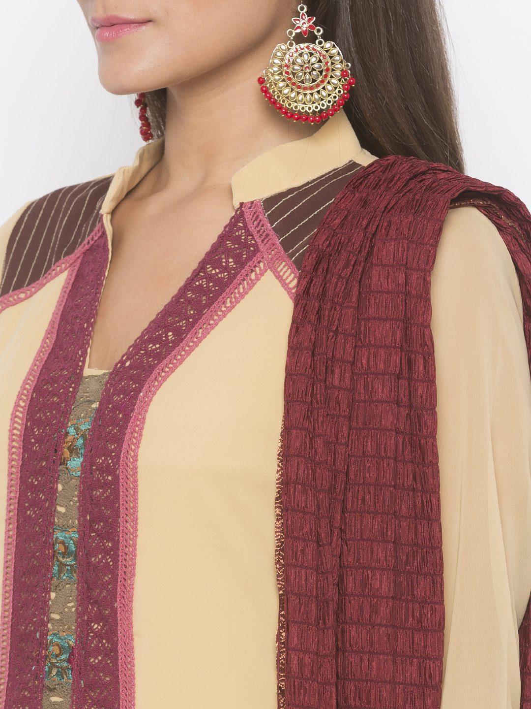 Beige Georgette Straight Cut Kurta With Chocolate Brown Stitch Detailing On Shoulders.. Maroon And Sage Green Lace Detailing On Neck And Sides Of The Kurta With Contrast Maroon Georgette Hemline Having Embroidery On It.. Full Sleeves With Lace Detailing Worn With Beige Palazzo And Maroon Satin Crepe Dupatta.