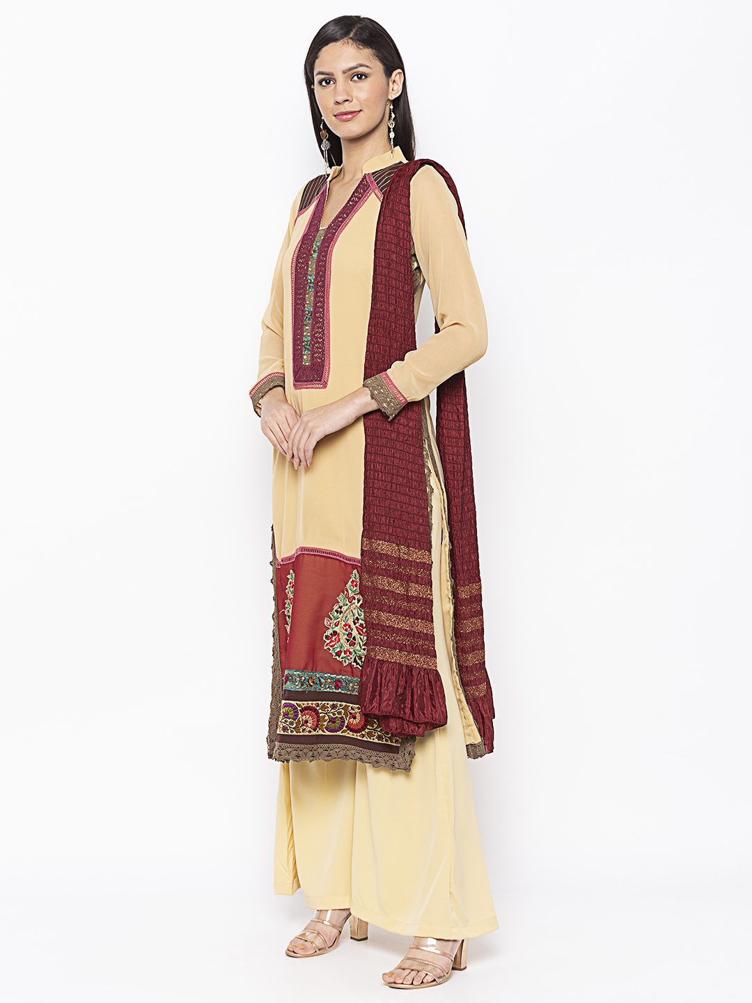 Nikhaar Creations Beige Embroidered Georgette Straight Palazzo Kurta Dupatta