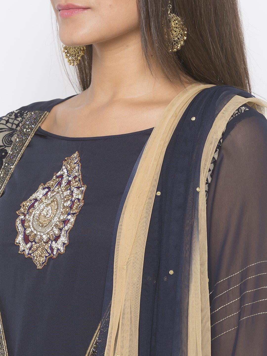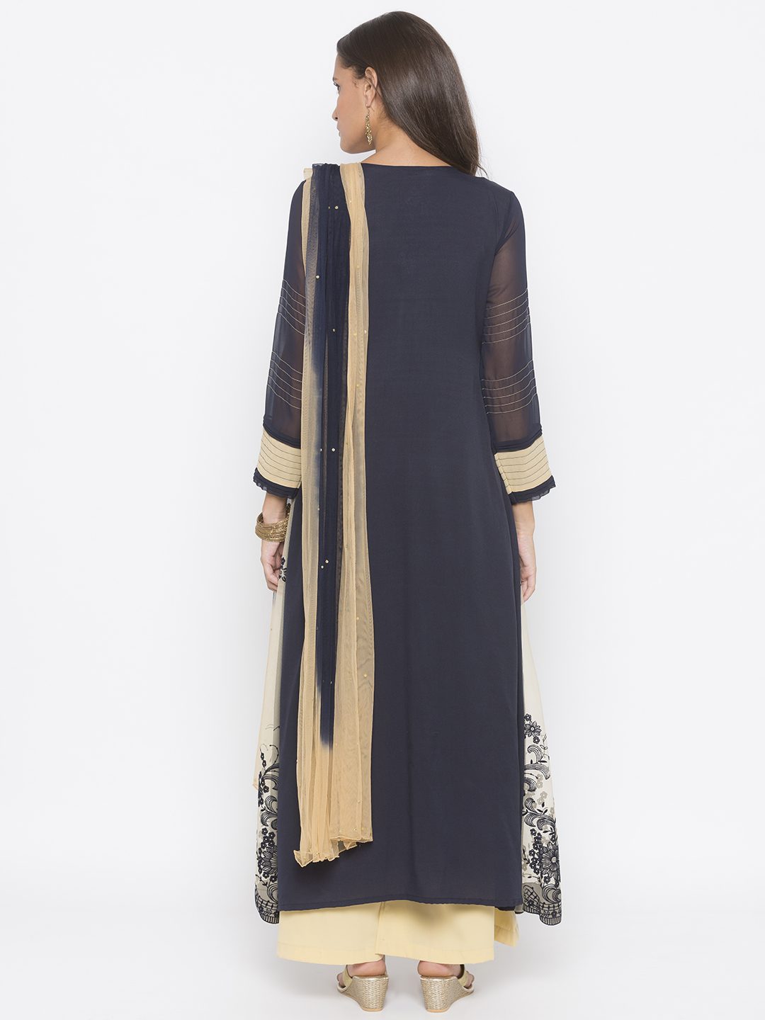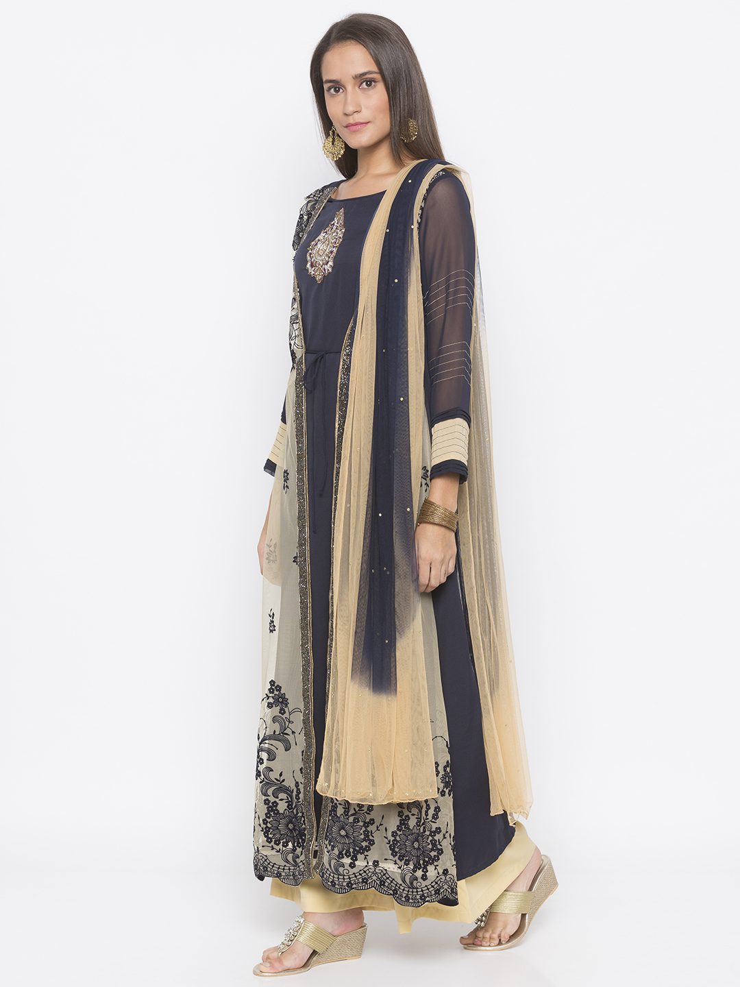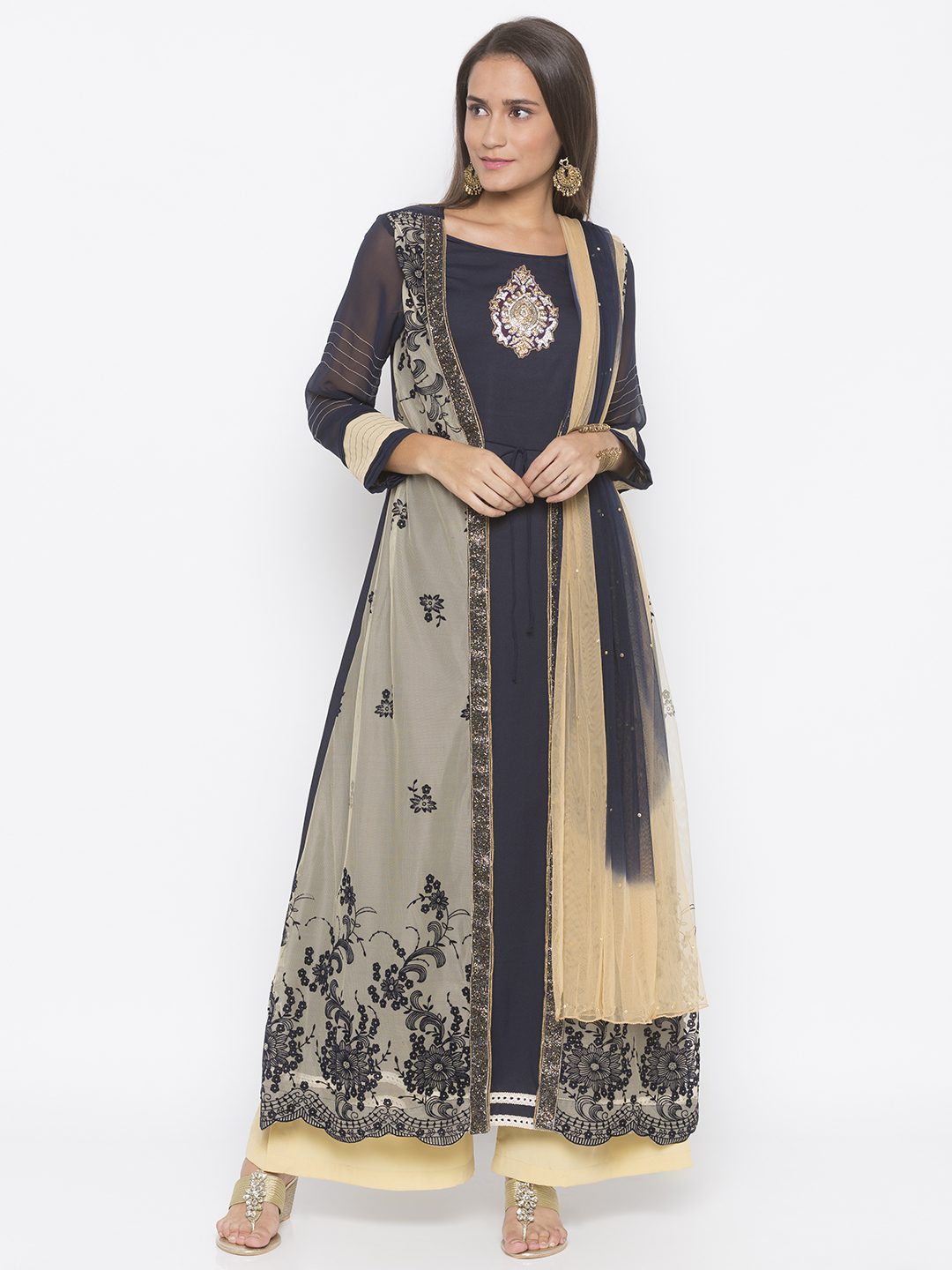 Beige Net Flocking Embroidered Jacket Style Long A-Line Kurta With Navy Blue American Crepe Inner Sheer Navy Blue Georgette Sleeves With Beige Stitching Detailing And Pleats On It Multi Colour Cut Beads Hand Embroidery On The Front Panel With Gold Diamond Studded Motif Below Neckline And Beige Border Detailing On Inner Hemline. Worn With Beige Palazzo And Beige Navy Blue Shaded Dupatta.