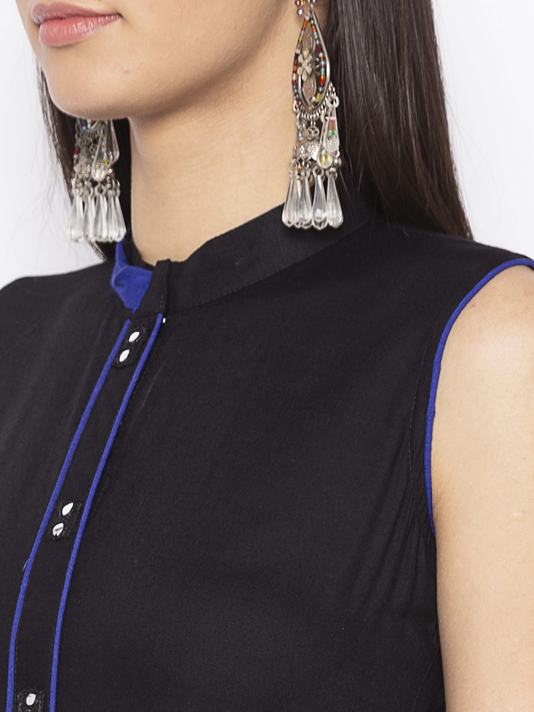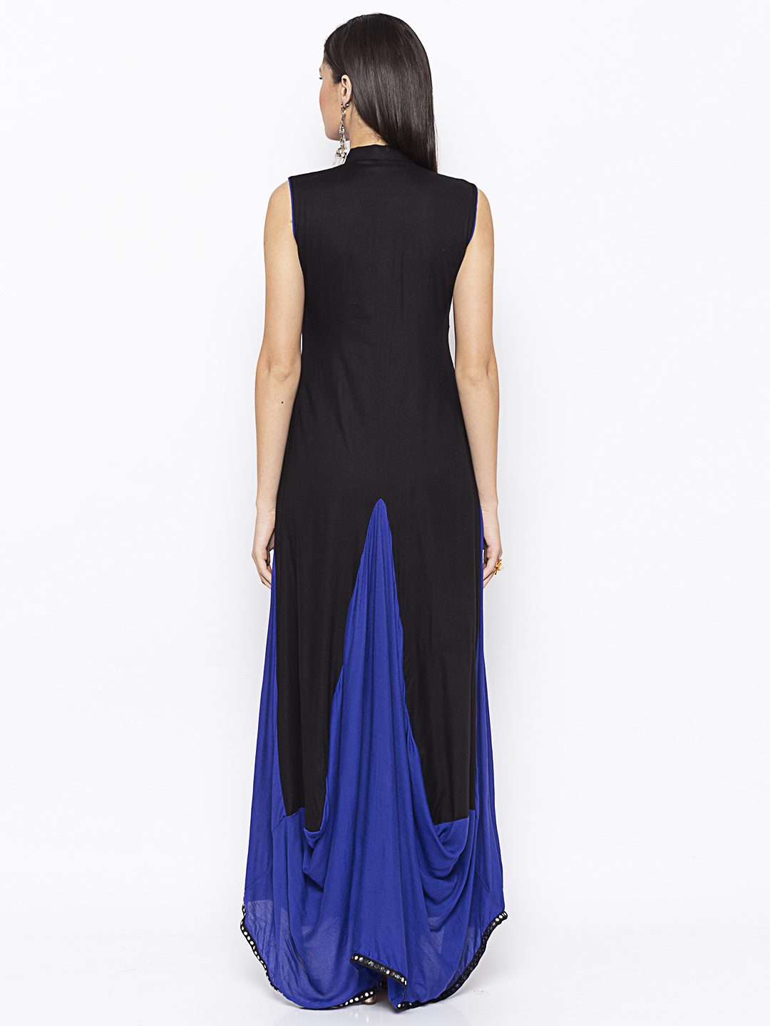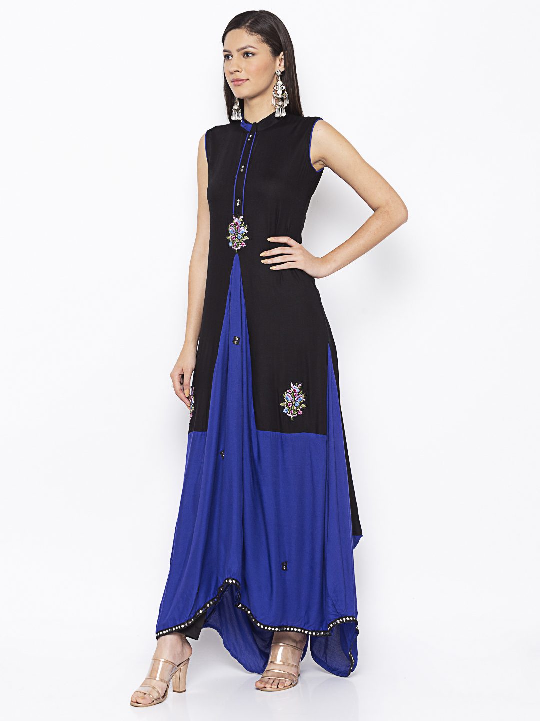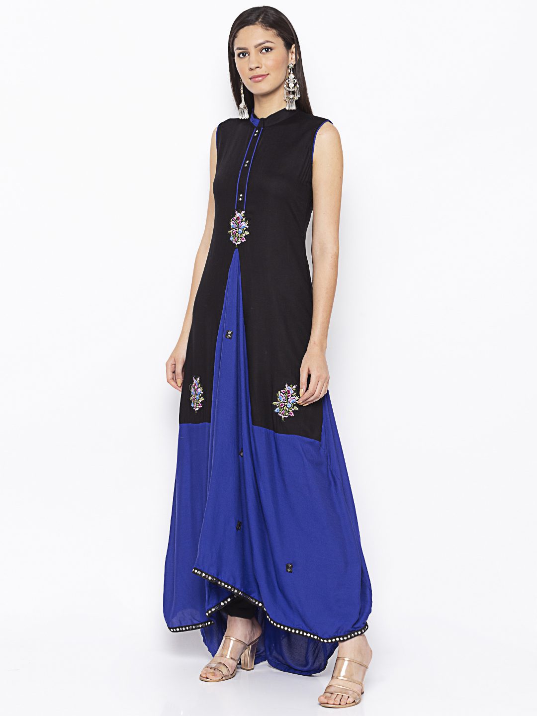 Black royal blue two coloured cotton long kurta dress with box pleat detailing in the front.. contrast detail work on half chinese collar. arm holds and front placket with embroidery below front placket and Ghera ..mirror borders on ghera