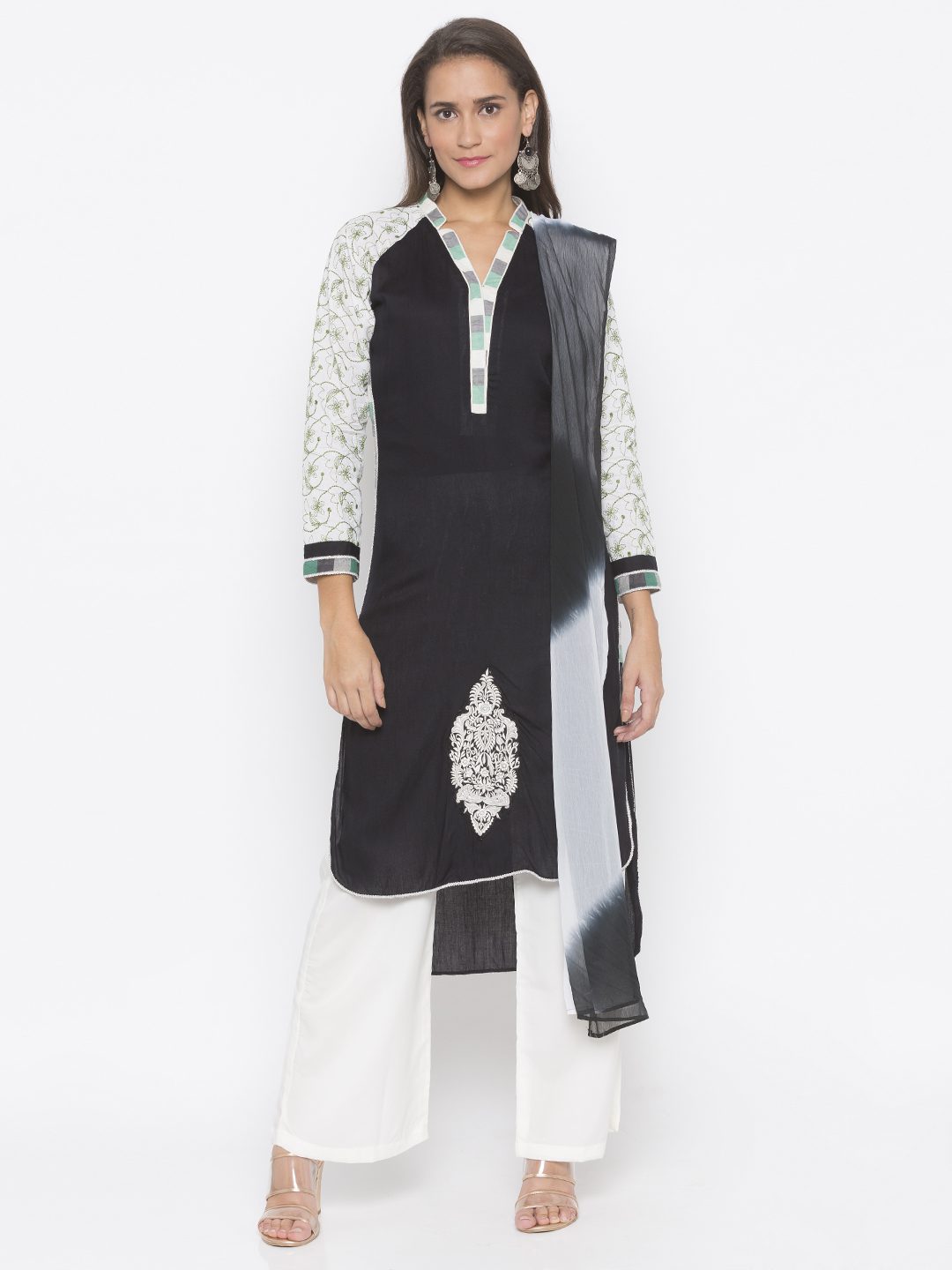 Nikhaar Creations Black Embroidered Cotton Asymmetrical Palazzo Kurta Dupatta