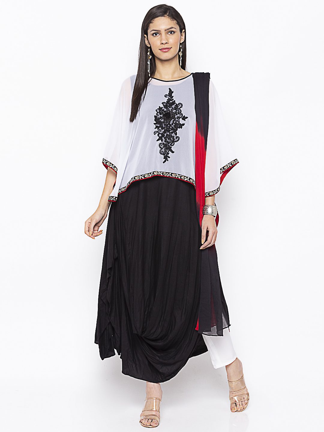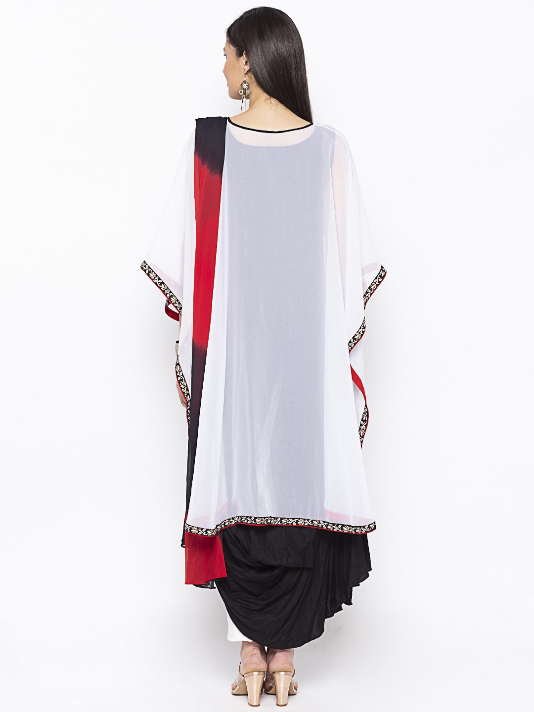 Off White Georgette Cape With Black Crystal Embroidery Having Black Gold Print Border With Red Pencil Piping All Around The Cape With A Separate Asymmetrical Drape Style Cowled Rayon Detachable Kurta Which Can Be Worn As A Separate Dress. Paired With Off White Cigarette Pants And Black Red Shaded Dupatta.
