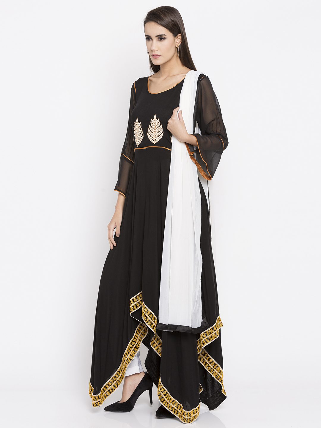 black cotton asymmetrical salwar suit with embroidery at the front enhanced by stylish bell sleeves. As shown it comes with a white crepe Pant And White chiffon Dupatta.