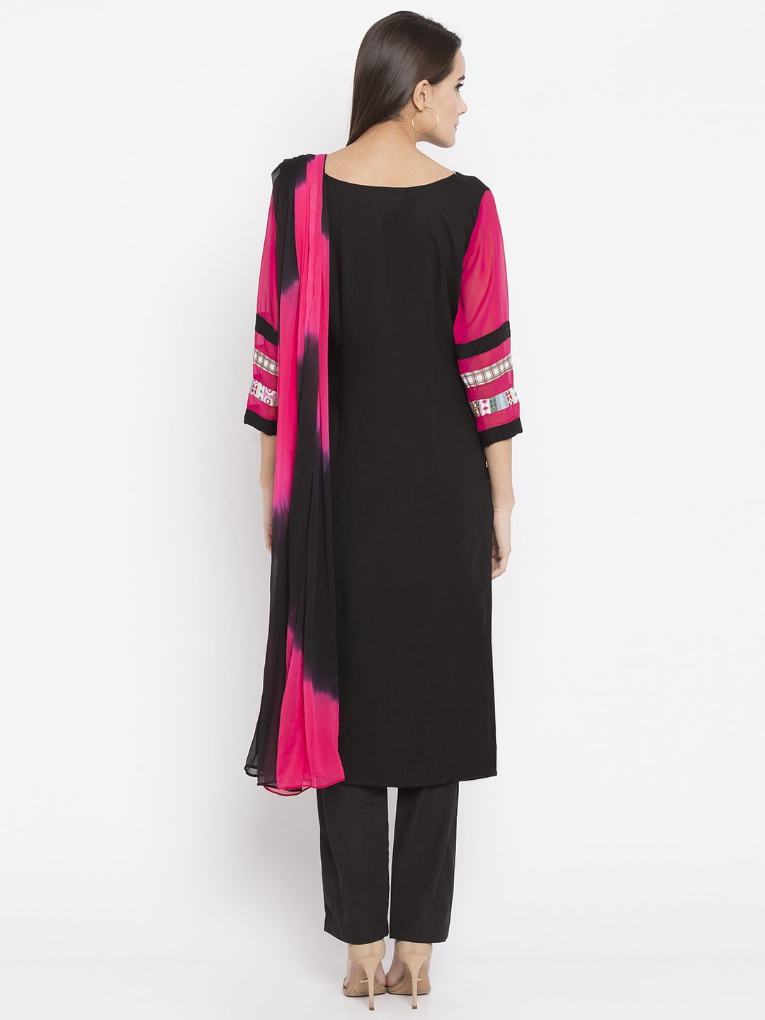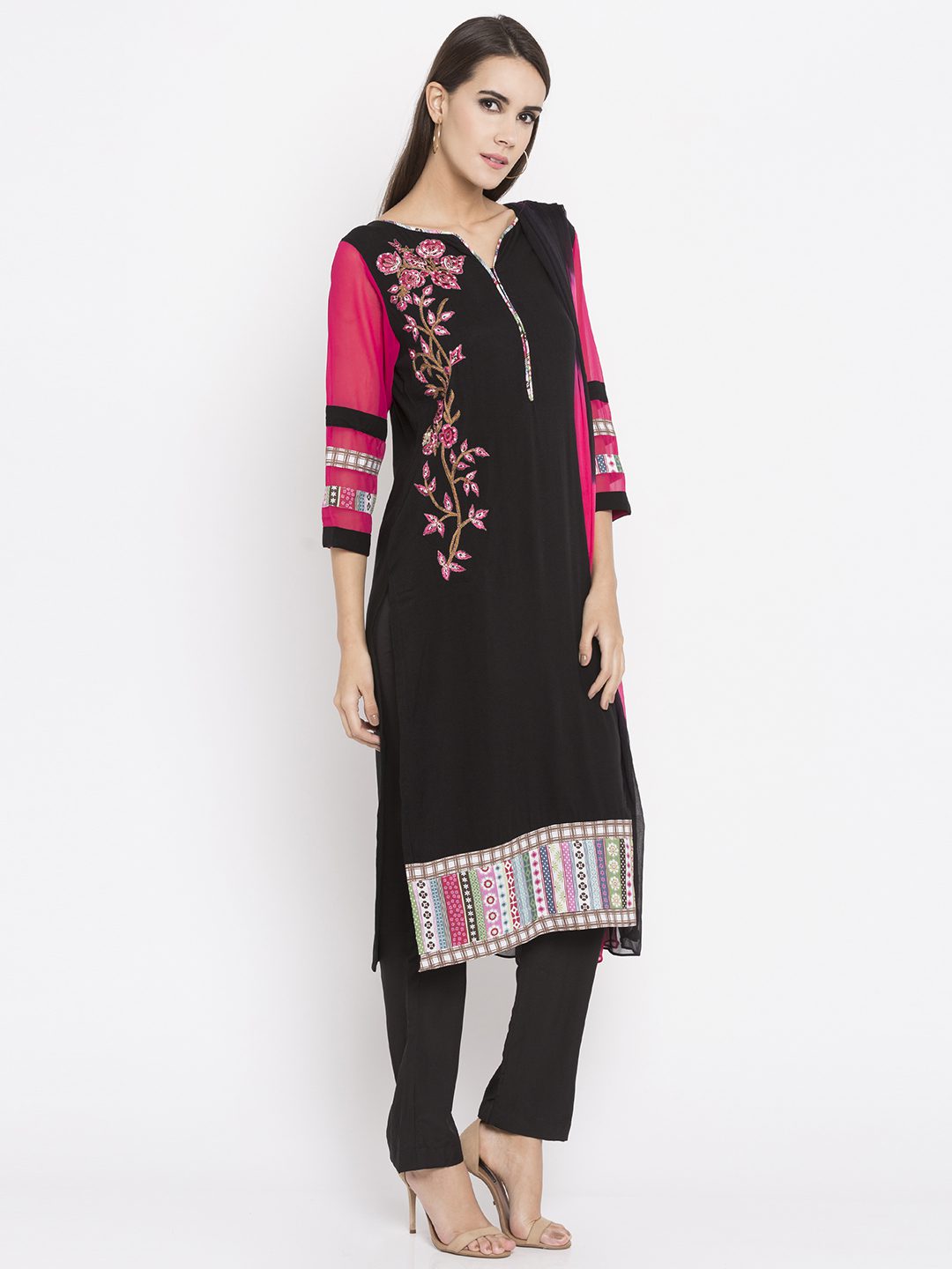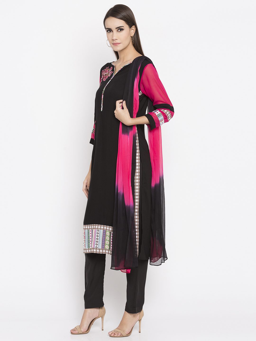 Black straight cut readymade kameez in cotton designed with striking print detailing at the sleeves, hemline and neck enhanced by resham and sequins embroidery work. Accompanied by a plain black crape silk pant and a shaded pink and black chiffon dupatta.