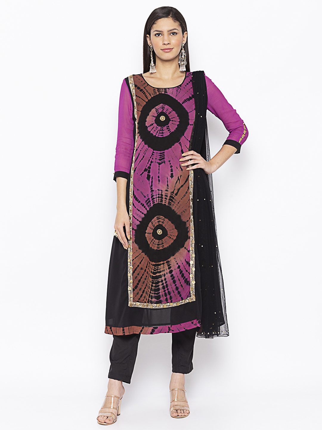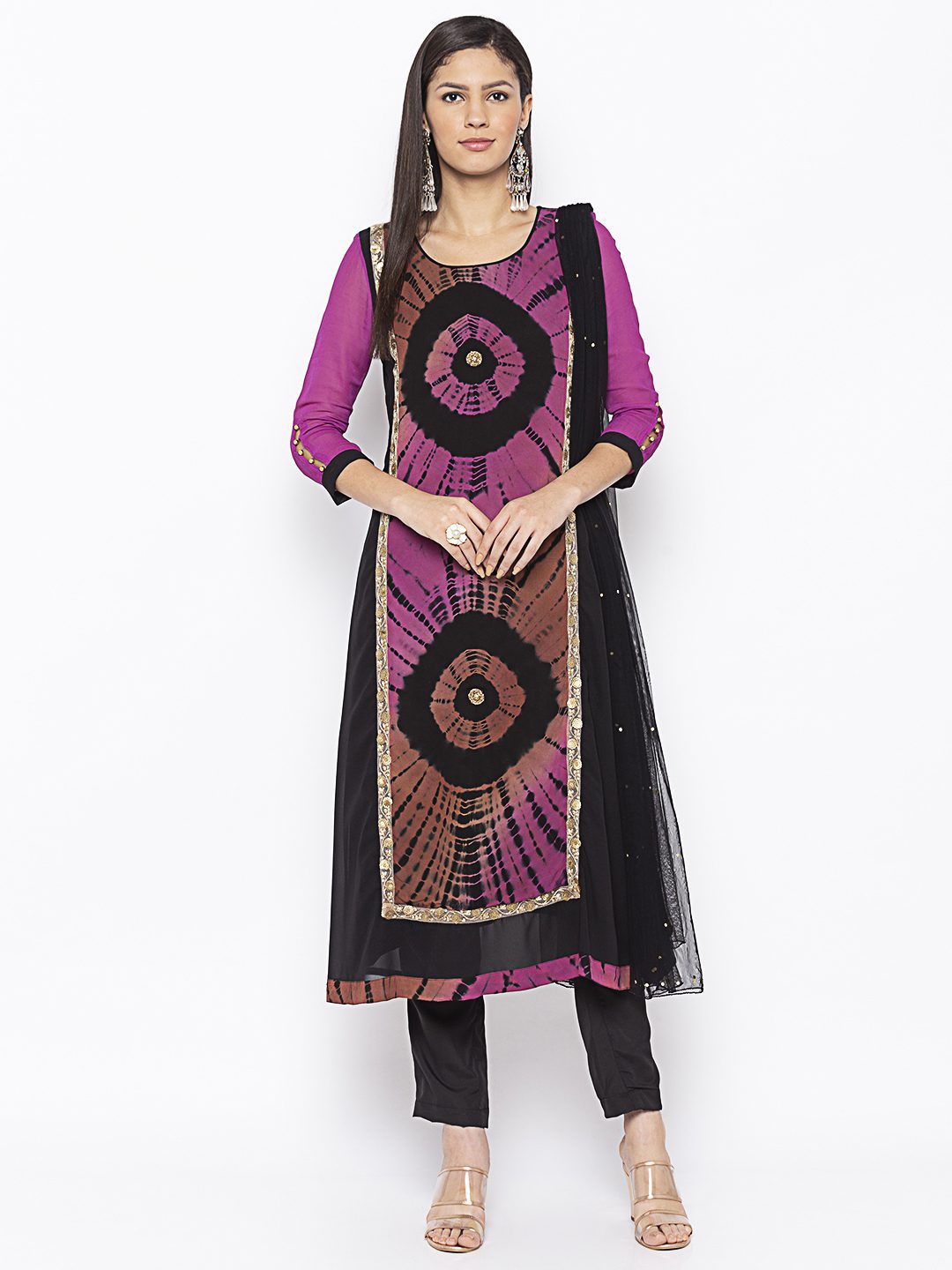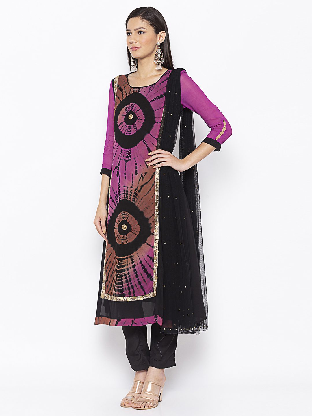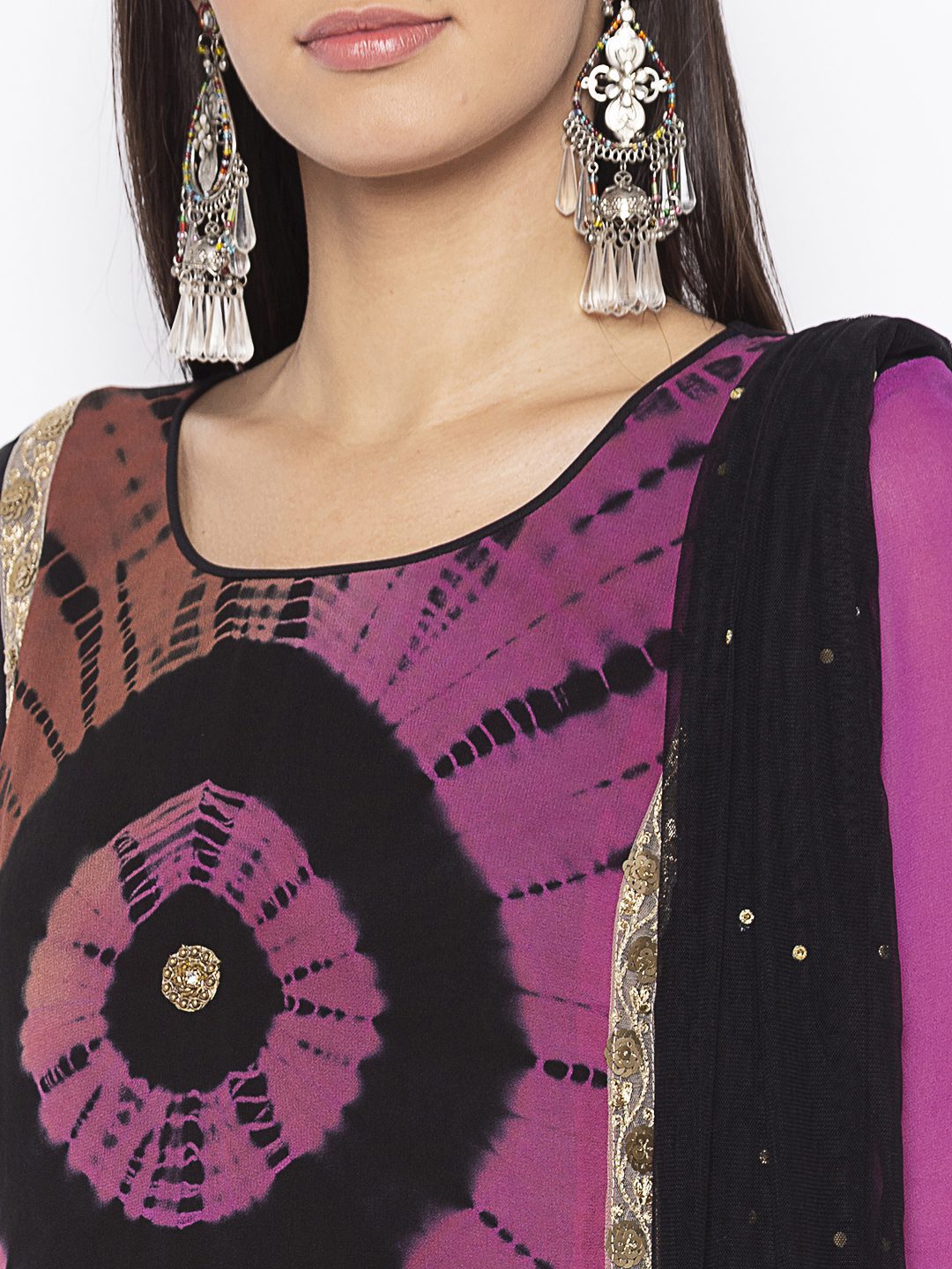Black Georgette A Line Kurta With Magenta Three Quarter Sleeves And Batik Tie Die Magenta Brown Black Shaded Front Panel With Gold Antique Sequin Embroidedy Around It ..Small Hand Embroidered Motifs With Gold Bead Details On Slitted Sleeve Worn With Black Cigarette Pants And Net Dup With Diamantes On It.