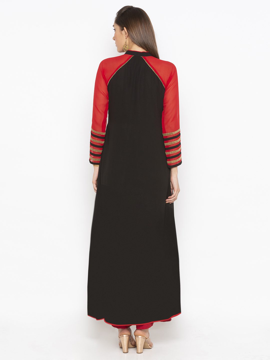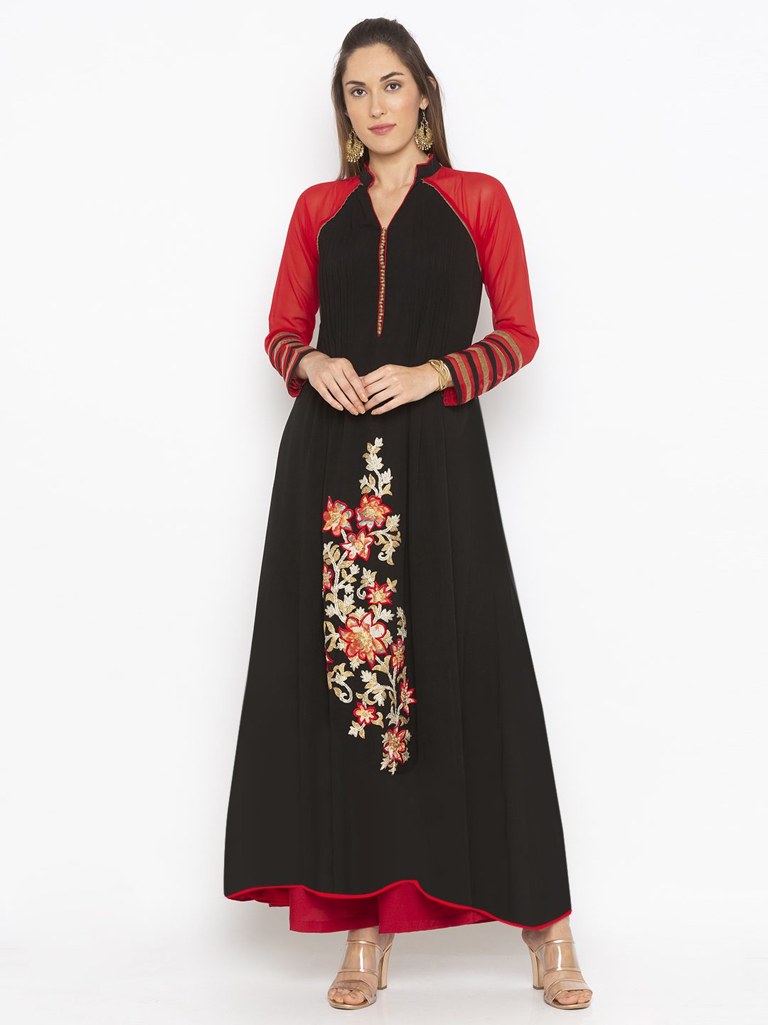 Black Georgette Pleated Full Length Flared Kurta With Red Georgette Raglan Full Sleeve Tissue Potlie Buttons And Piping Detailing On Neckline And Sleeves Edges ..Embroidered Applicque With Zari In The Front With Tissue Border And Piping Detailing On Hemline.