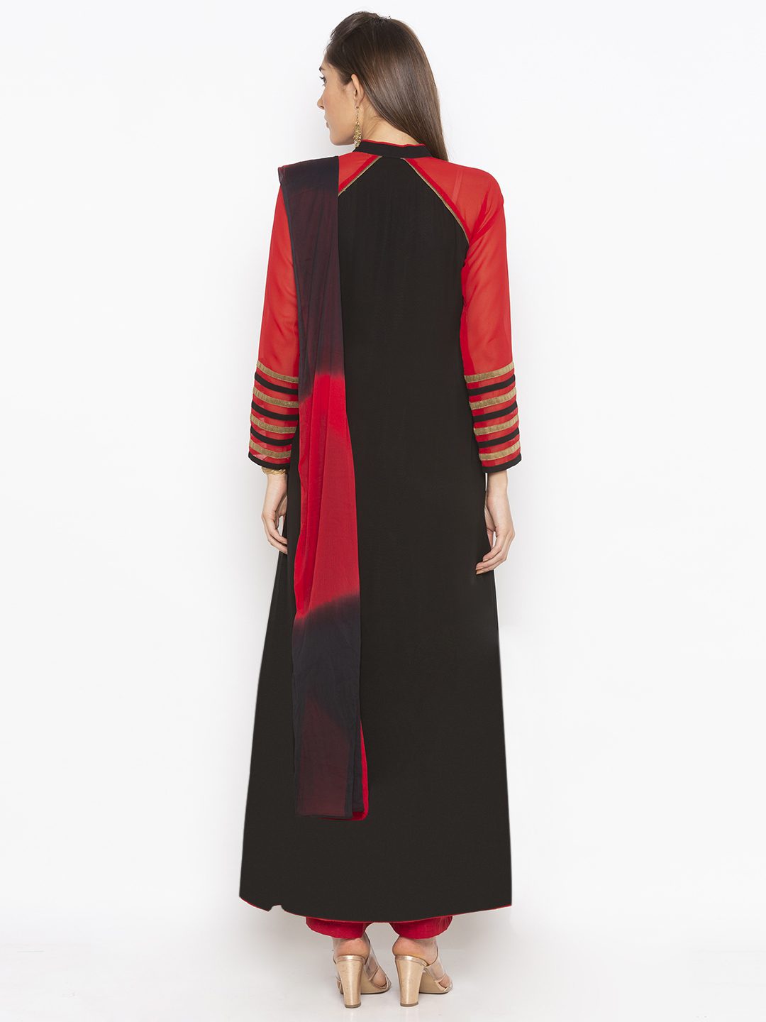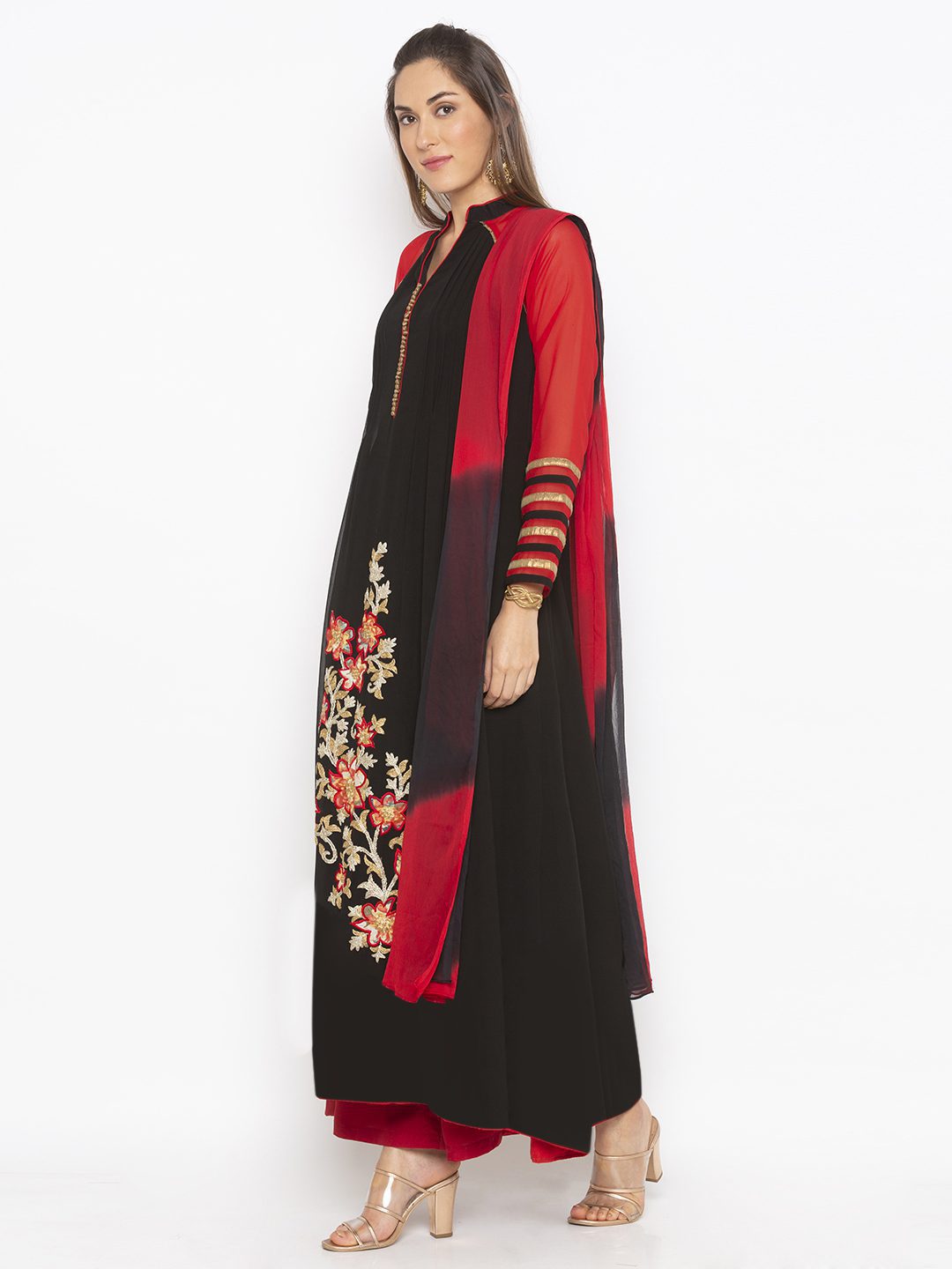 Black Georgette Pleated Full Length Flared Kurta With Red Georgette Raglan Full Sleeve Tissue Potlie Buttons And Piping Detailing On Neckline And Sleeves Edges ..Embroidered Applicque With Zari In The Front With Tissue Border And Piping Detailing On Hemline Wor With Red Palazzo.