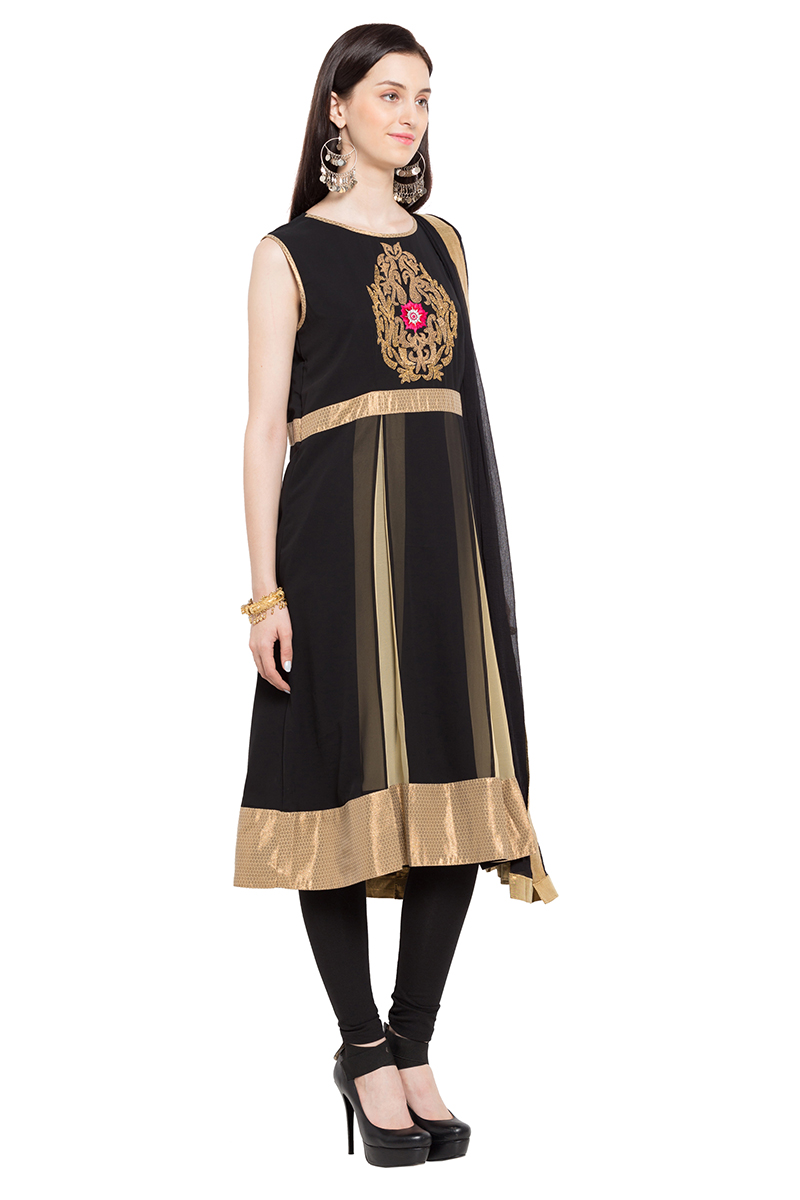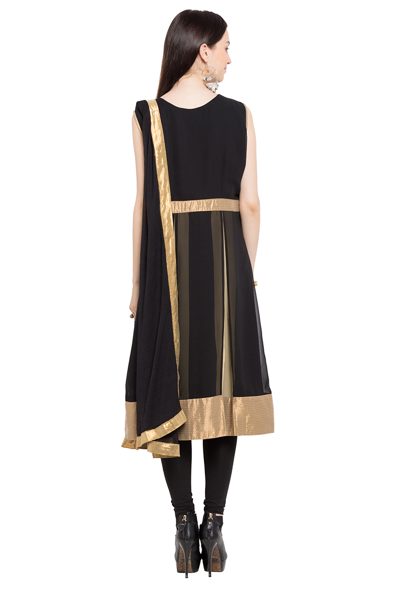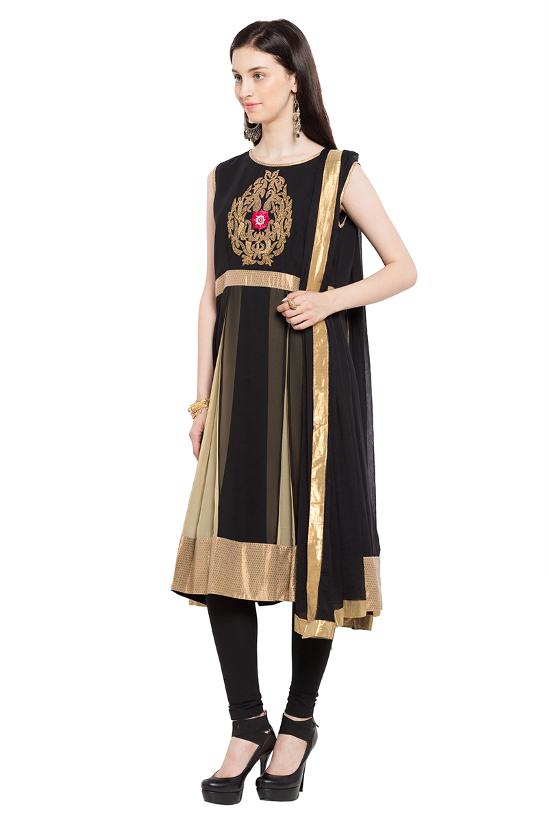 Black Georgette Kalidar Kurta Set With Box Pleat Beige Georgette Detailing And Tissue Borders On Waist And Hemline With Hand Embroidery Below Neckline . Worn With Black Churidar And Black Chiffon Dupatta .