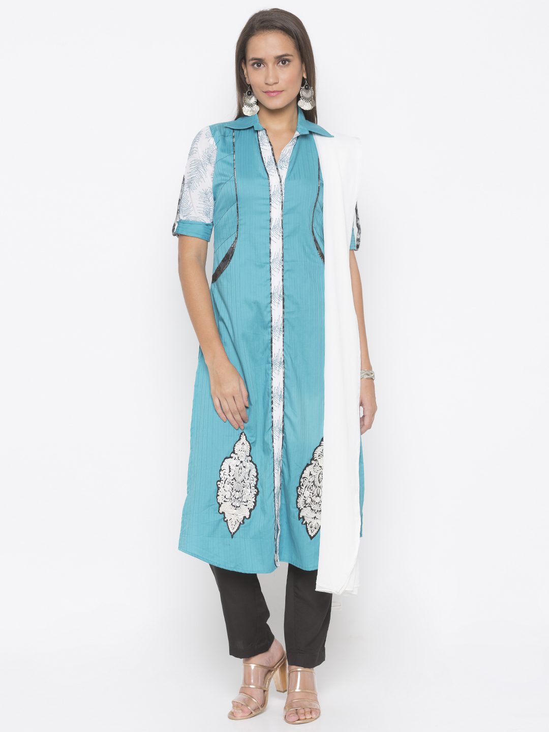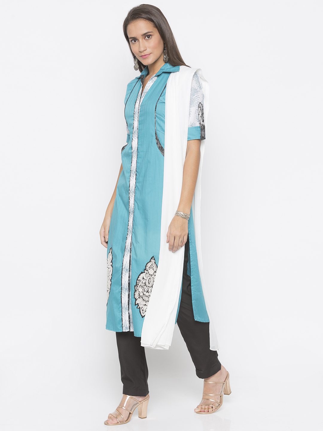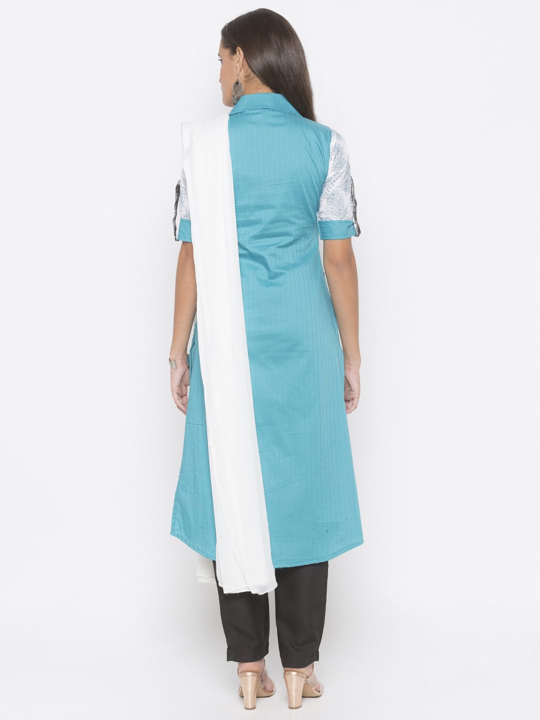 Blue Cotton Shirt Collar Straight Cut Front Slitted Kurta With Oxidized Black Piping Detailing On Side And Front Panel With Black Stitches On Side Panel .Reaching Till The Pockets….Black And White Thread Embroidery On Hemline Having White Blue Hakoba Elbow Sleeves With Blue Fold And Oxidised Black Epaulets Worn With Black Cigarette Pants And White Chiffon Dupatta