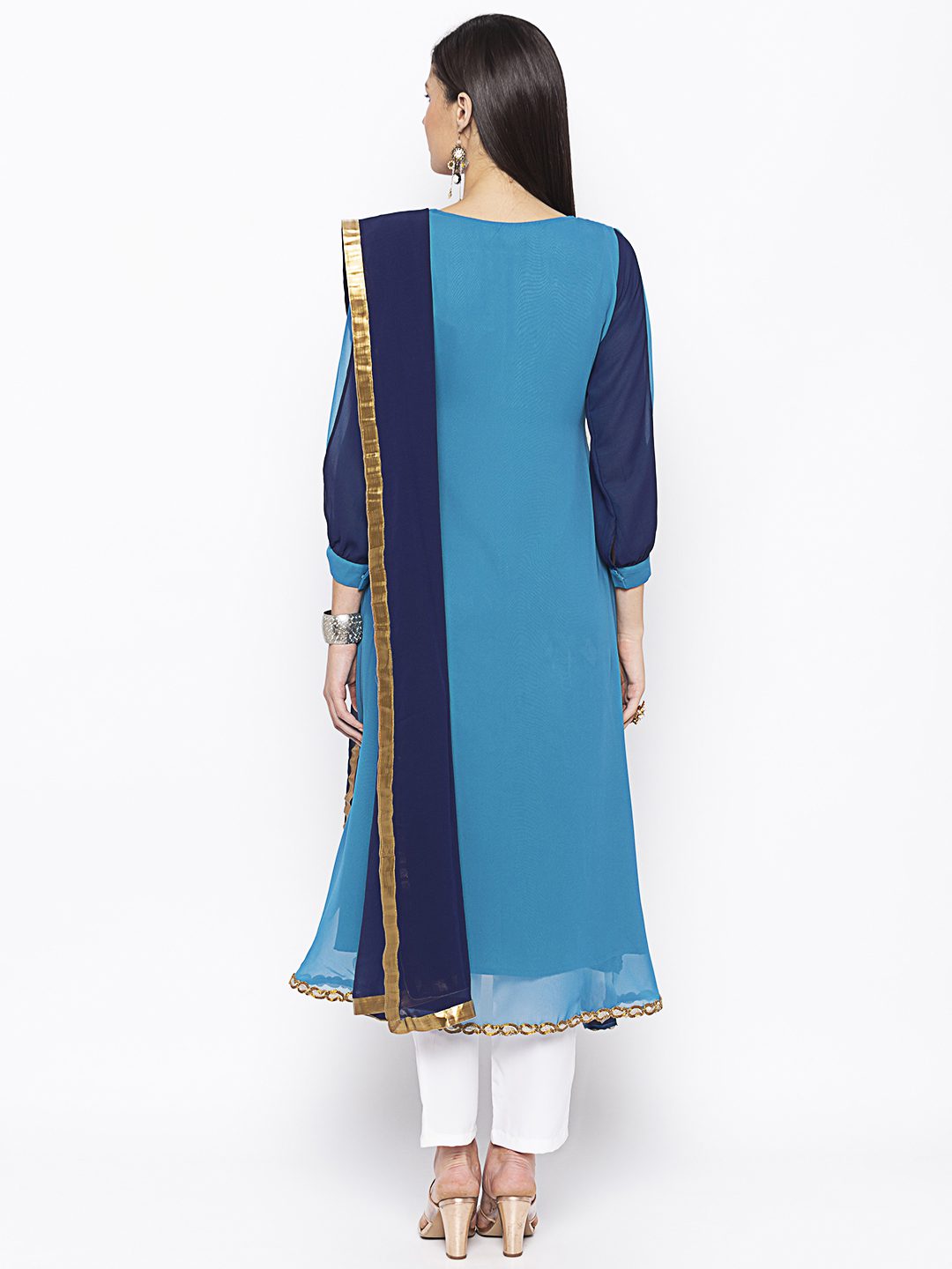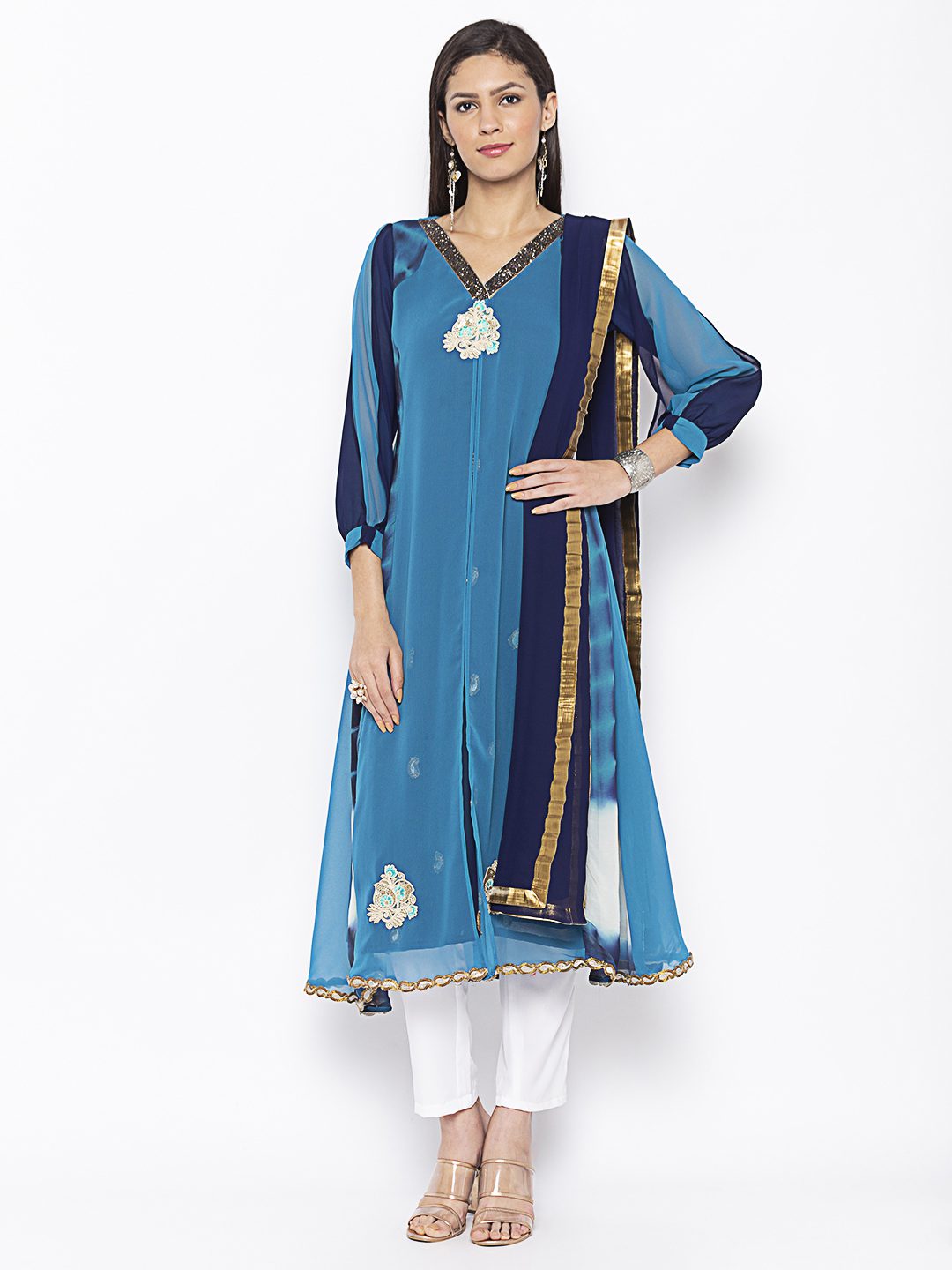 Light Blue Dark Blue Off White Tie Dye Georgette Shaded Kurta With Centre Cut And Sleeves Detailing Of Contrast Embroidery All Over In The Front With Beadwork On Neckline. Worn With Off White Cigarette Pants And Navy Blue Chiffon Dupatta With Gold Borders On It.