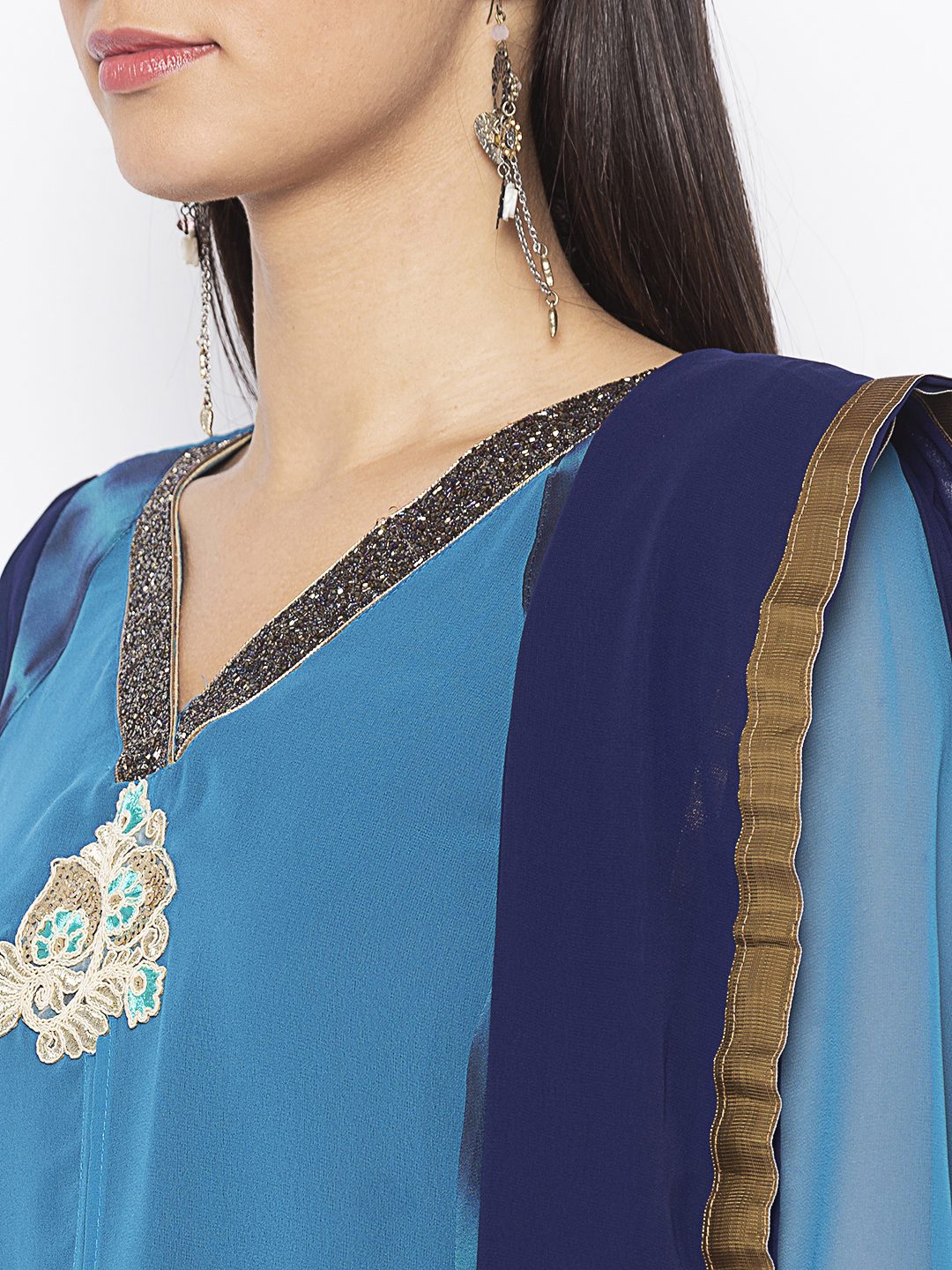 Nikhaar Creations Blue Embroidered Georgette A Line Trouser Kurta Dupatta