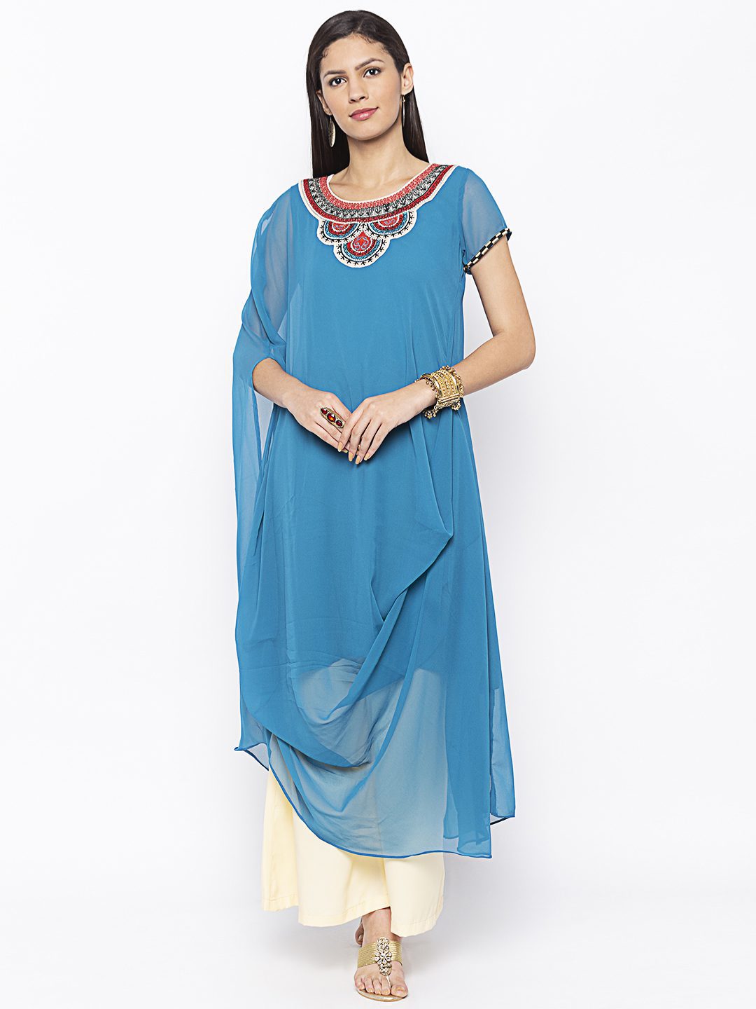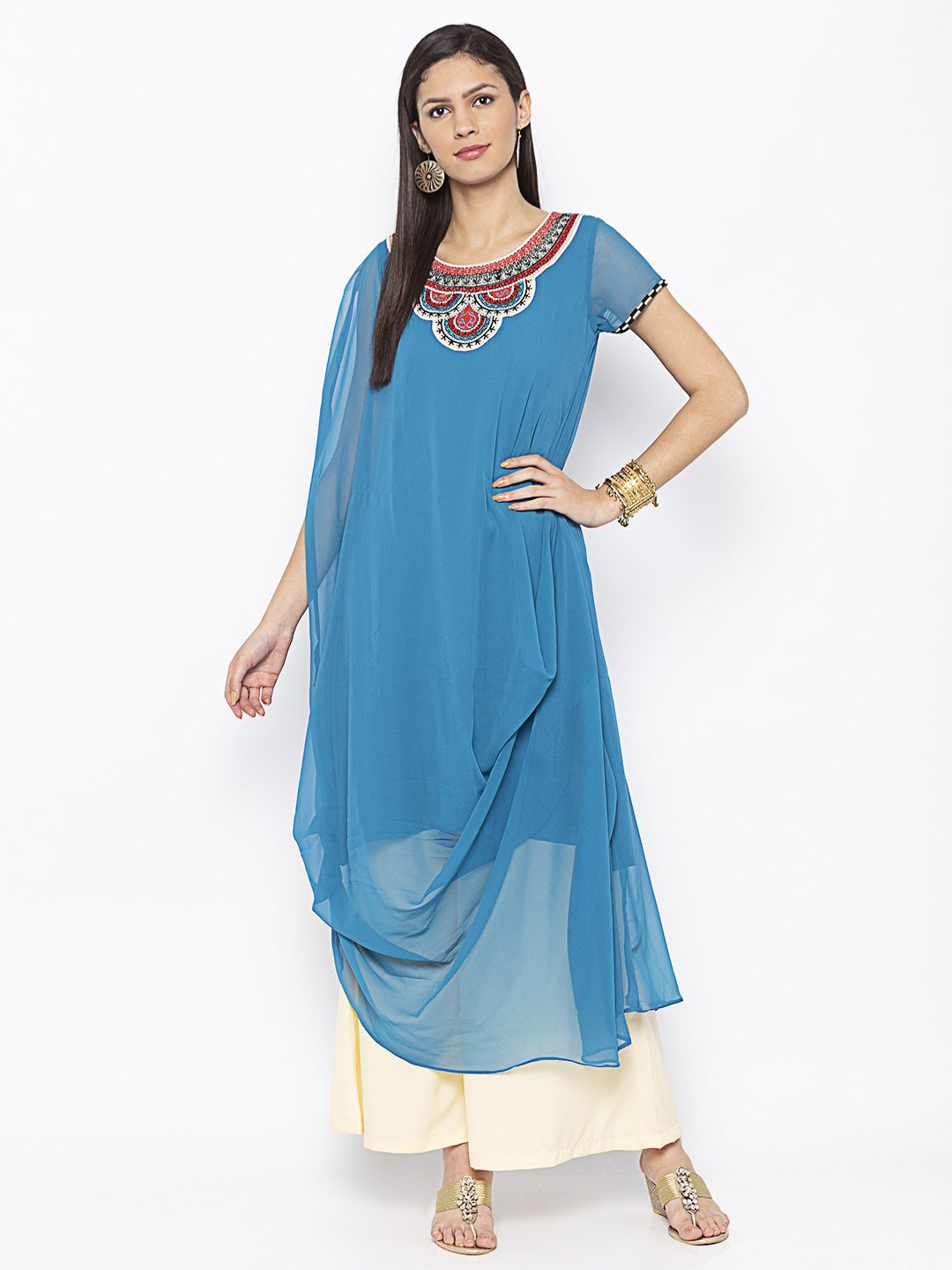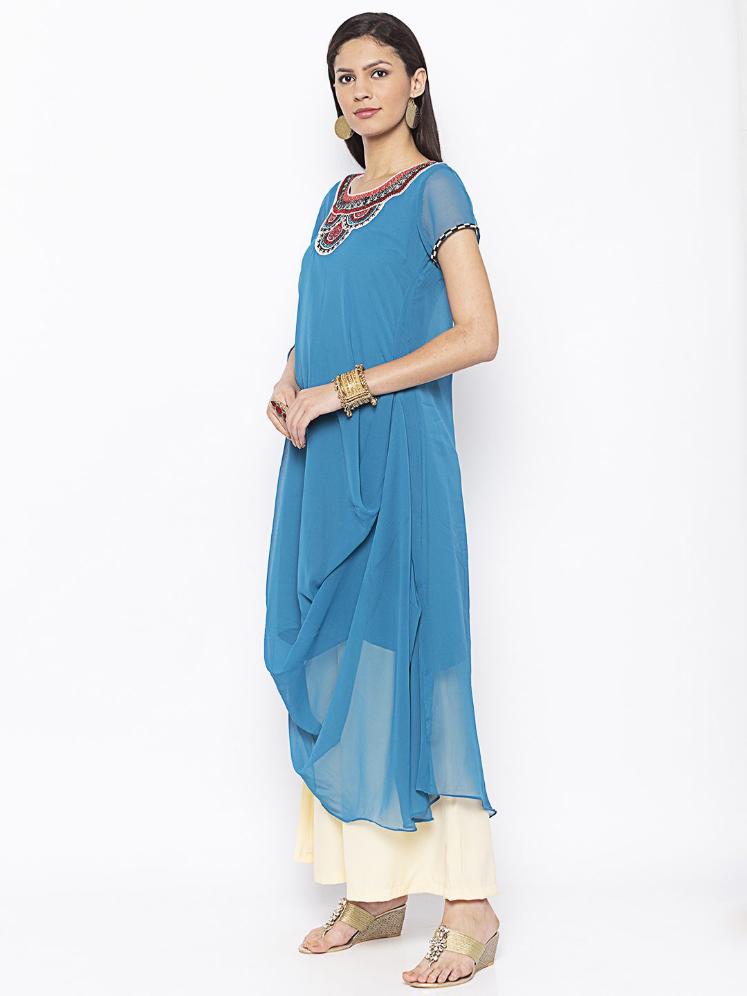 Nikhaar Creations Blue Embroidered Georgette Asymmetrical Kurta