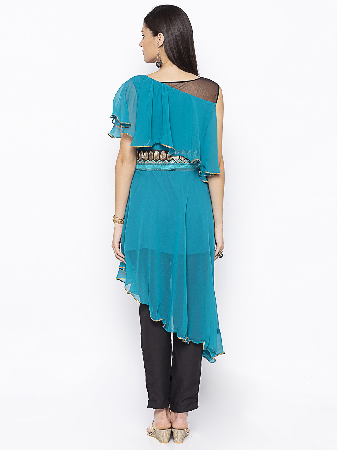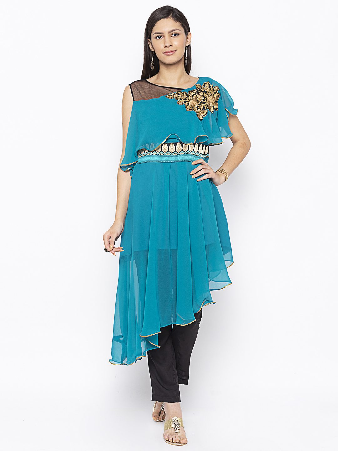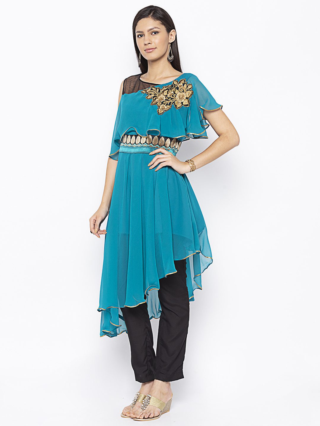 Turquoise Blue Asymmetrical Georgette Slightly Flared Kurta With Black Net See Through Effect On Shoulders ..Black Gold Resham Embroidery On Cape With Border On Waistband.. Gold Gota Patti Detailing On Cape And Asymmetrical Hemline.