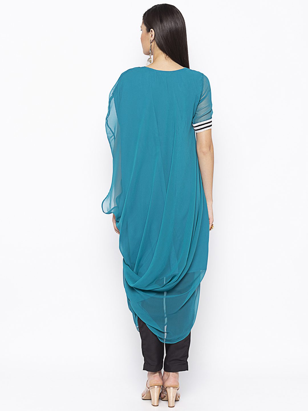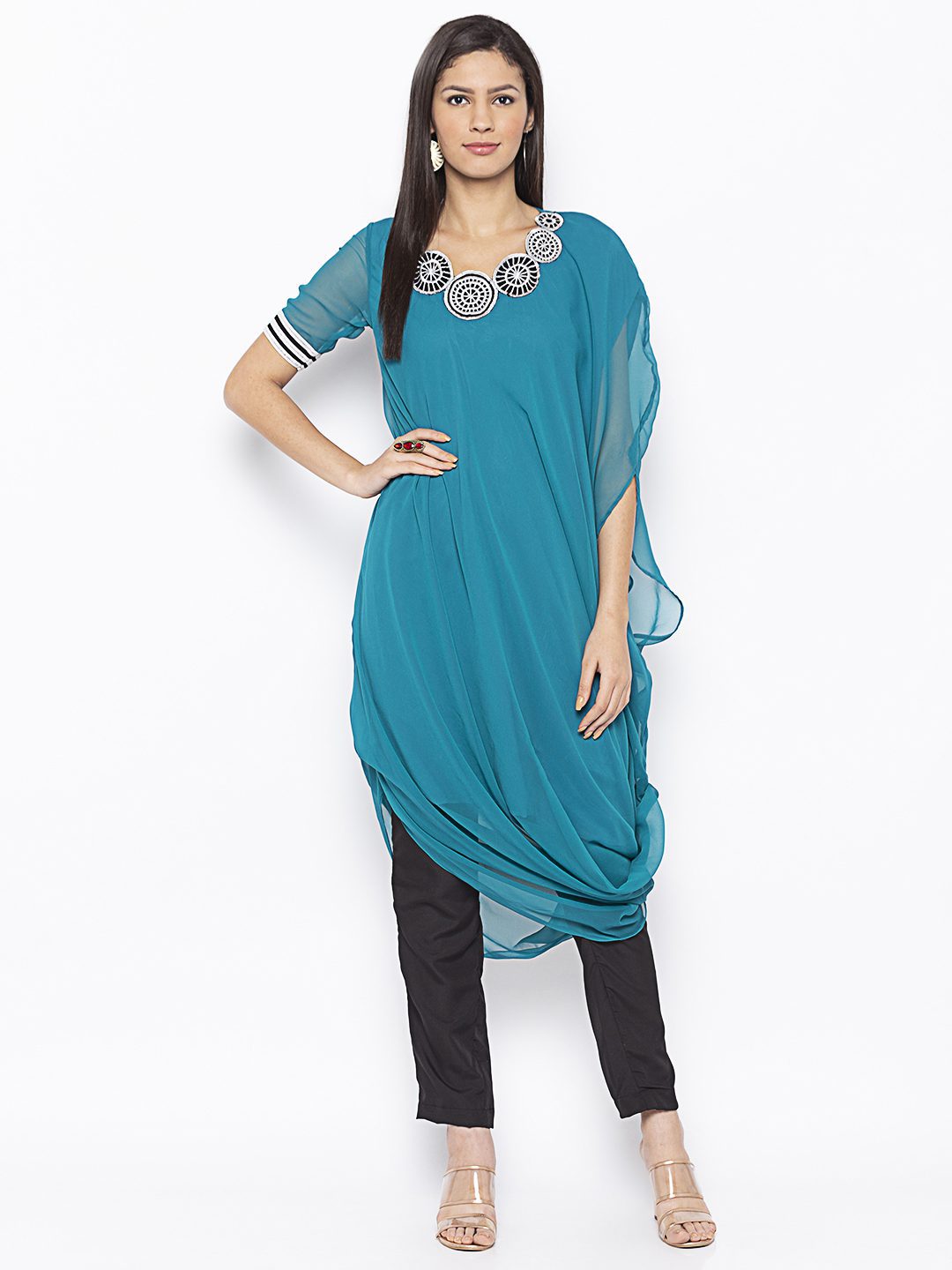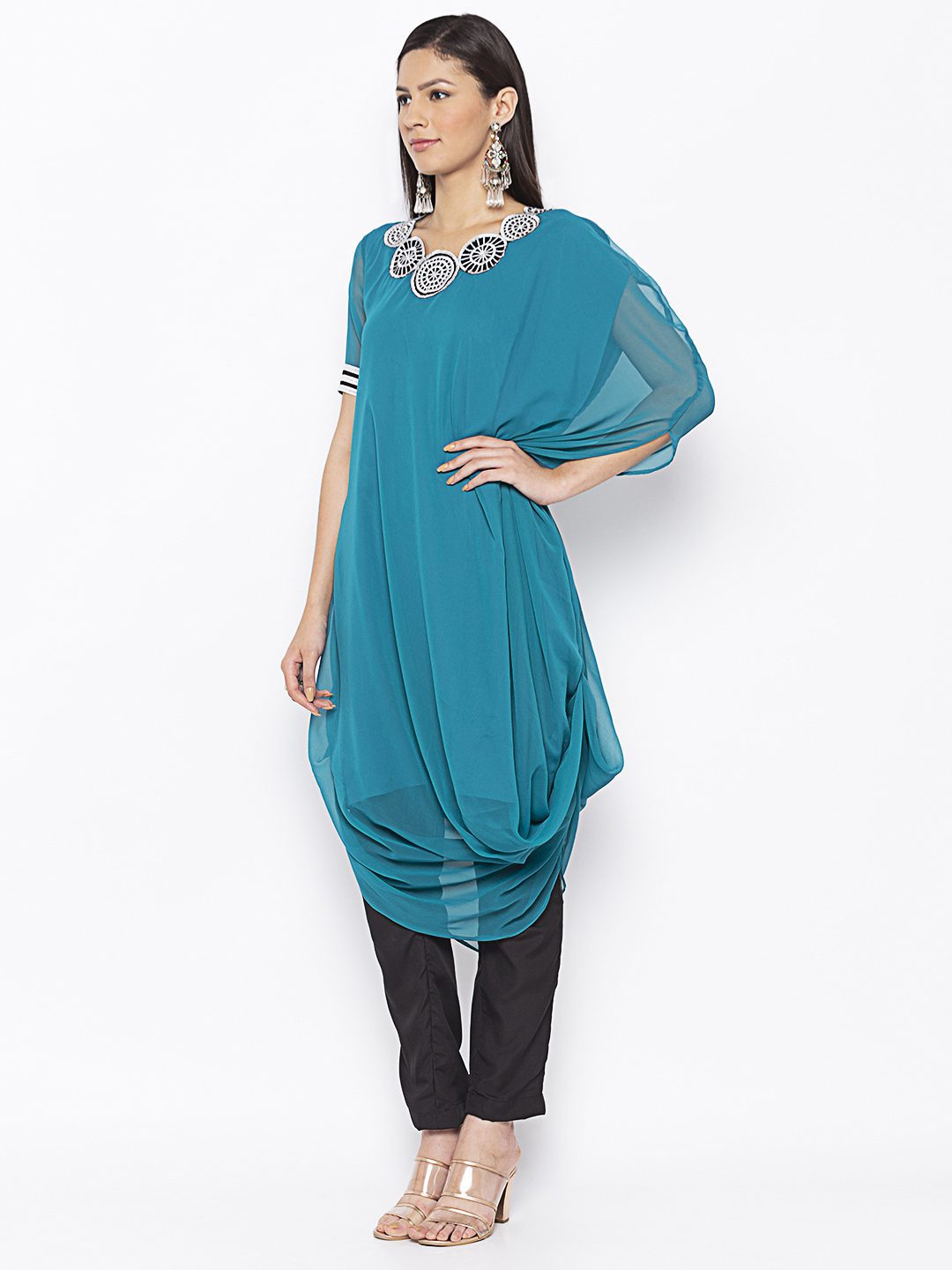 Turquoise Blue Asymmetrical Cowled Kurta With Lace Detailing On Short Sleeves Black And White Geometrical Thread Embroidery Around Neckline.