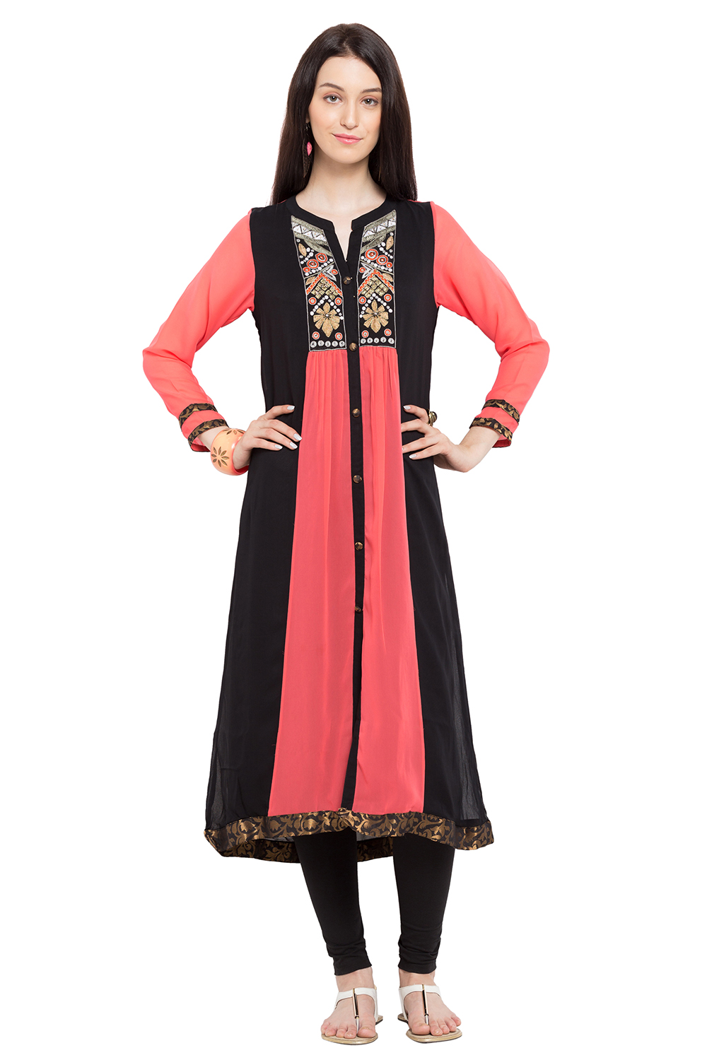 Nikhaar Creations Coral Pink Embroidered Georgette A Line Kurta