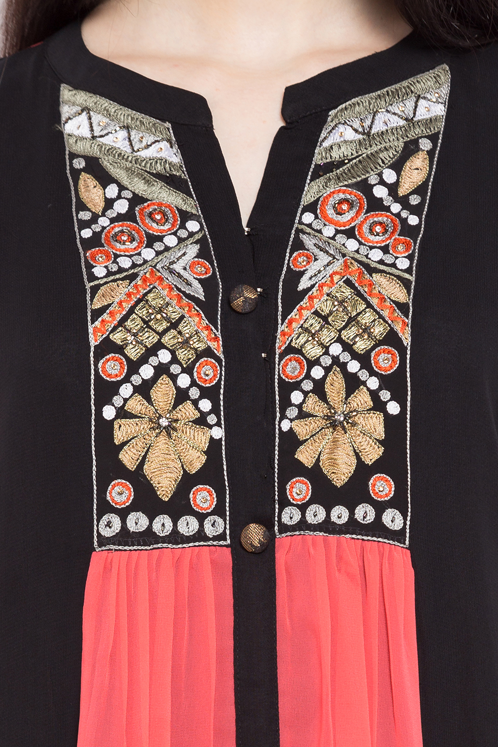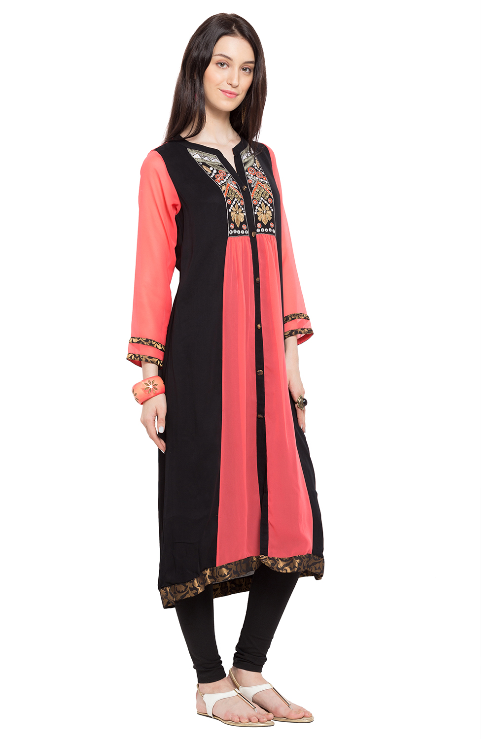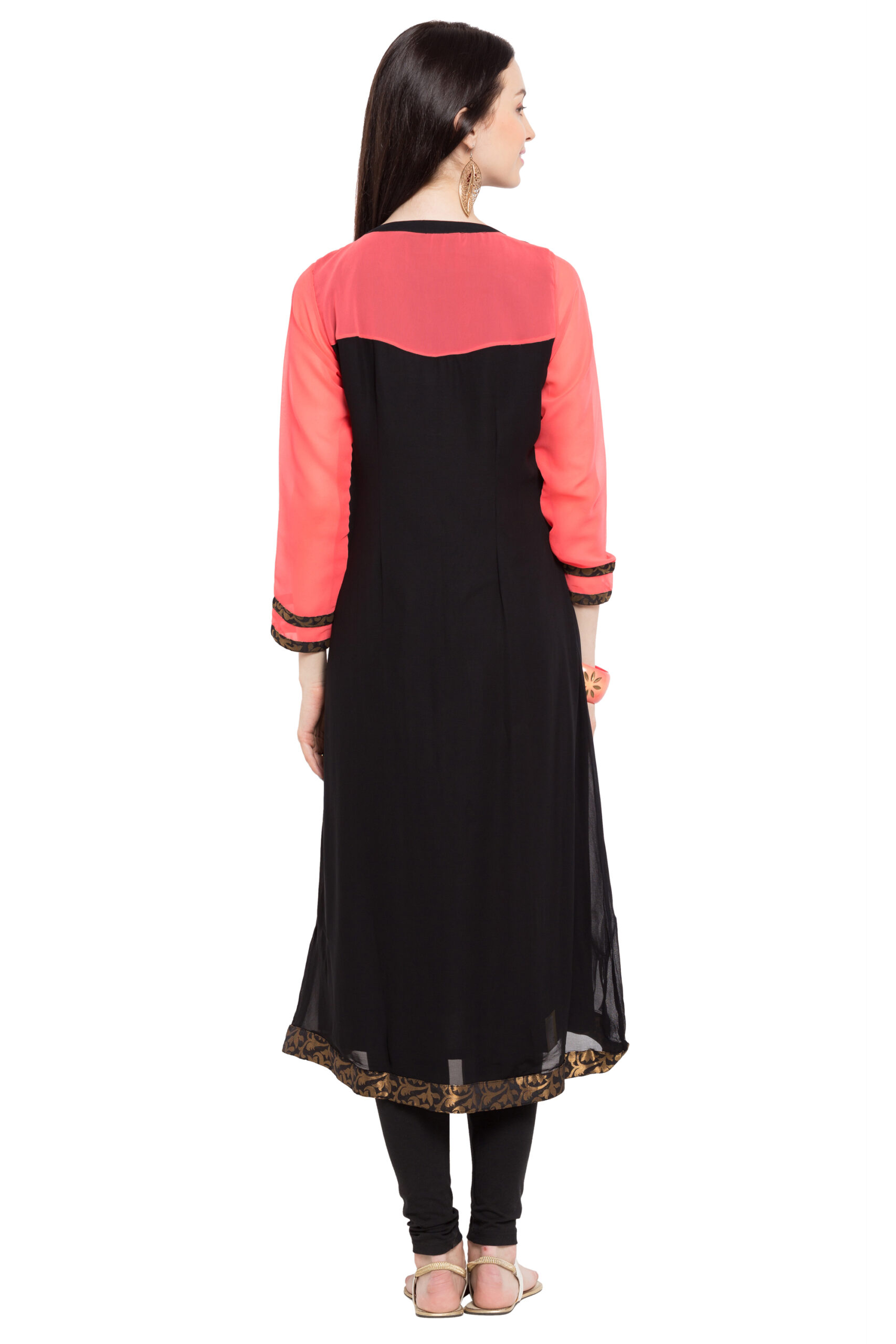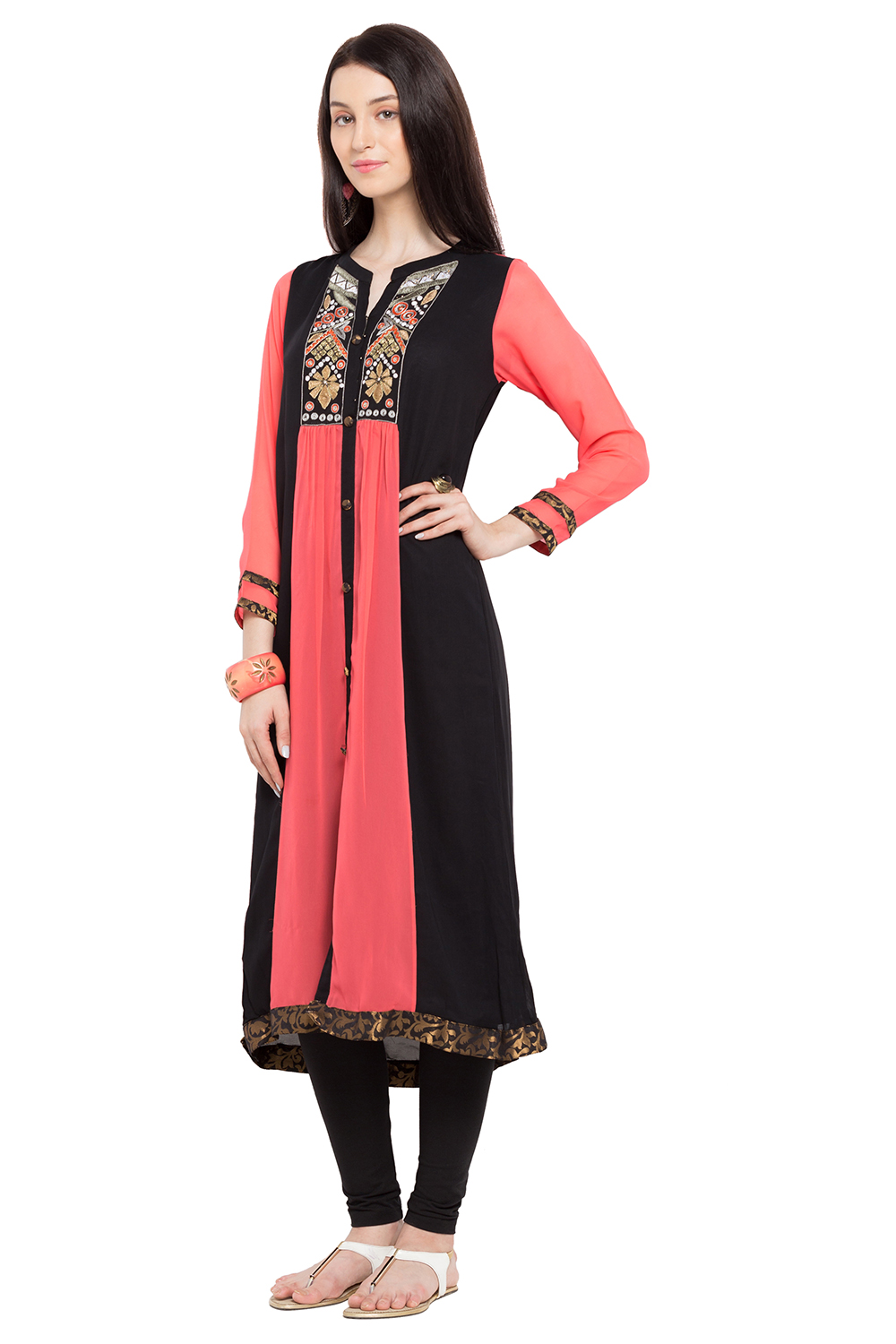 Coral Pink And Black Two Toned Kalidar Kurta With Embroidered Yoke And Buttons And Brocade Detailing In Hemline.