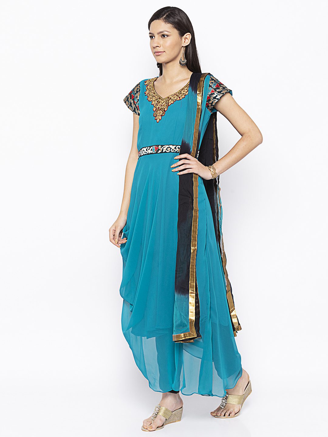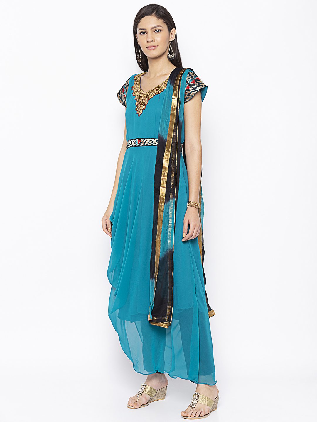 Nikhaar Creations Blue Embroidered Georgette Asymmetrical Trouser Kurta Dupatta