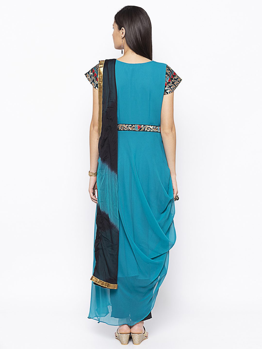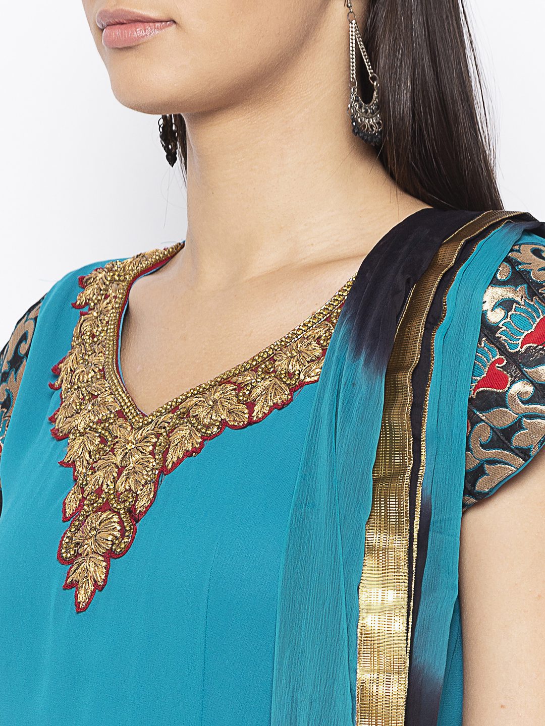 Blue Georgette A Symmetrical Draped Kurta With Hand Embroidered Zardozi Neckline ..Brocade Border Detailing On Short Sleeves And Bodyline Worn With Black Cigarette Pants And Black Shaded Chiffon Dupatta With Gold Border On All Sides.