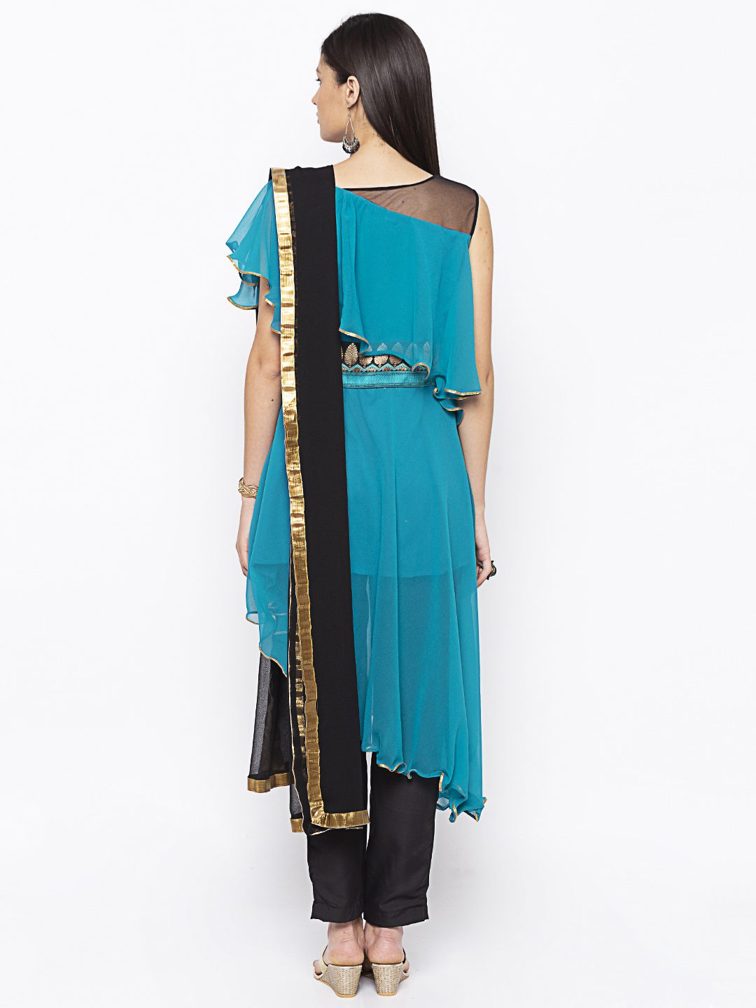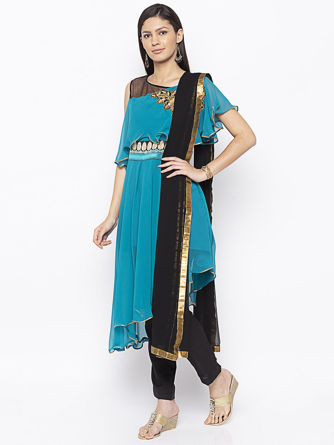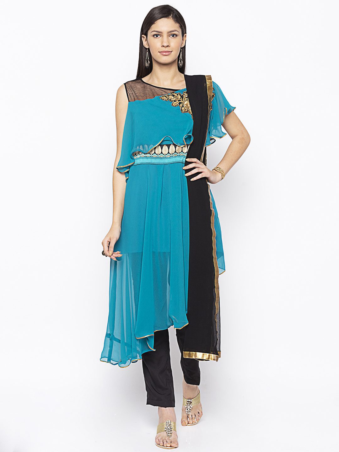 Turquoise Blue Asymmetrical Georgette Slightly Flared Kurta With Black Net See Through Effect On Shoulders ..Black Gold Resham Embroidery On Cape With Border On Waistband.. Gold Gota Patti Detailing On Cape And Asymmetrical Hemline Worn With Black Cigarette Pants And Black Chiffon Dupatta With Gold Tissue Around It.