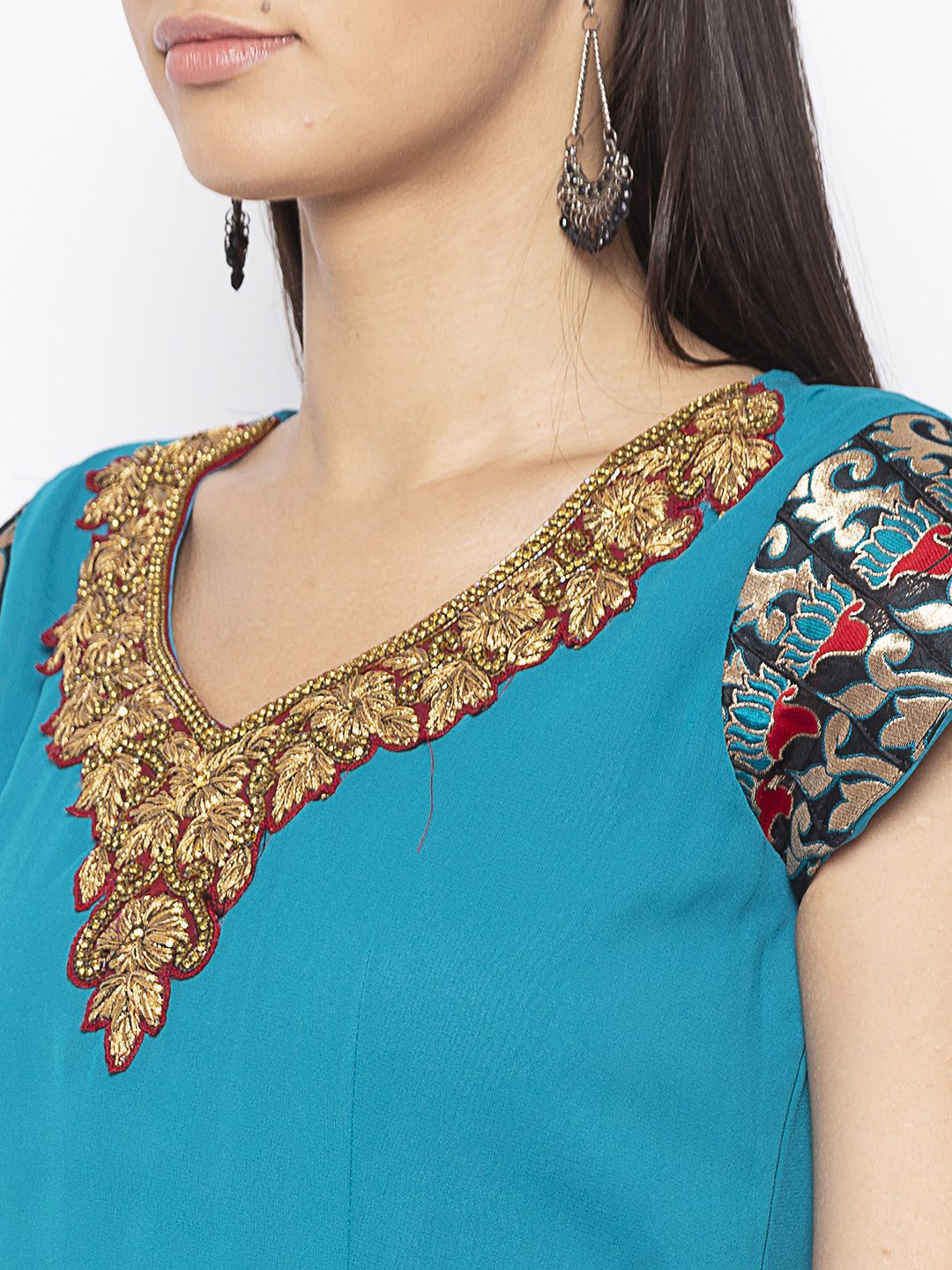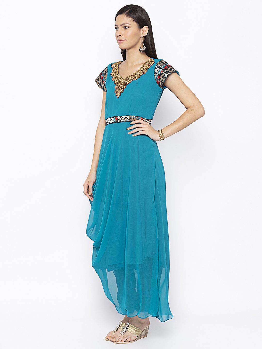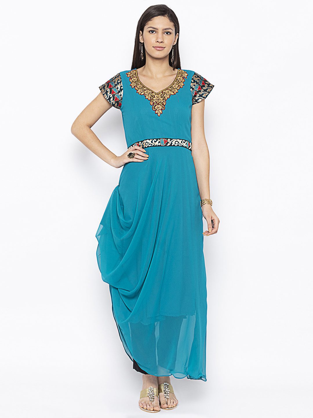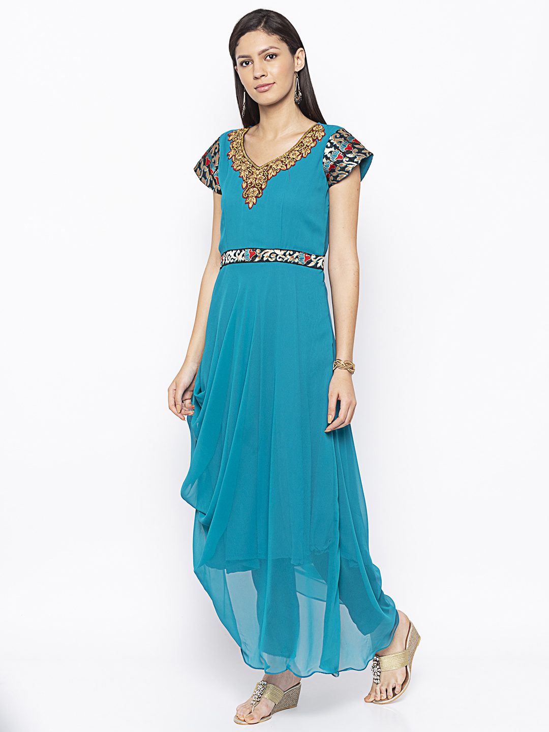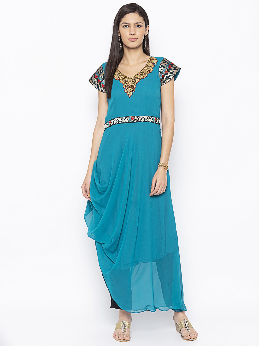 Blue Georgette A Symmetrical Draped Kurta With Hand Embroidered Zardozi Neckline ..Brocade Border Detailing On Short Sleeves And Bodyline Worn With Black Cigarette Pants.