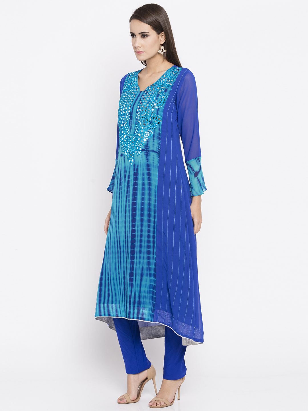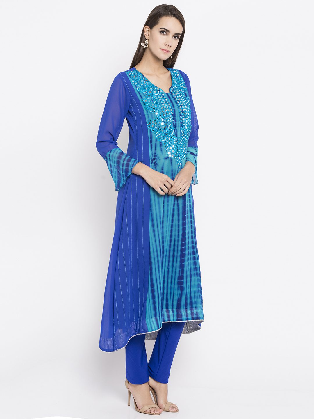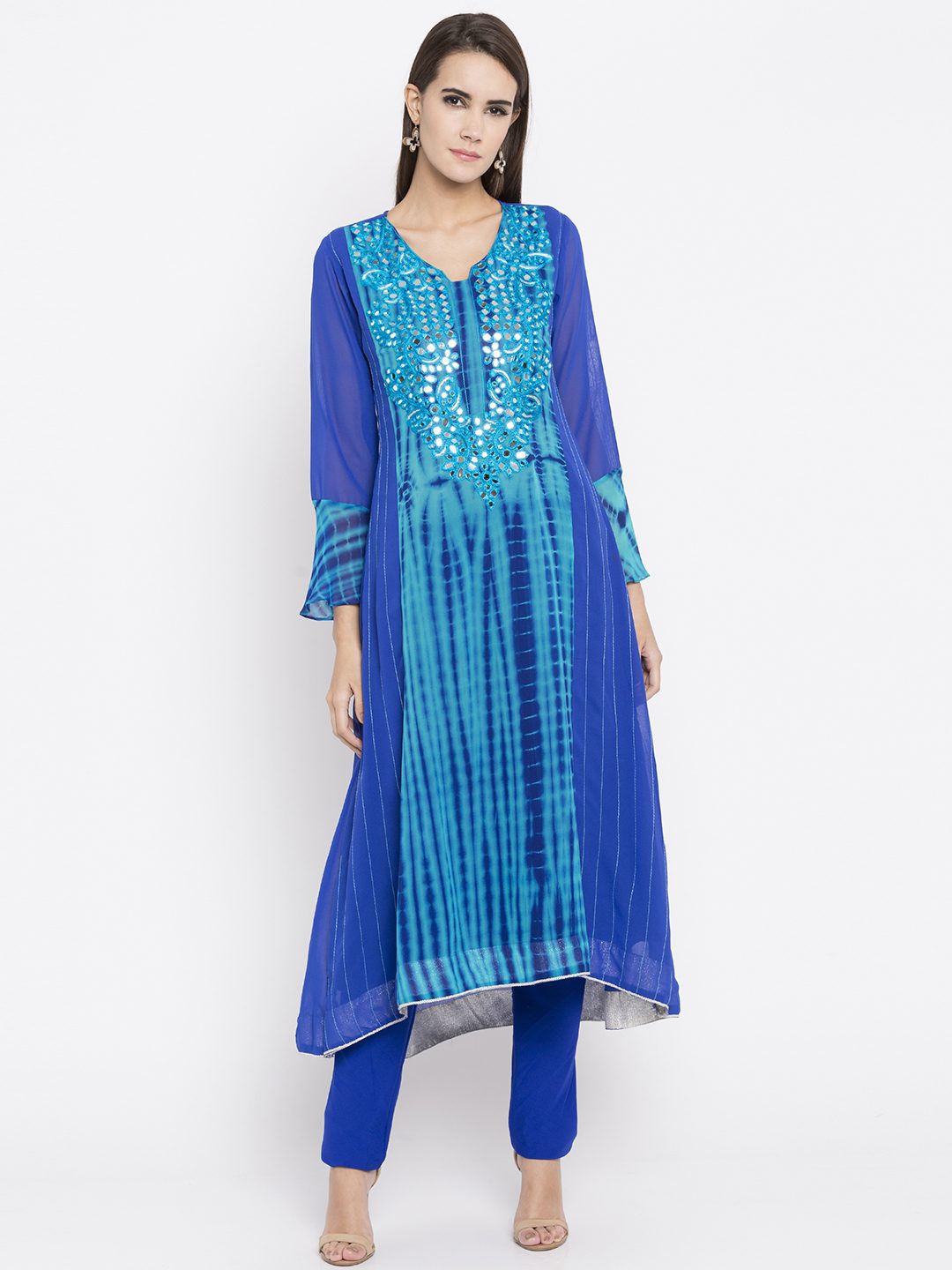 Blue flared readymade kameez in georgette designed with striking resham embroidery work at the yoke enhanced by sparkly mirror work and tie-dye print all over.