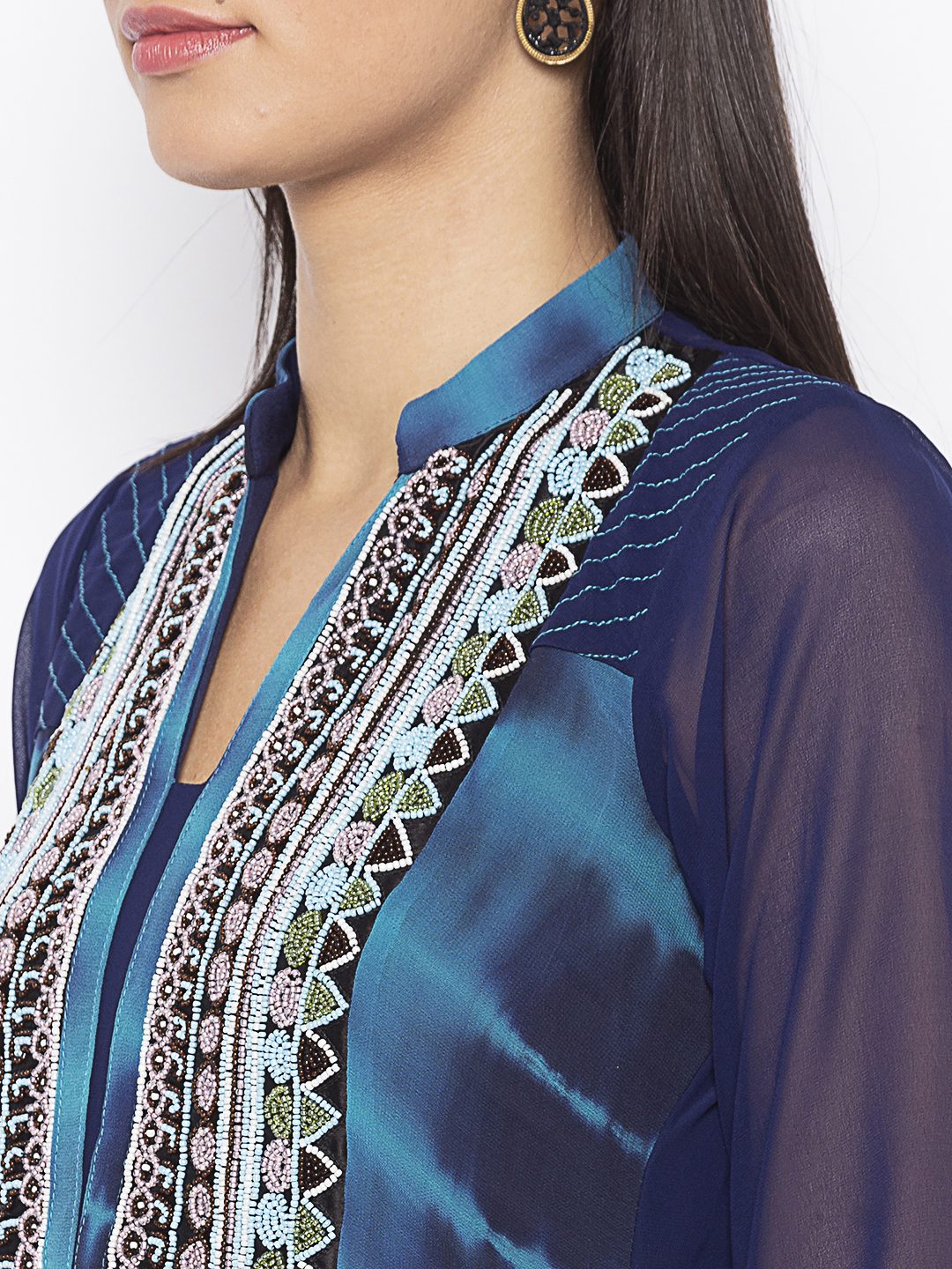 Navy Blue Shaded Tie-Dye Batik And Plain Georgette Combination A Line Kurta With Heavy Rice Pearls Hand Embroidery On Neckline Light Color Stitching Detail On Shoulders And Silver Lace On Hemline