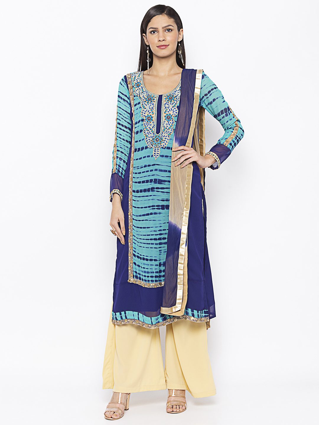 Nikhaar Creations Blue Embroidered Georgette Straight Trouser Kurta Dupatta