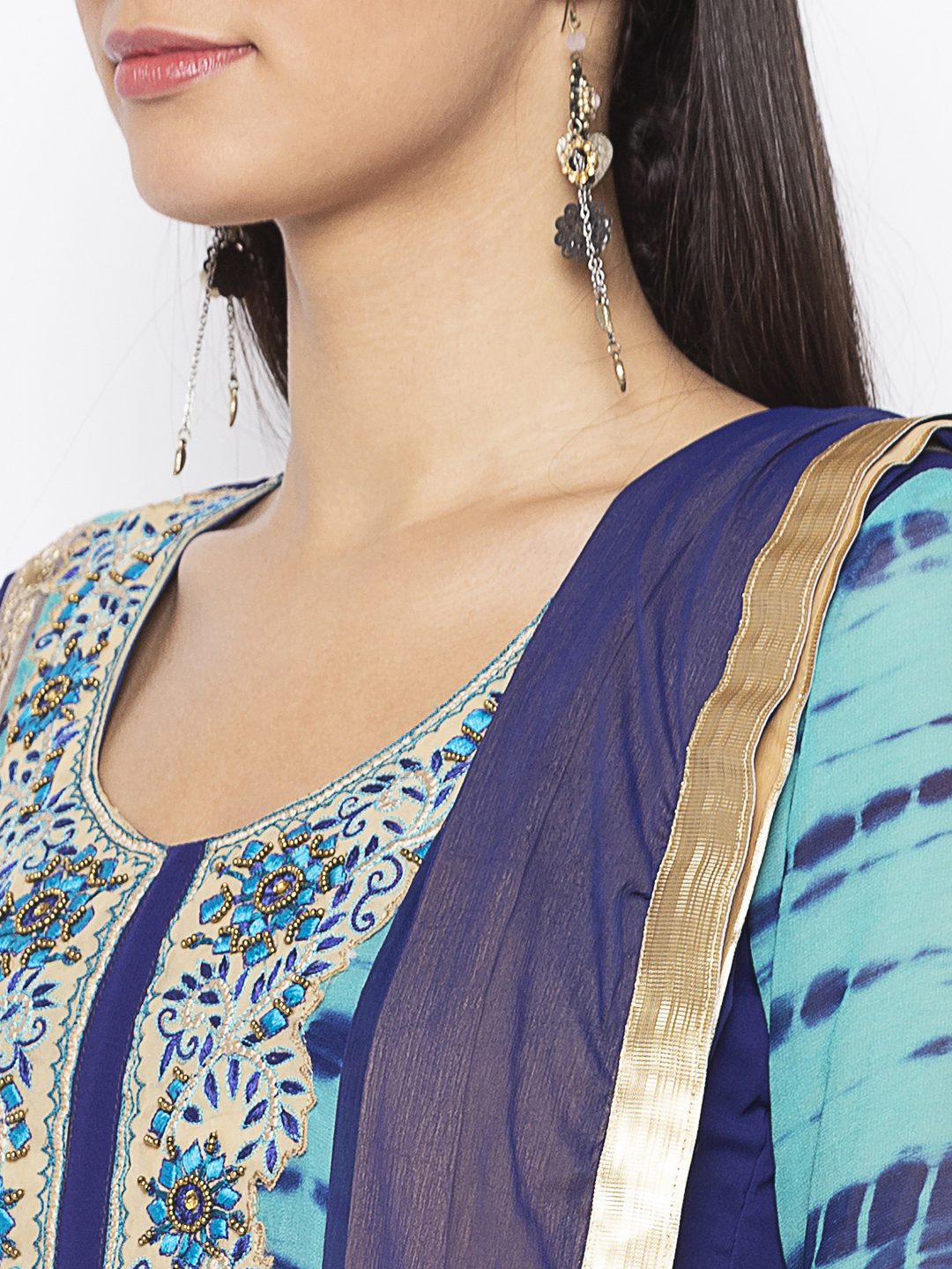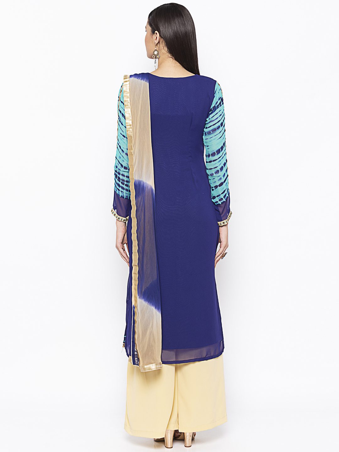 Midnight Blue Turquoise Blue Two Tone Tie Dye Batik Straight Cut Kurta With Hand Embroidered Yoke.. Embroidered Border On Front Panel And Centre Of Batik Full Sleeves. Worn With Beige Palazzo And Crème Blue Shaded Dupatta With Borders On All Sides.