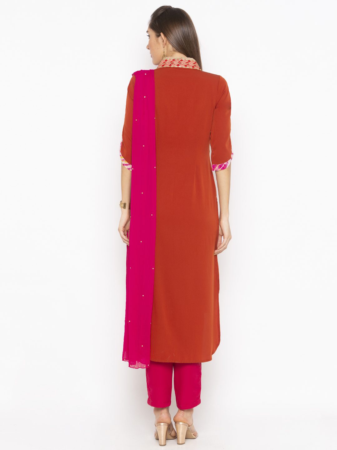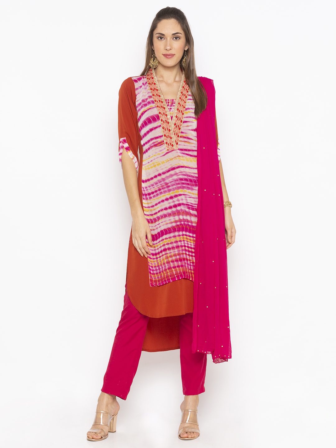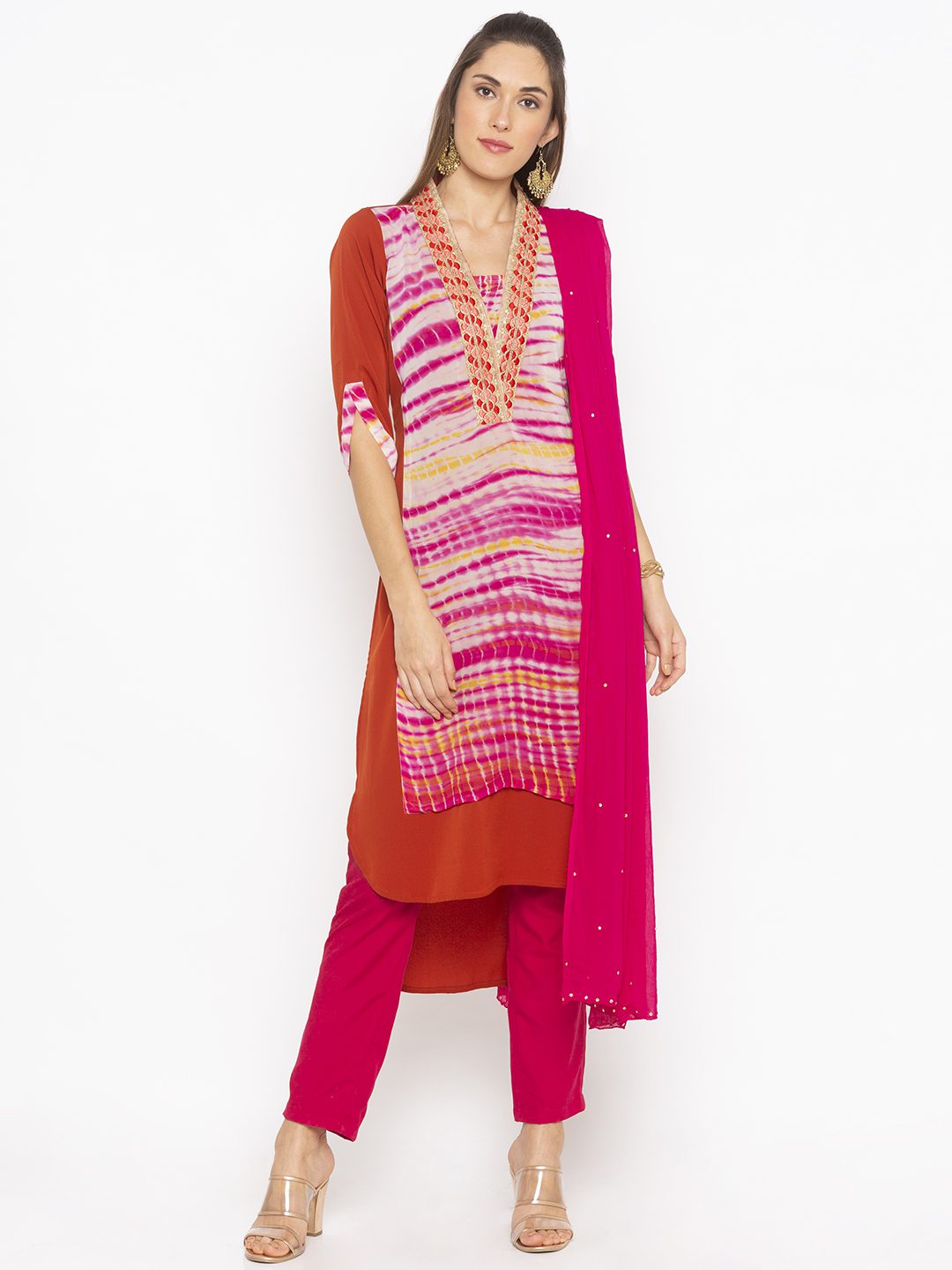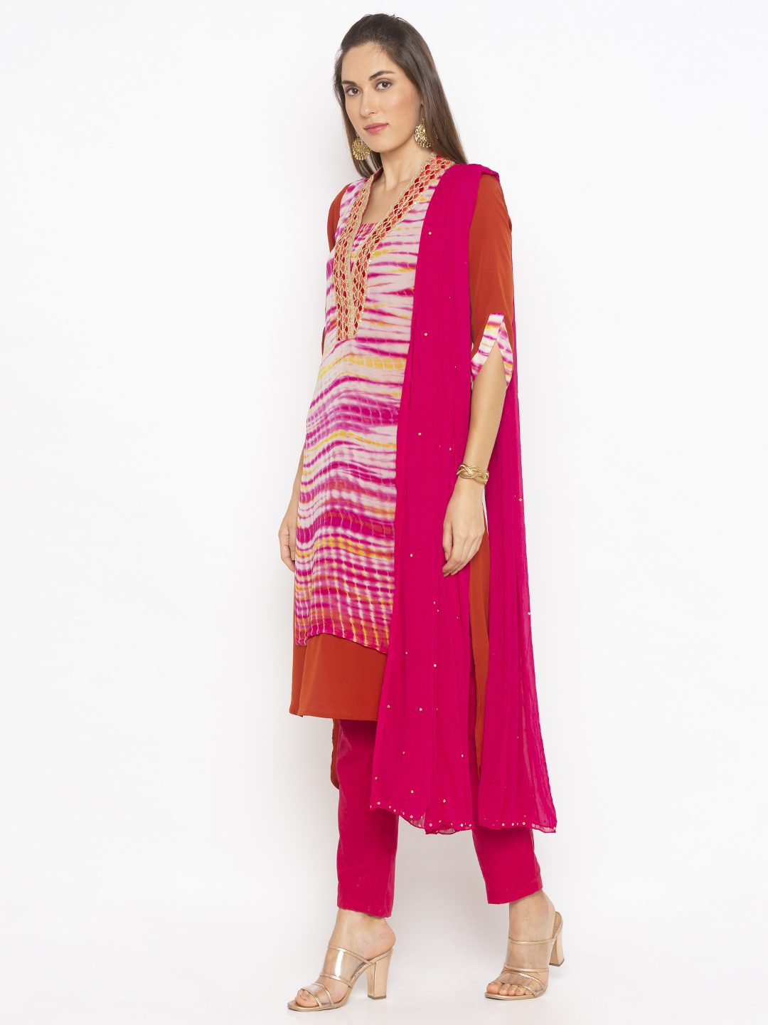 Rust american Crepe Kurta With Lehariya Batik Shaded Centre Panel With Embroidered Border On Shawl Collar And Shaded Detailing On Three Quarter Sleeves Worn With Pink Cigarette Pants And Pink Chiffon Dupatta With Diamantes On It.