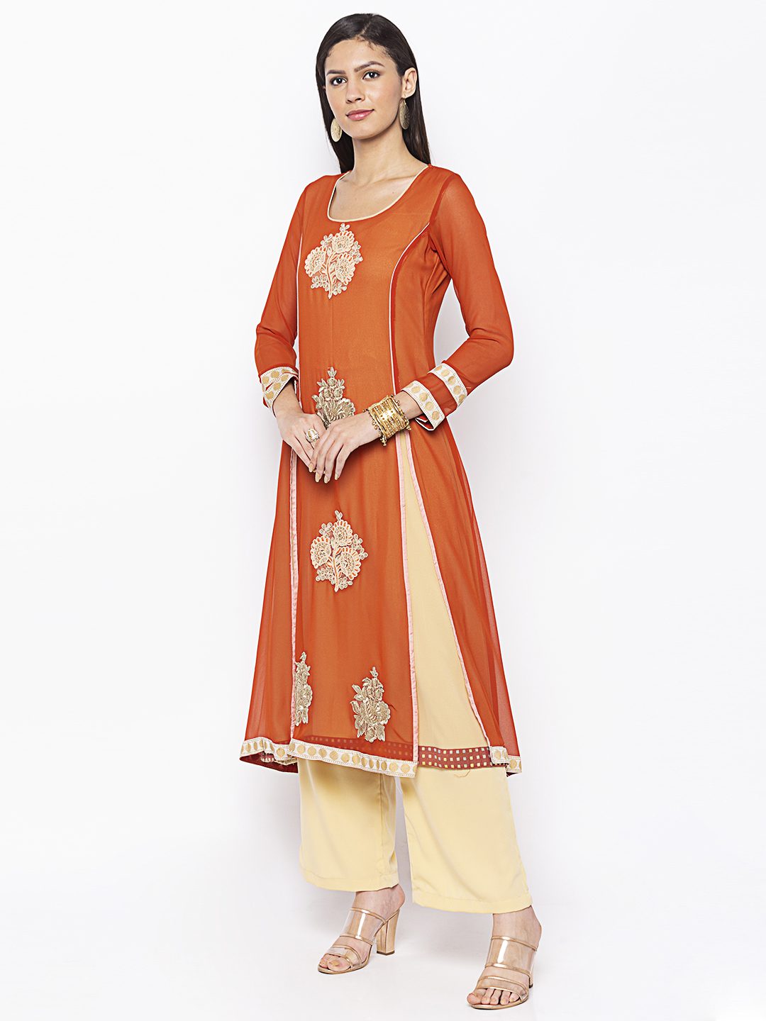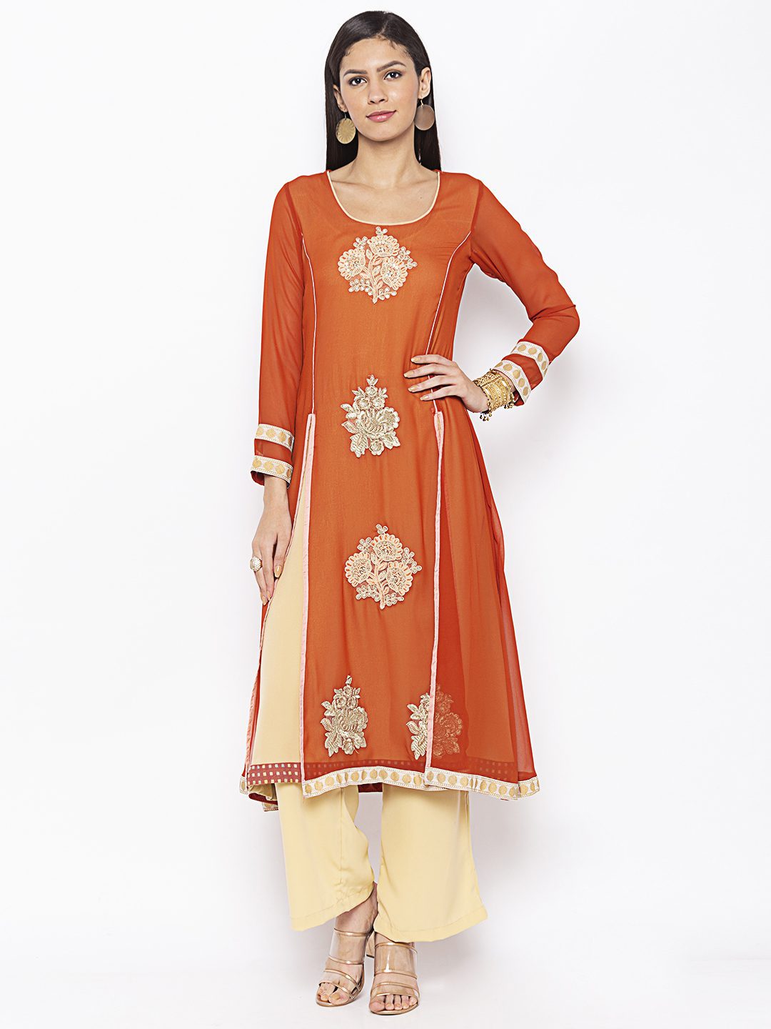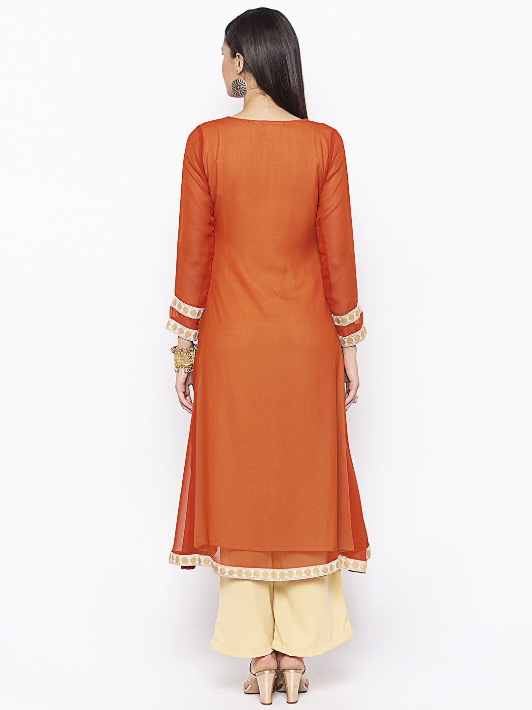 Rust Georgette Princess Cut Kurta Beige Piping Detailing On Princess Panels Embroidered Motifs All Over In The Front Embroidered Borders On Three Quarter Sleeves And Slitted Hemline With Print Detailing On The Crepe Lining Worn With Beige Culottes.