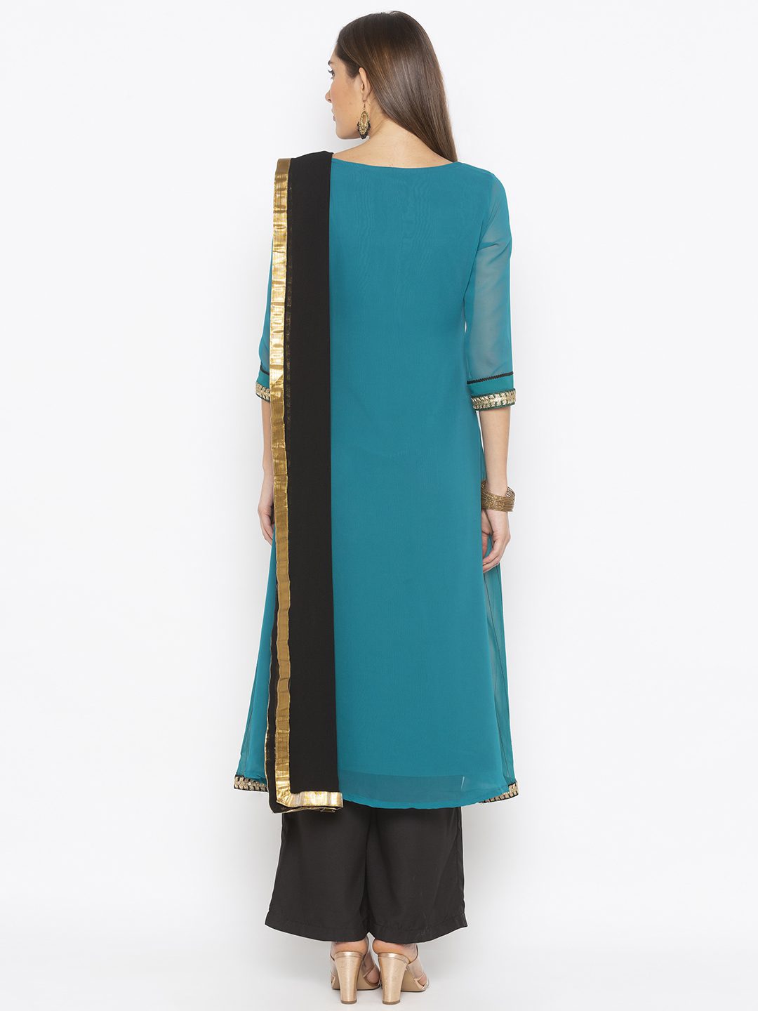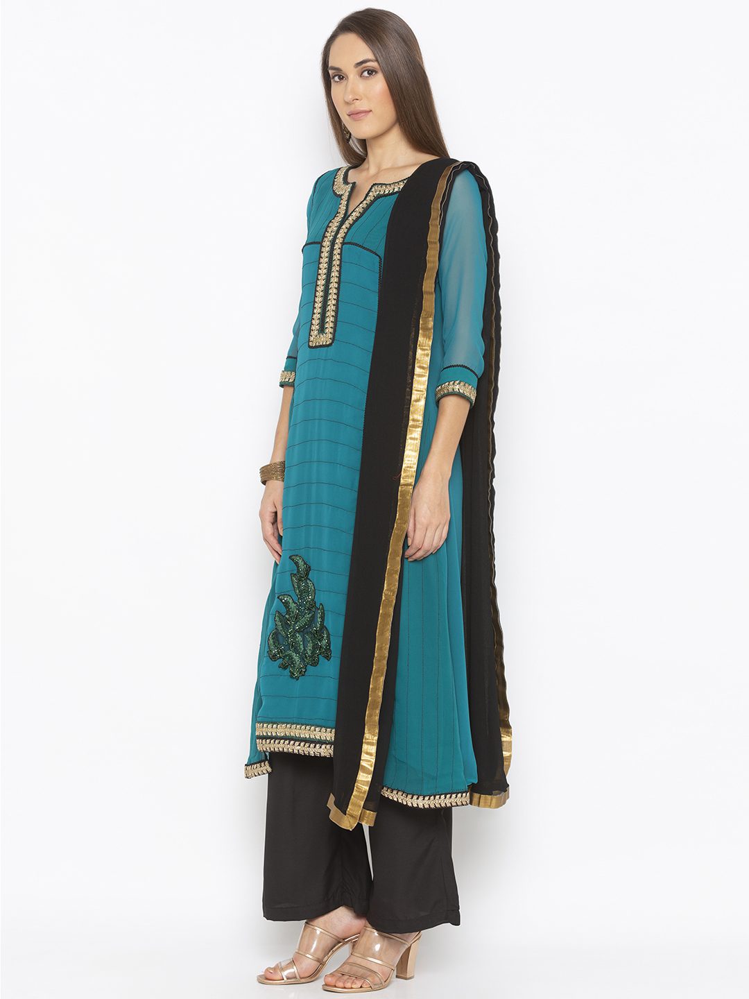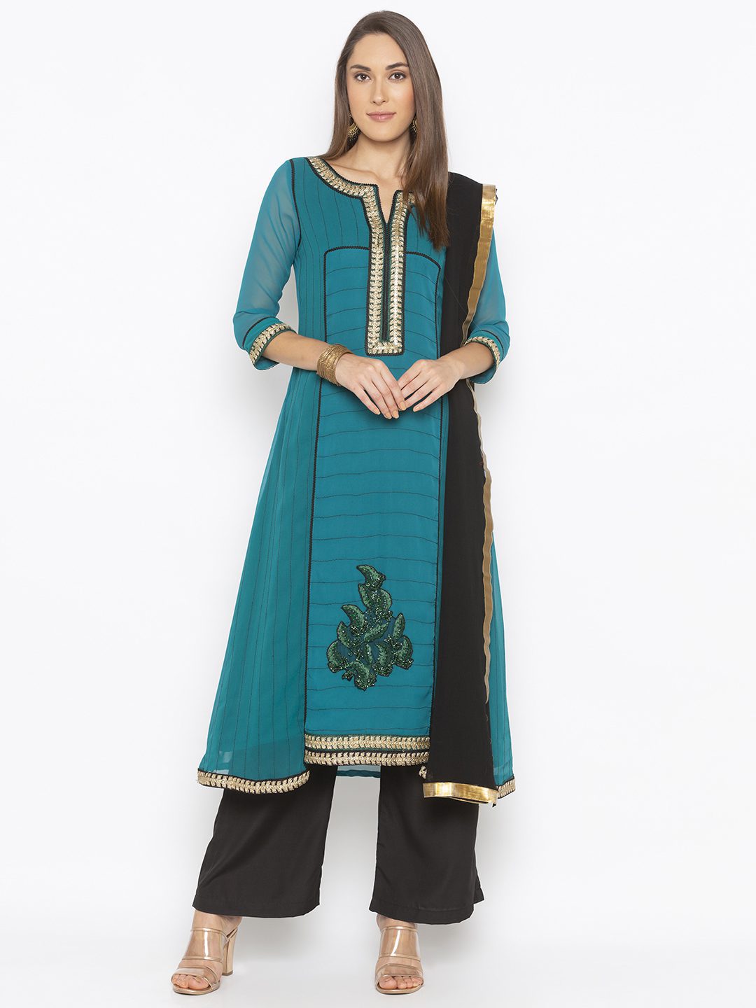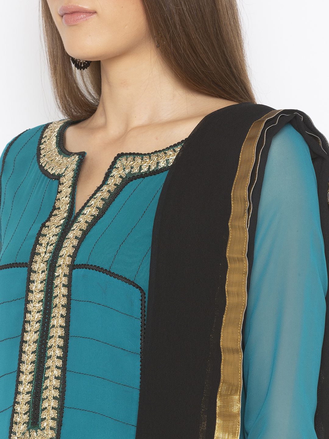 Turqoise Blue Green Double Colored Georgette A Line Kurta With Black Stitching Detail In The Front And Gold Zardozi Embroidery Around The Neck And Button Patti Black Cord Detailing All Around The Front And Embroidery And Hand Embroidered Swarovski Crystal Motif In The Ghera With Gold Embroidery In The Sleeves And Ghera Worn With Black Culottes And Black Chiffon Dupatta.
